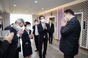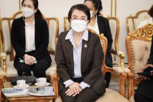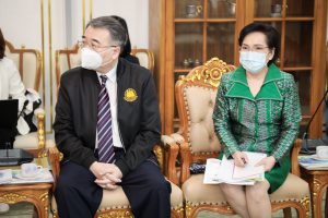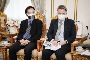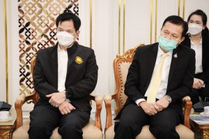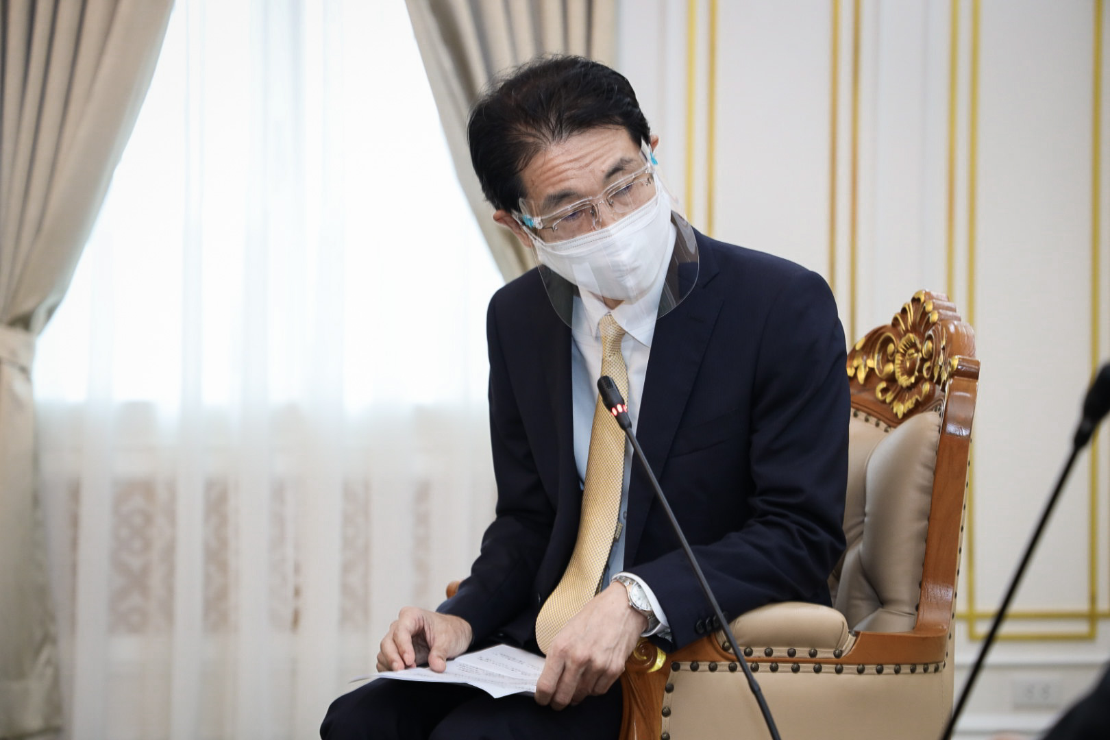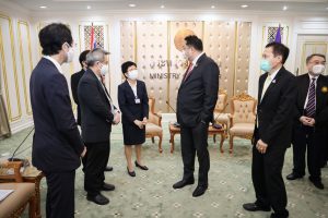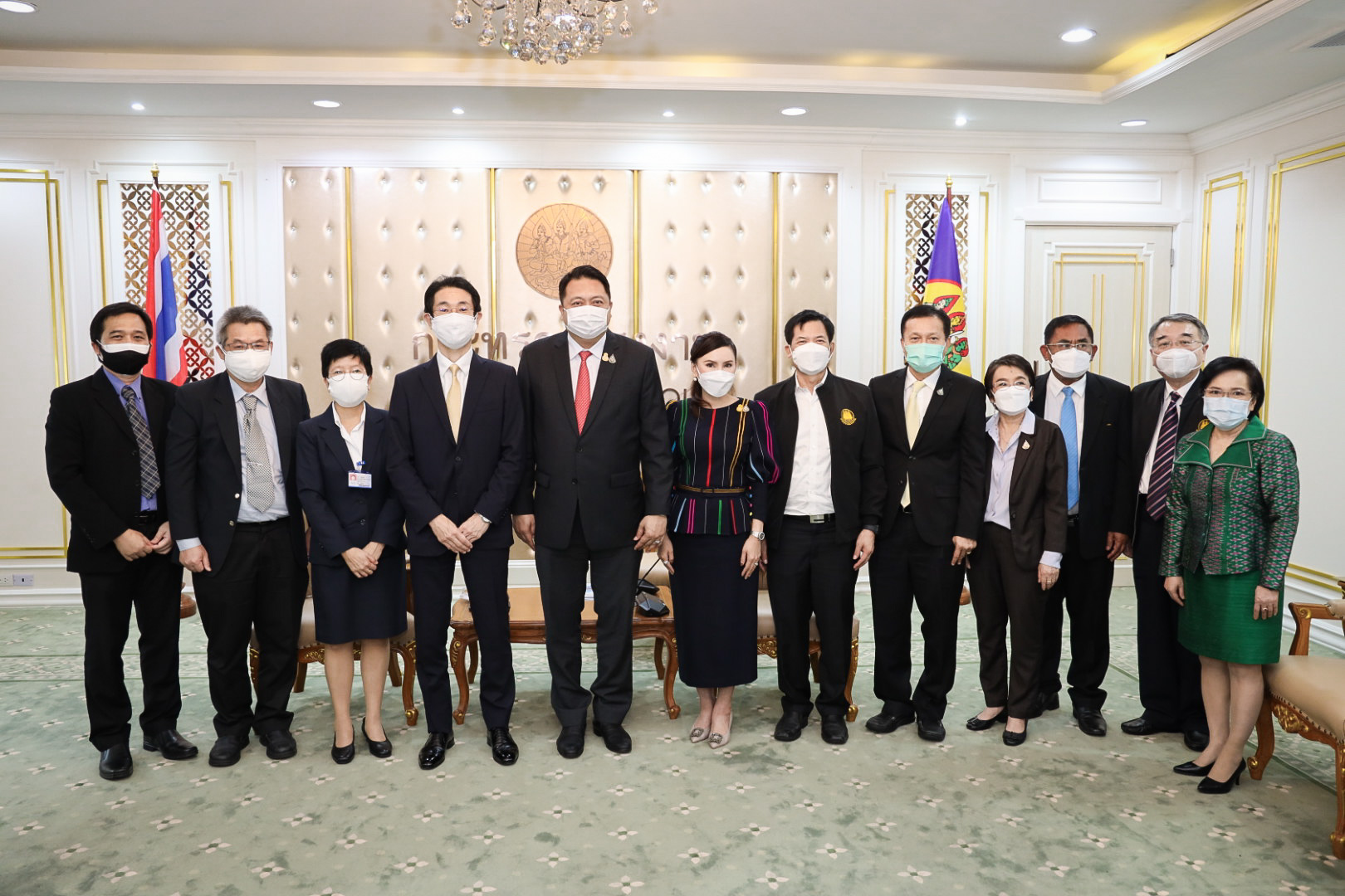 On August 25, 2021, at 14.00 hours, Labour Minister Mr. Suchart Chomklin welcomed Mr. Tetsu Shiozaki, President of Southeast Asia for NMB-Minebea Thai Co., Ltd., and delegation, who requested to meet and discuss the allocation of vaccines for employees. Advisor to the Labour Minister Mrs. Thiwalrat Angkinan, the Labour Minister’s Secretariat Mr. Suthep Chitvong, the Ministry of Labour’s Spokesperson (on politics) Mrs. Theanrat Nawamawat, Permanent Secretary of Labour Mr. Suthi Sukosol, and the Ministry of Labour’s senior executives also participated in this event at the Chatumongkol Room, 6th floor, Ministry of Labour.
