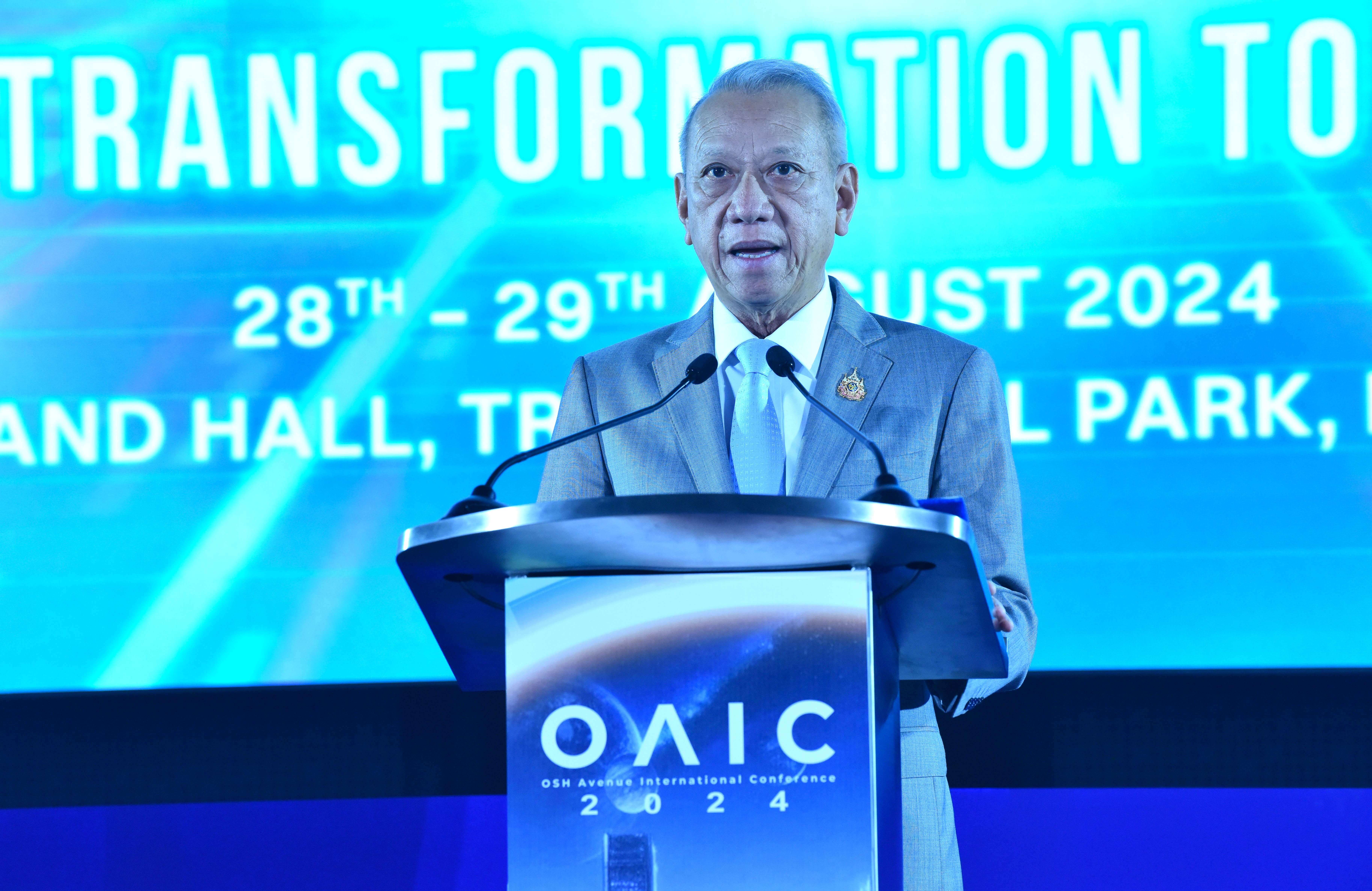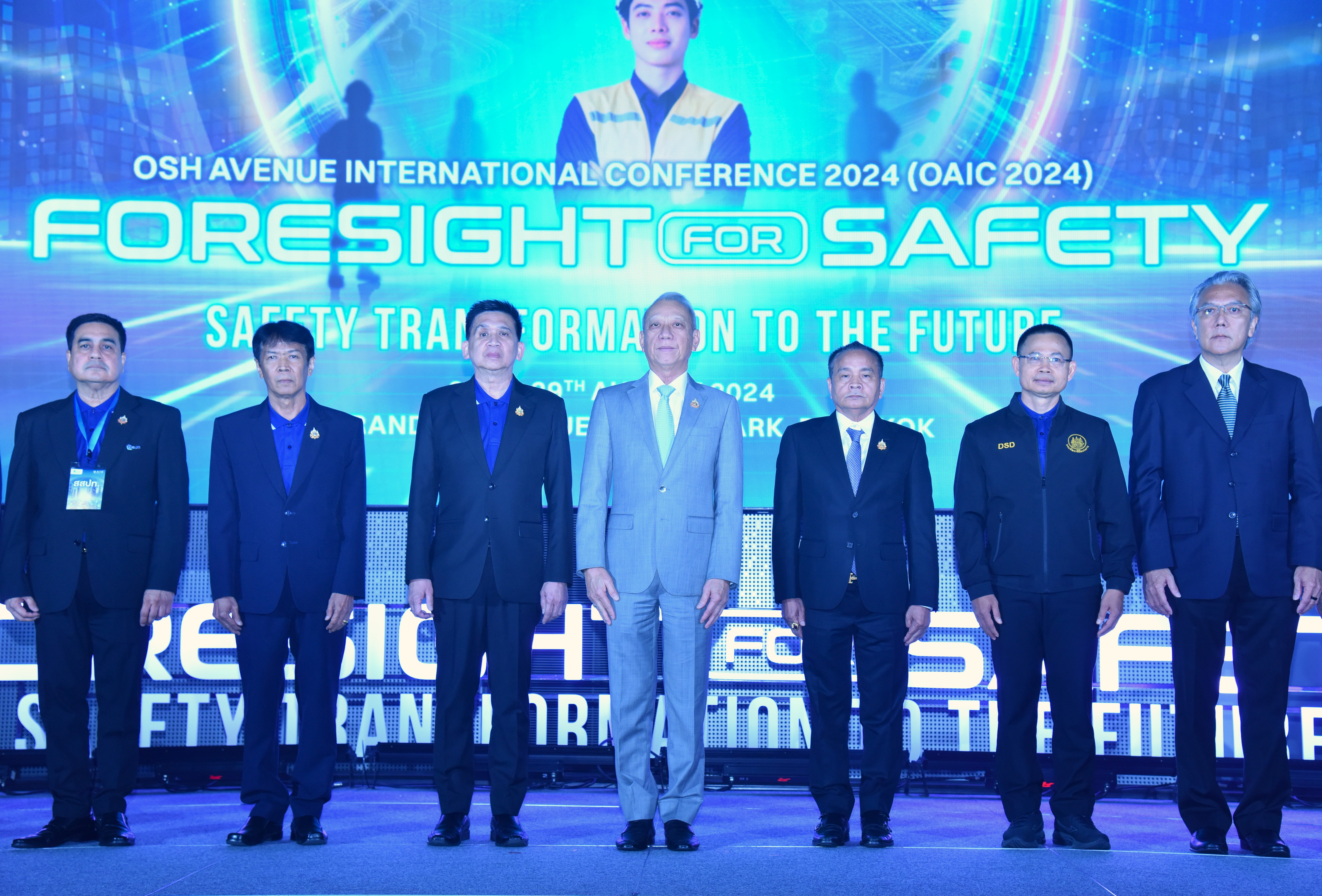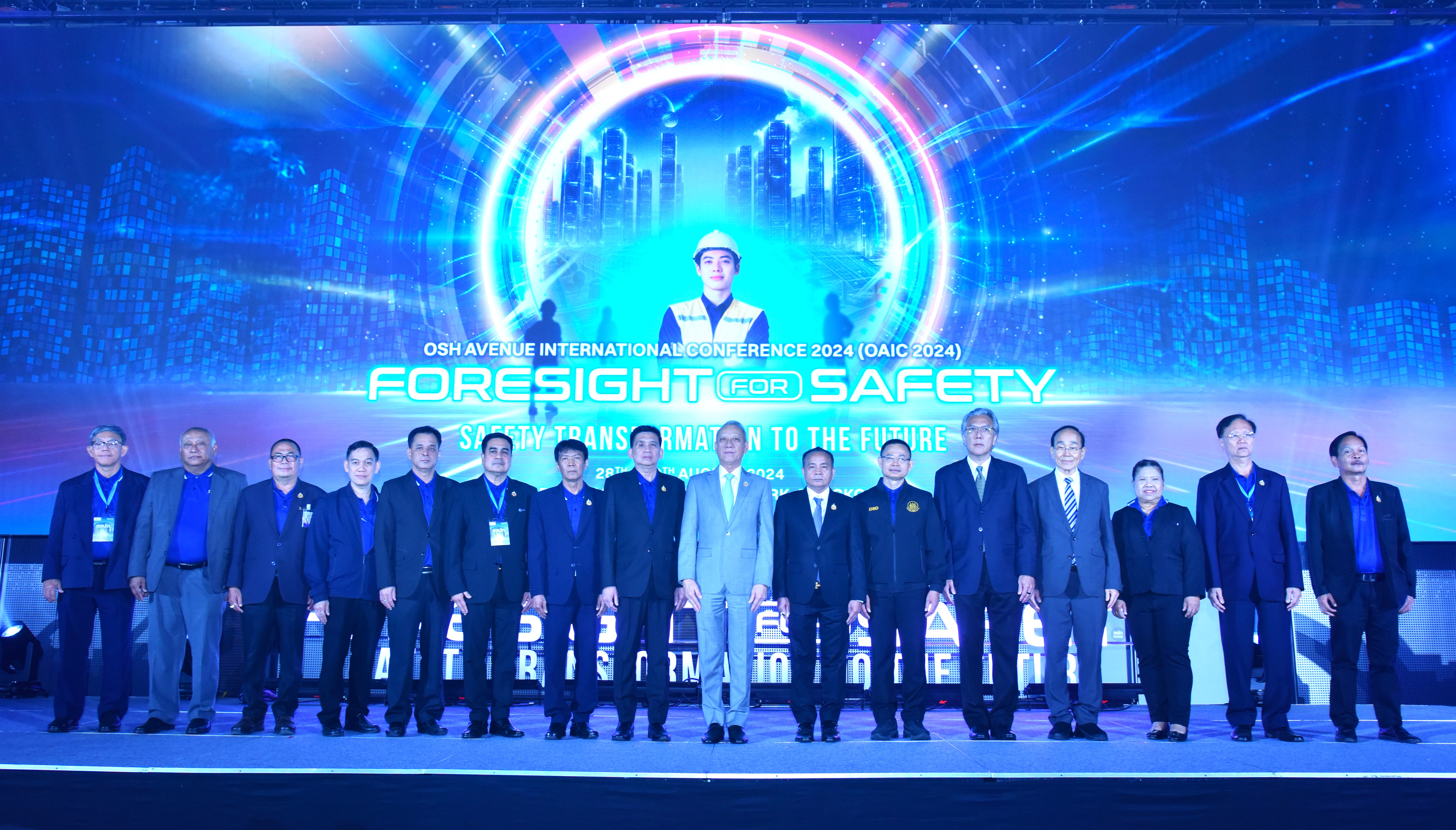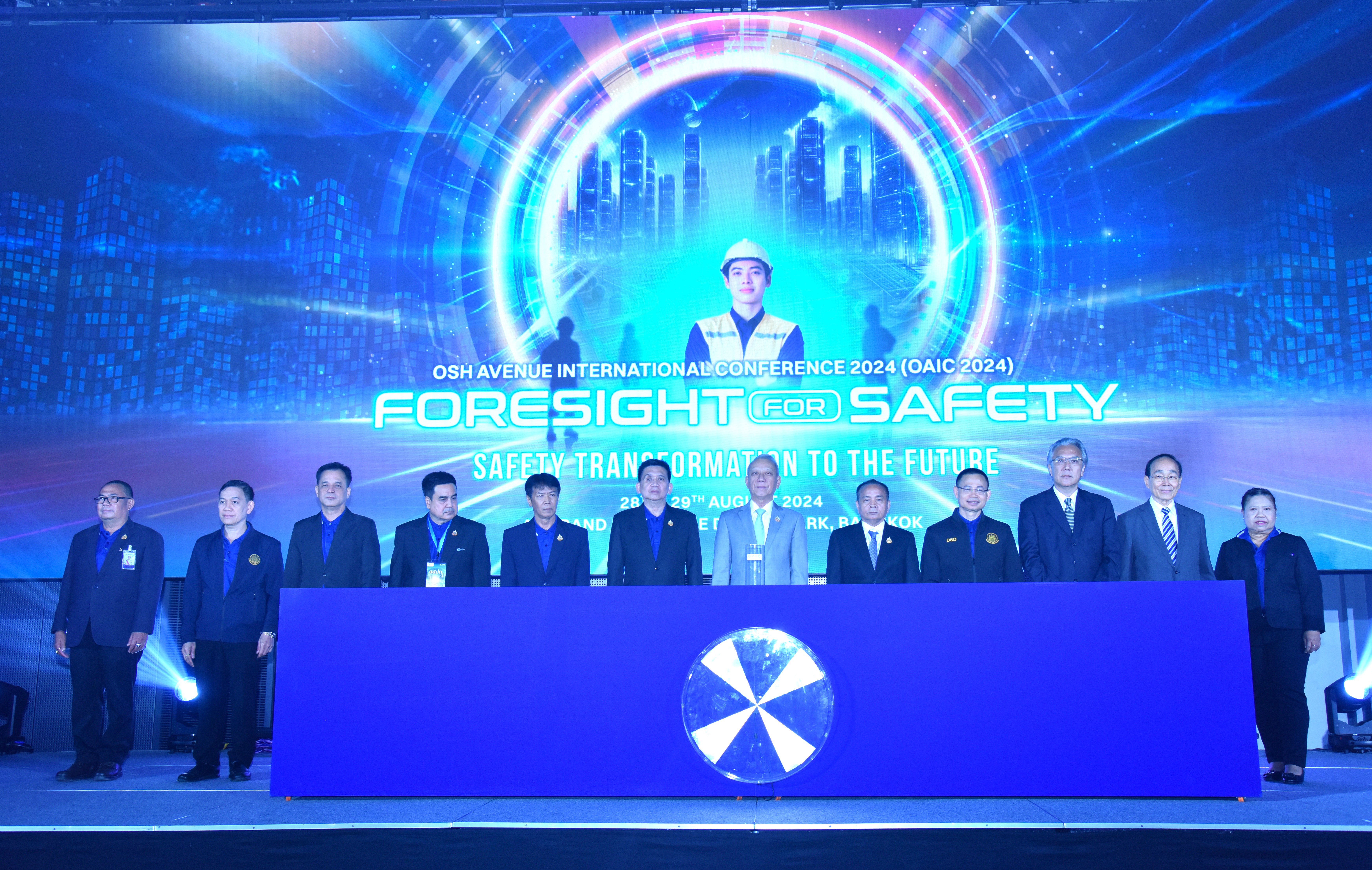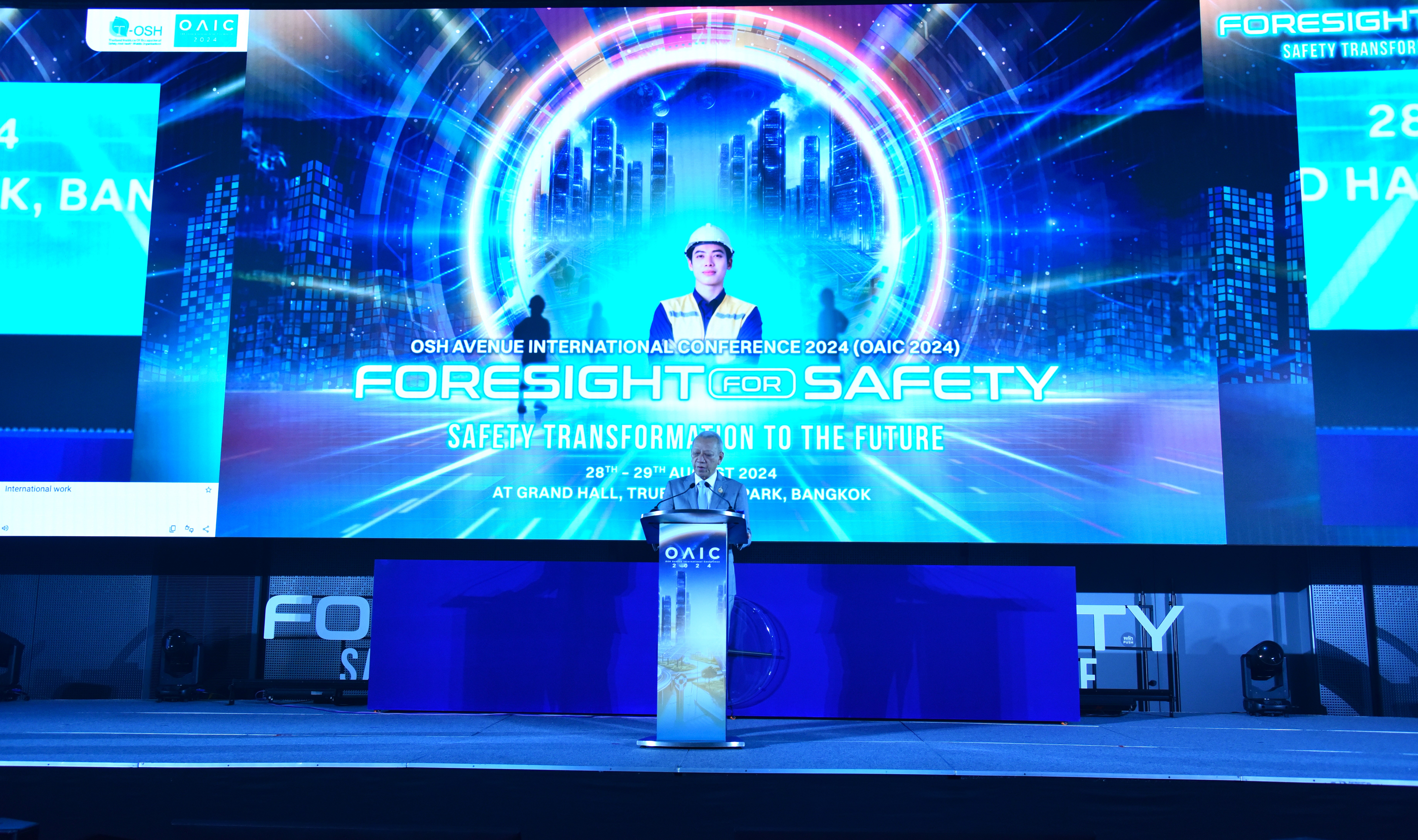 On August 28, 2024, at 13.00 hours, the Labour Minister, Mr. Phiphat Ratchakitprakarn, chaired the OSH Avenue International Conference 2024 (OAIC 2024) under the concept of “Foresight for Safety; Safety Transformation to The Future.” The Secretariat to the Labour Minister, Mr. Aree Krainara, the Permanent Secretary of Labour, Mr. Pairoj Chotikasathien, the Director of the Thailand Institute Of Occupational Safety And Health (Public Organization), Mr. Nantachai Panyasurarit, the Ministry of Labour’s executives, labour ambassadors from three countries, namely Cambodia, Laos, and Myanmar, safety organizations from Hong Kong, Japan, Korea, and Singapore, and safety networks from the government sector, private sector, state enterprises, as well as attendees and the media welcomed them at True Digital Park Grand Hall, Bangkok.