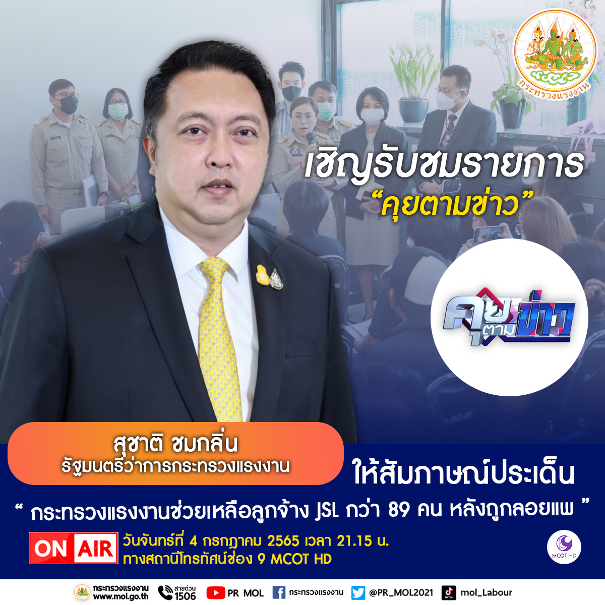Today (July 4, 2022), at 14.00 hours, the Labour Minister, Mr. Suchart Chomklin, recorded an interview on the”Kuy Tam Kao” program about the Ministry of Labour’s support for over 89 JSL employees after being laid off. The interview took place via ZOOM at the Labour Minister’s meeting room, 6th floor, Ministry of Labour. The interview will be broadcasted today at 21.15 hours on Channel 9 MCOT HD.