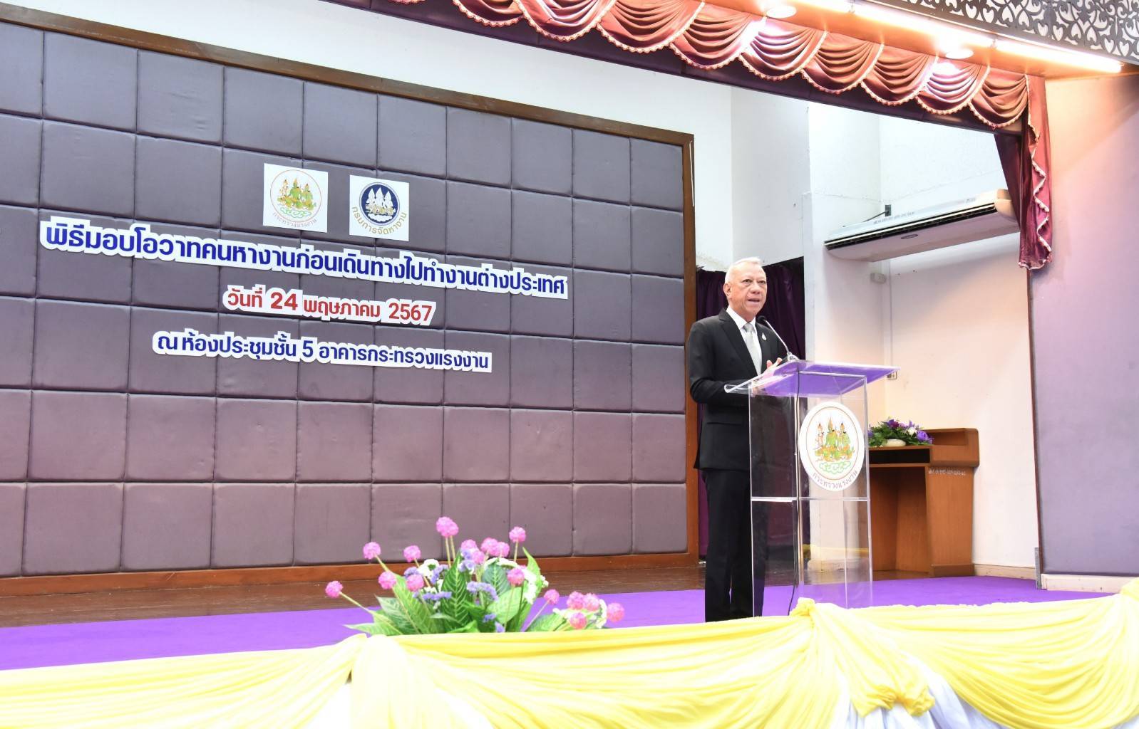On May 24, 2024, at 09.00 hours, the Labour Minister, Mr. Phiphat Ratchakitprakarn, presided over an address to 126 Thai workers who will travel to work in Taiwan and Japan. The Secretariat to the Labour Minister, Mr. Aree Krainara, from the Prime Minister’s Secretariat’s Office, Mr. Phuchong Worasri, the Permanent Secretary of Labour, Mr. Pairoj Chotikasathien, and the Ministry of Labour’s executives joined the occasion at the Ministry of Labour’s meeting room, 5th floor, Ministry of Labour.