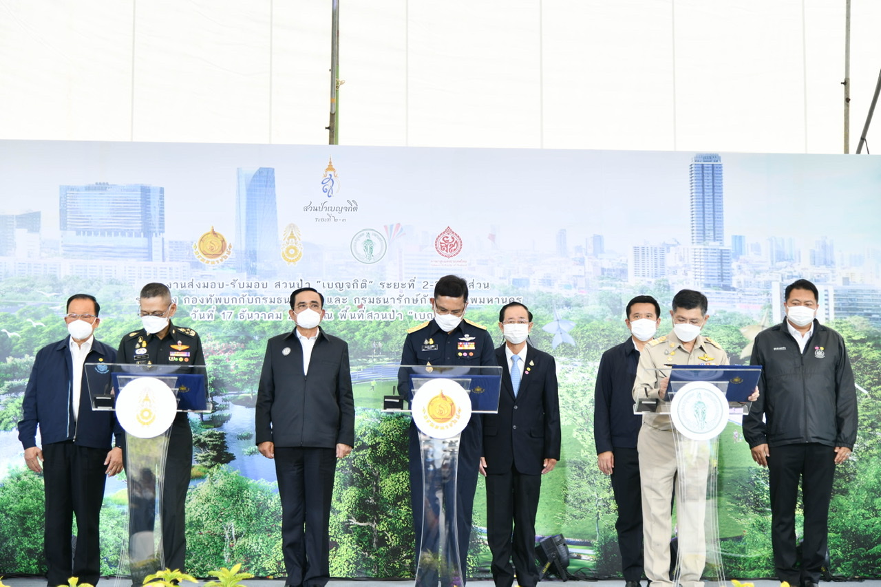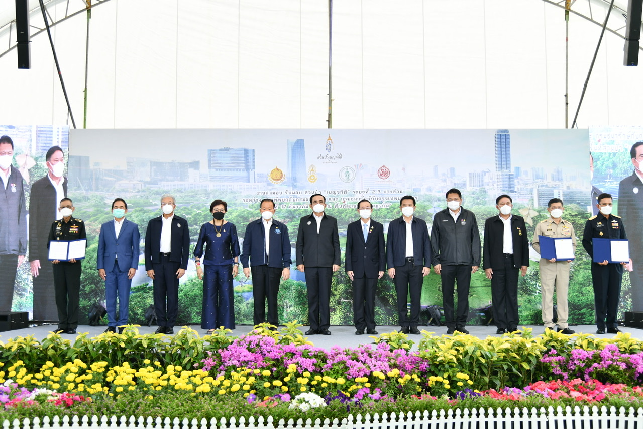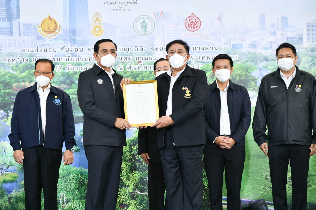 Today (December 17, 2021) at 09.00 hours, Prime Minister and Minister of Defence General Prayuth Chan-ocha and Labour Minister Mr. Suchart Chomklin joined as witnesses the signing of the memorandum of handing over some parts of the “Benjakitti” forest park phase 2 and 3, between the Royal Thai Army and the Treasury Department, and the Treasury Department and the Bangkok Metropolitan Administration. The Royal Thai Army has completed the construction of construction site one, which has an area of approximately 160 rai, one ngan, 76 square wa. The representatives of all three units consisted of 1) the Royal Thai Army, General Siripoj Rampaikul, Chairman of the Advisory Board of the Royal Thai Army, 2) the Treasury Department, Mr. Praphas Kong-iad, Director-General of the Treasury Department, and 3) Bangkok Metropolitan Administration, Khachit Chatchavanich, Permanent Secretary of the BMA. The three parties signed the memorandum of handing over and receiving some parts of the “Benjakitti” forest park phase 2 and 3. The Prime Minister handed over a letter of authorization to use the royal property to the Bangkok Metropolitan Administration.