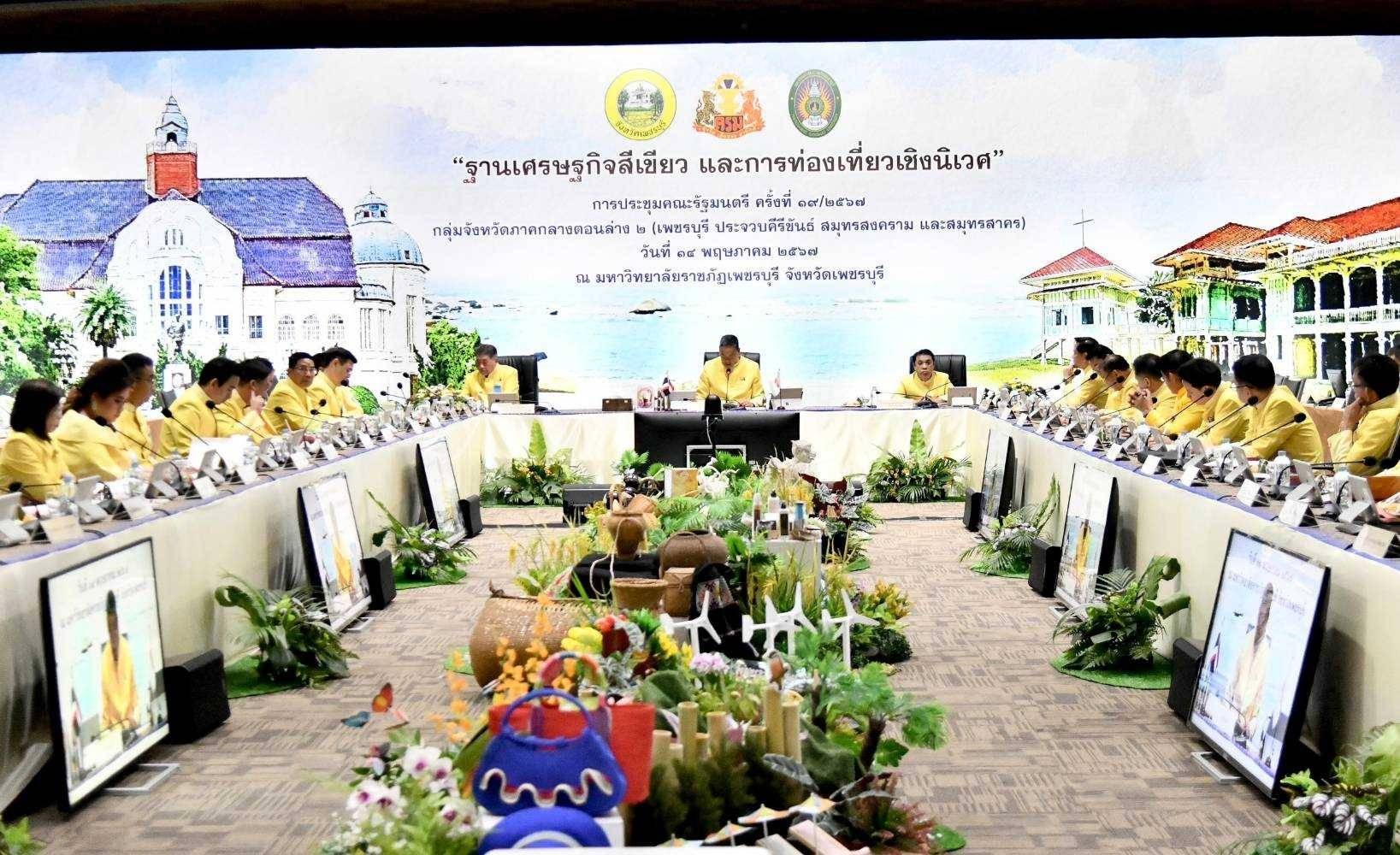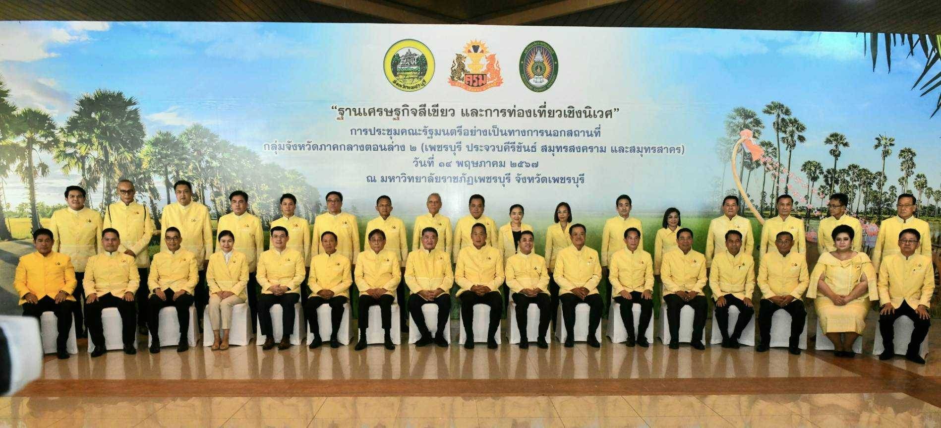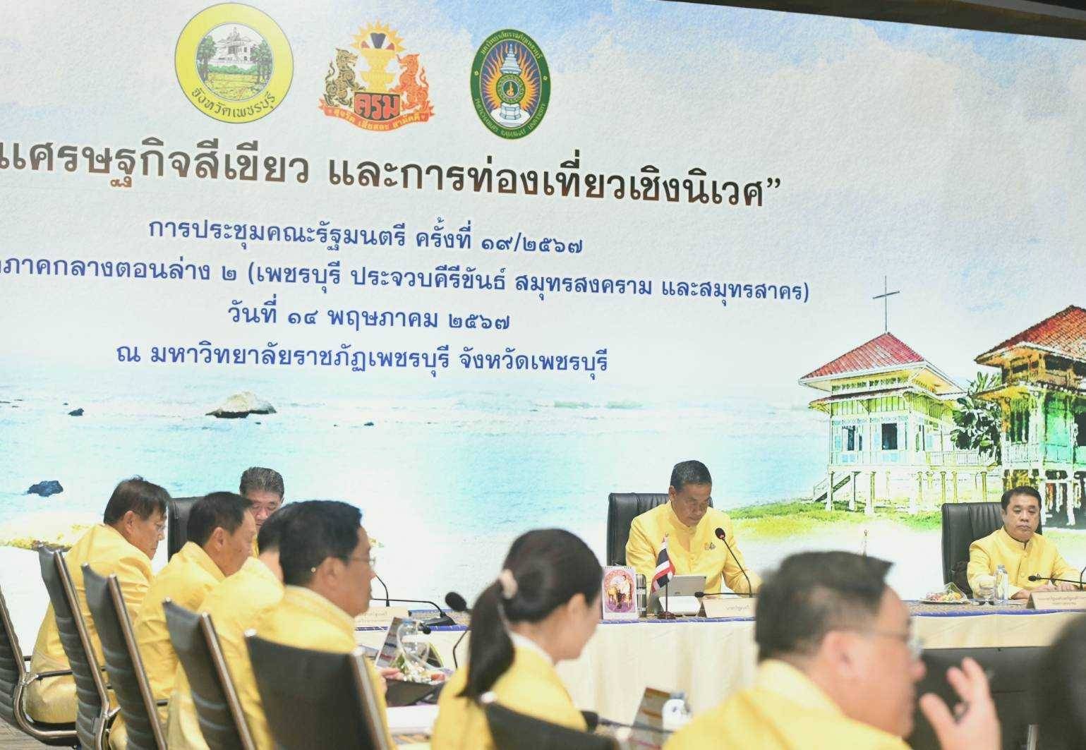 On May 14, 2024, at 09.30 hours, the Labour Minister, Mr. Phiphat Ratchakitprakarn, participated in the Cabinet’s Official Offsite Meeting No. 3/2024 on “Green Economy Base and Eco-Tourism” in the Lower Central Province Group 2 (Prachuap Khiri Khan, Phetchaburi, Samut Songkhram and Samut Sakhon). The Prime Minister, Mr. Srettha Thavisin, presided over the meeting. Before the Cabinet meeting, the Prime Minister and the Cabinet visited various exhibitions. The Ministry of Labour’s Inspector-General, Mrs. Marasri Jairangsi, and heads of government agencies under the Ministry of Labour in Phetchaburi Province joined in the welcome at the Phanom Kaew Kamnerd meeting room, 2nd floor, Sumet Tantivejkul Building, Phetchaburi Rajabhat University, Na Wung Subdistrict, Mueang Phetchaburi District, Phetchaburi Province.