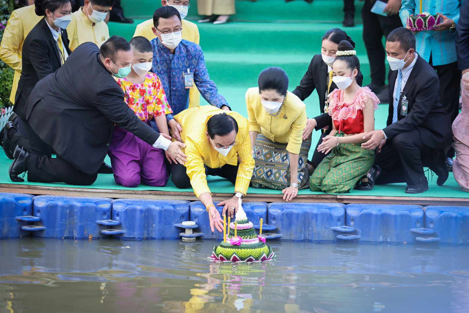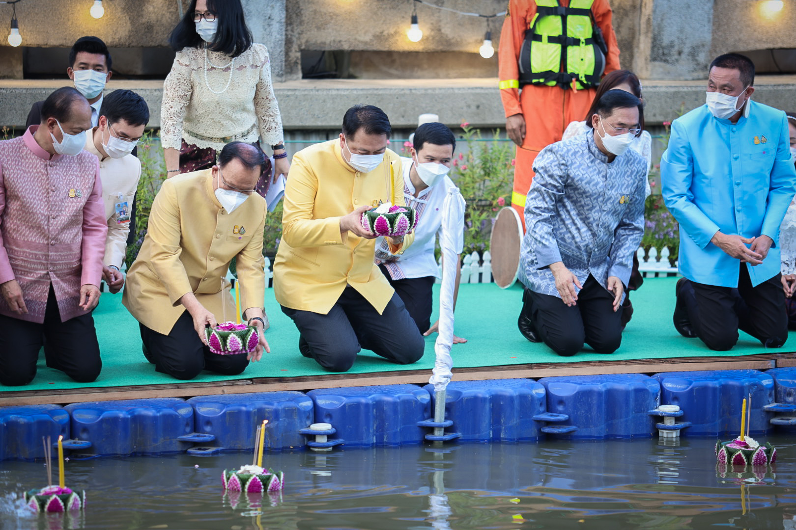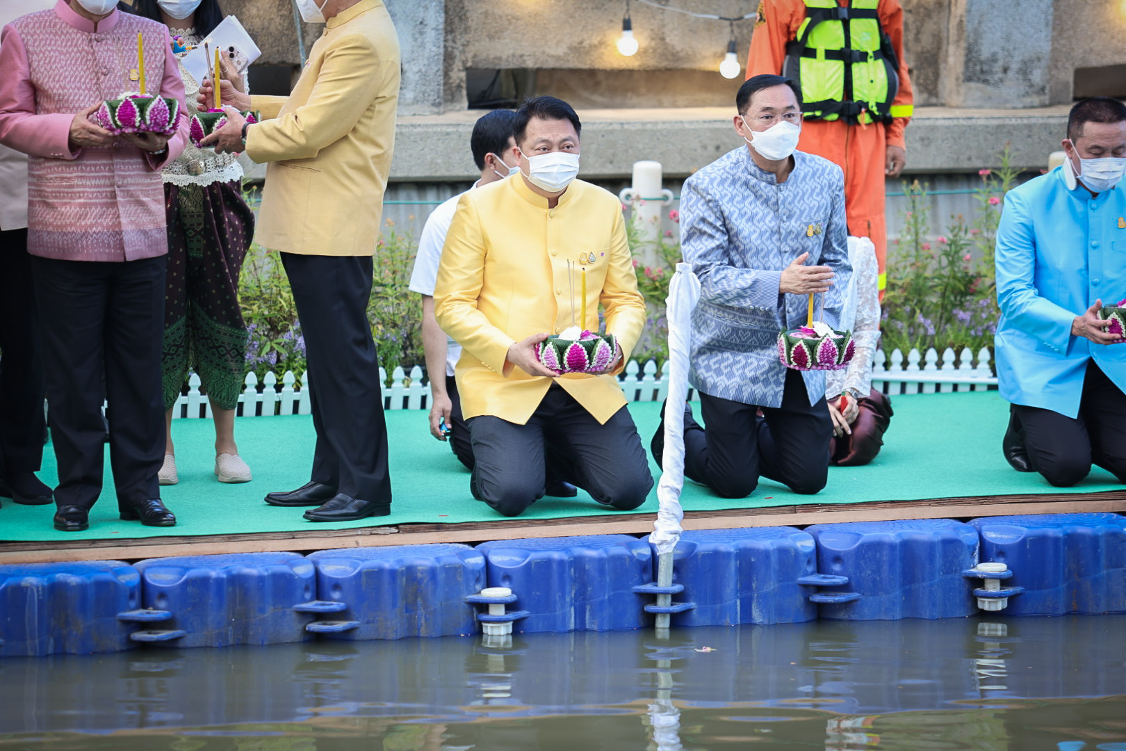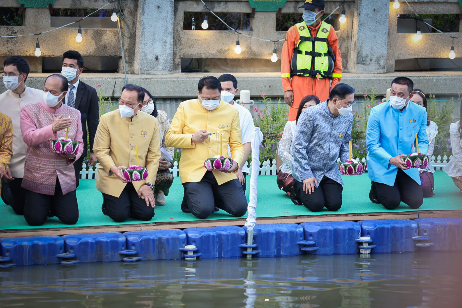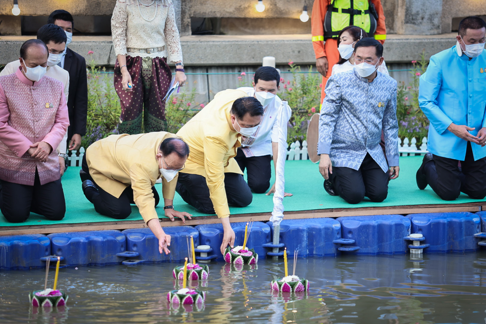 On November 19, 2021, at 16.30 hours, Labour Minister Mr. Suchart Chomklin joined the “Loy Krathong the new way: Continuing Thai traditions with one family and 1 Krathong, keeping distance and wearing hygiene masks to stay disease-free and safe”. Prime Minister and Minister of Defense General Prayuth Chan-ocha and his wife, Mrs. Naraporn Chan-ocha, chaired the ceremony at the Khlong Phadung Krung Kasem next to the Government Houses. The Labour Minister attended an exhibition showcasing the knowledge, essence, values , and practices for the Loy Krathong Festival during the COVID-19 pandemic. It showcased Krathongs in the Royal Court and Krathongs in the four regions. They watched the cultural river show by the Bunditpatanasilpa Institute before joining the Loy Krathong ceremony with the Cabinet. Participants prayed before floating their Krathongs. After that, they watched a simulation of the floating market lifestyle as well.