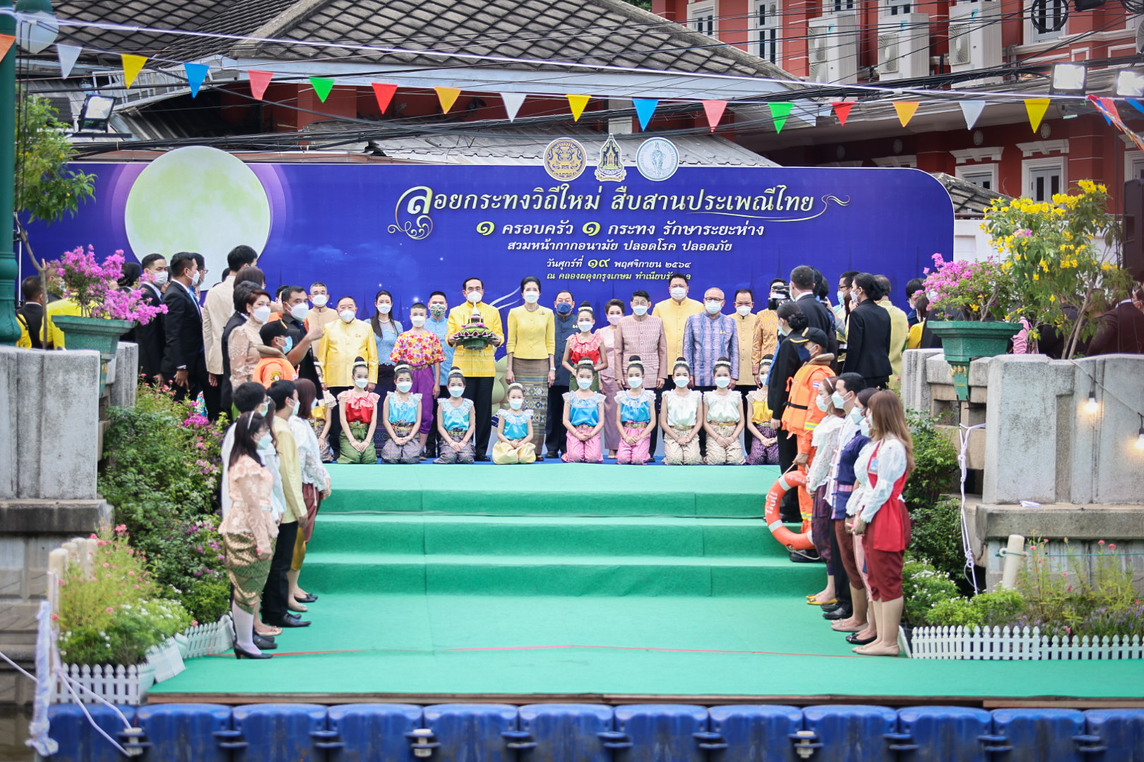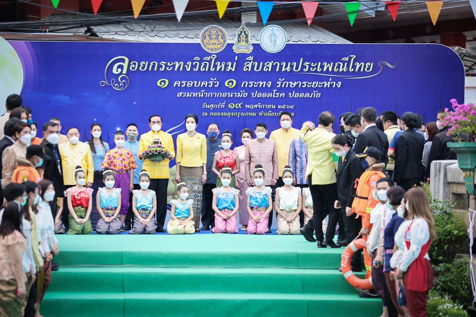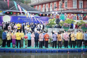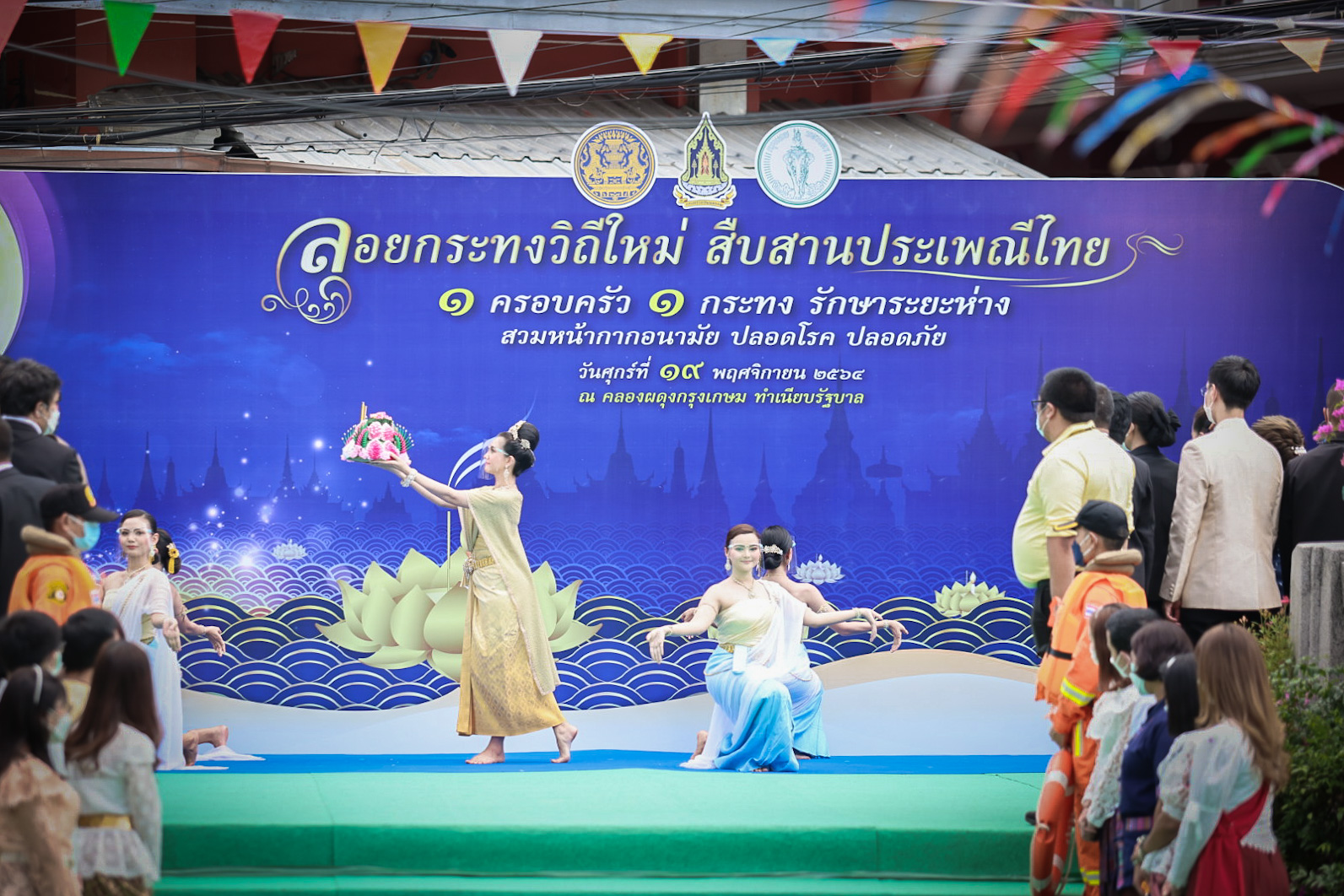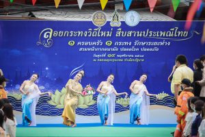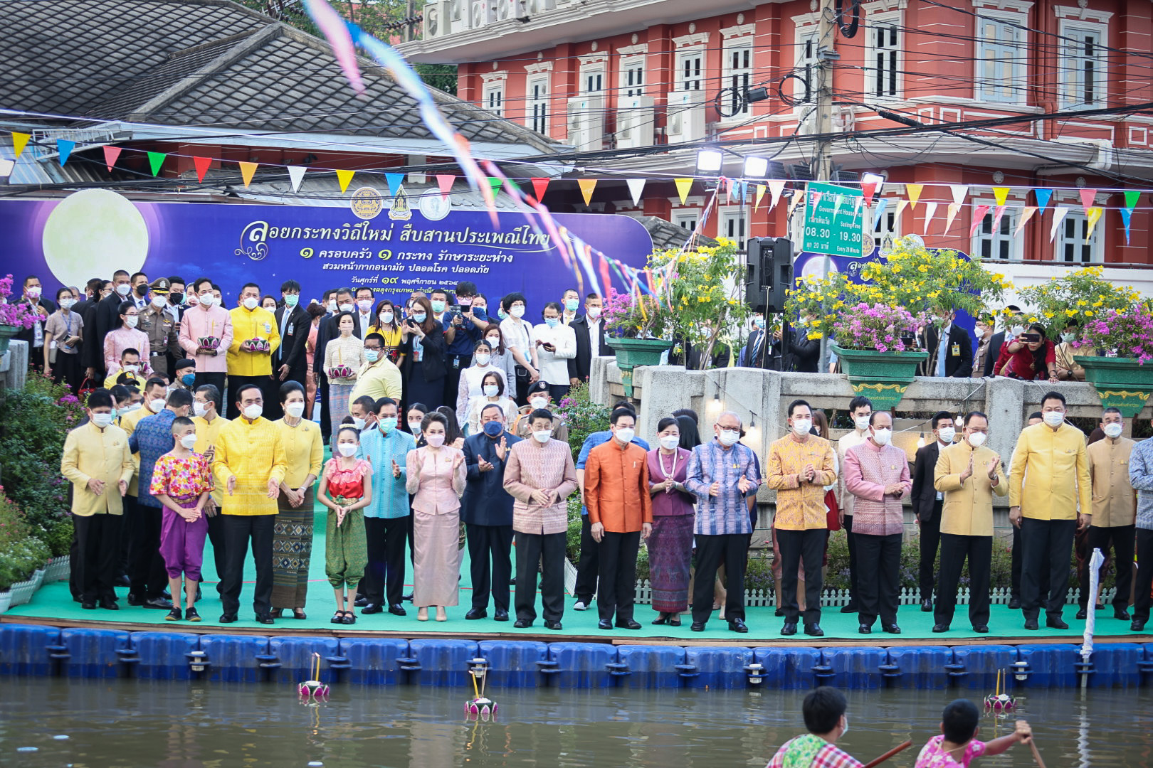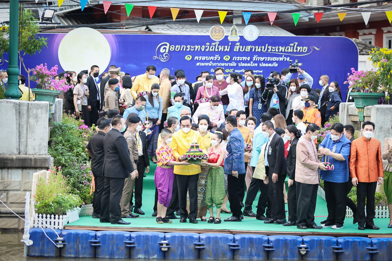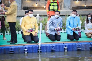 On November 19, 2021, at 16.30 hours, Labour Minister Mr. Suchart Chomklin joined the “Loy Krathong the new way: Continuing Thai traditions with one family and 1 Krathong, keeping distance and wearing hygiene masks to stay disease-free and safe”. Prime Minister and Minister of Defense General Prayuth Chan-ocha and his wife, Mrs. Naraporn Chan-ocha, chaired the ceremony at the Khlong Phadung Krung Kasem next to the Government Houses. The Labour Minister attended an exhibition showcasing the knowledge, essence, values , and practices for the Loy Krathong Festival during the COVID-19 pandemic. It showcased Krathongs in the Royal Court and Krathongs in the four regions. They watched the cultural river show by the Bunditpatanasilpa Institute before joining the Loy Krathong ceremony with the Cabinet. Participants prayed before floating their Krathongs. After that, they watched a simulation of the floating market lifestyle as well.