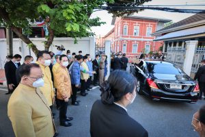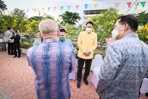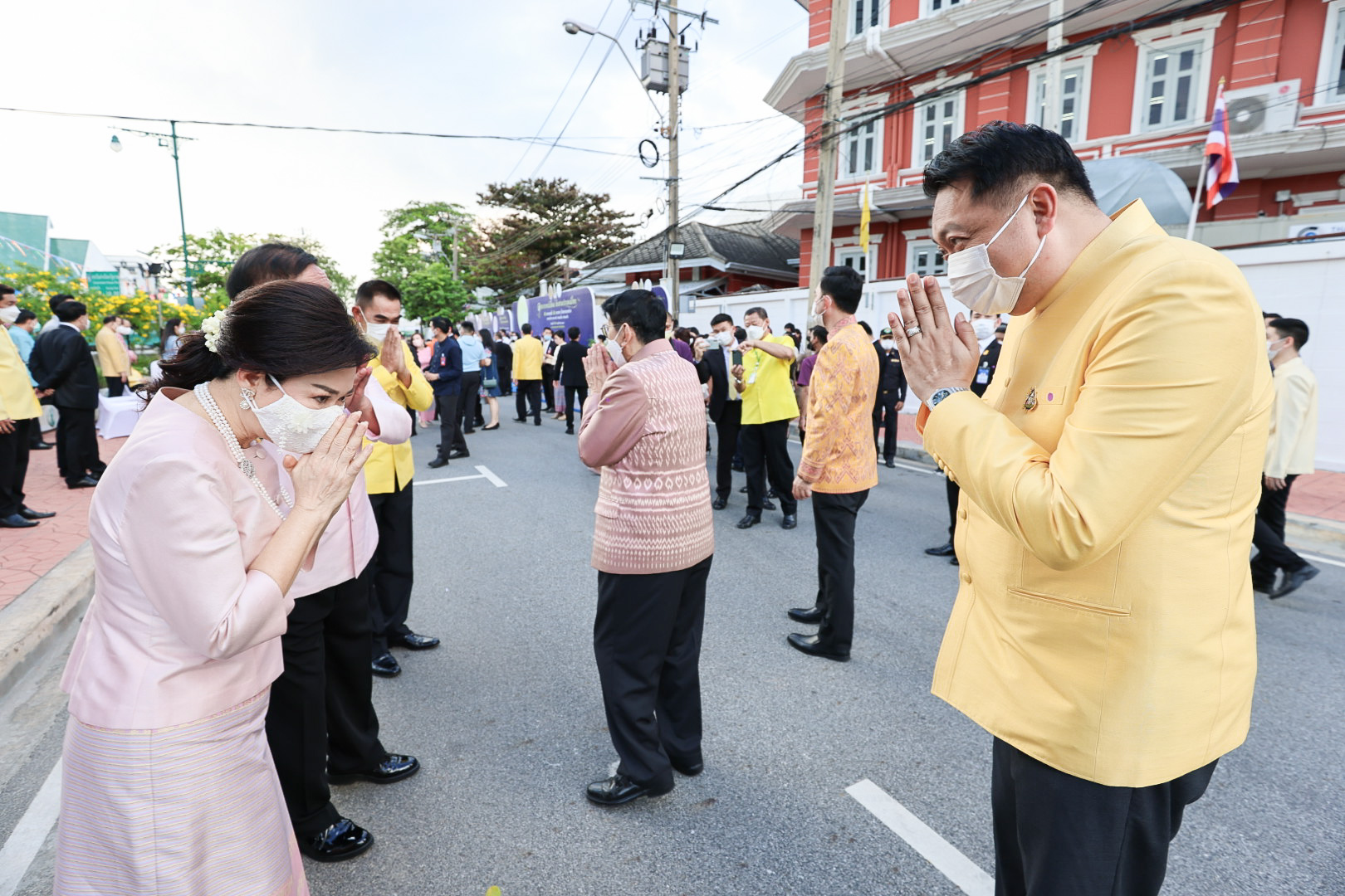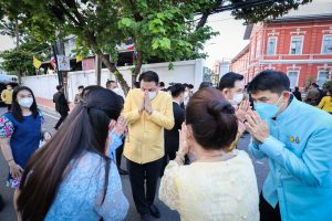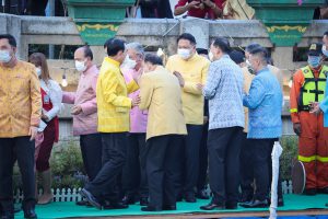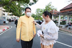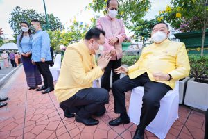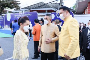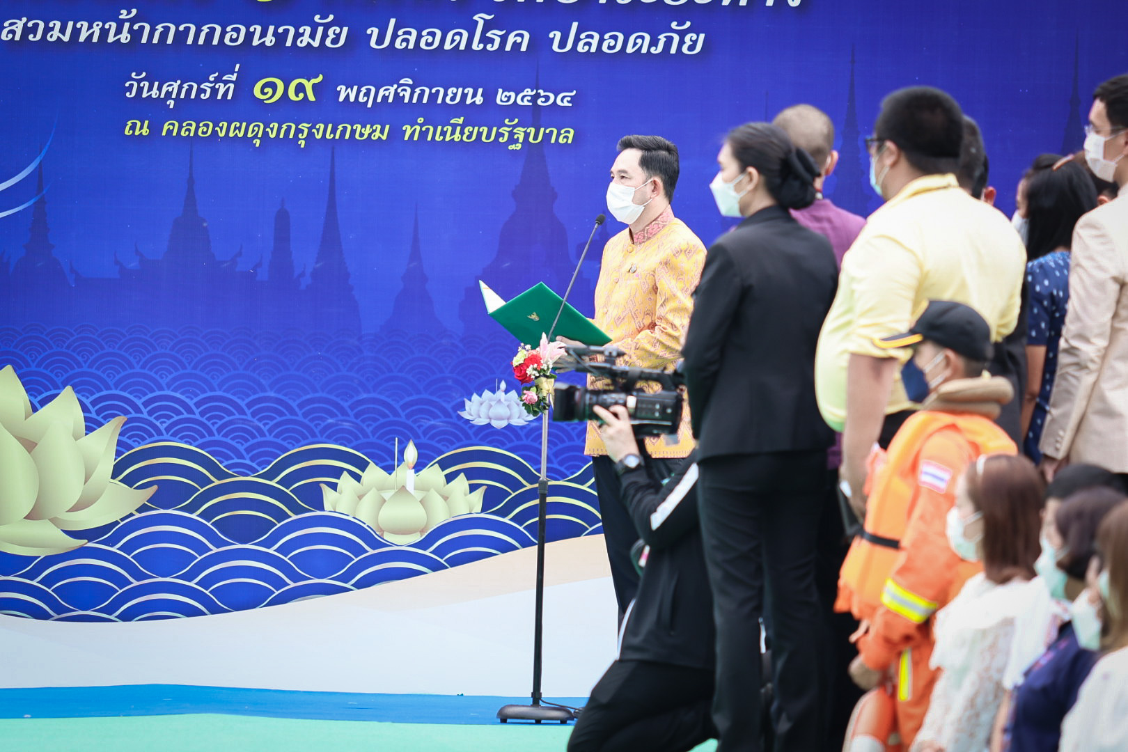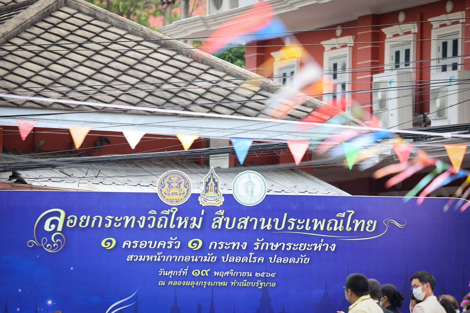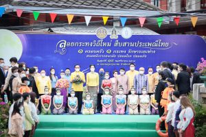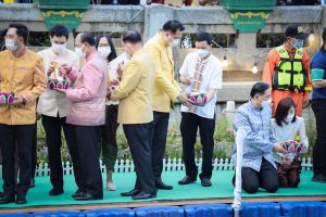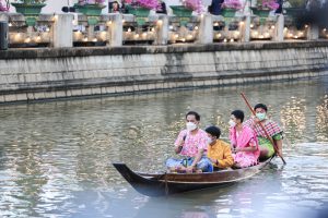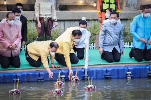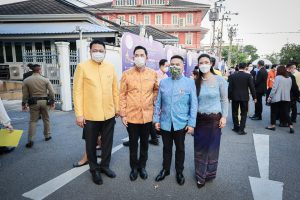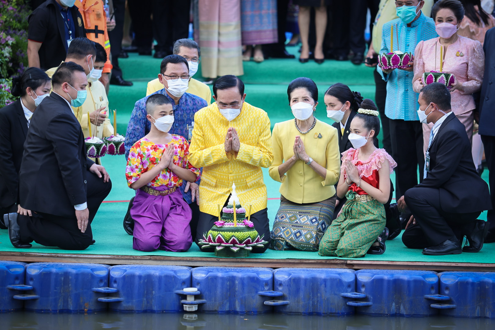 On November 19, 2021, at 16.30 hours, Labour Minister Mr. Suchart Chomklin joined the “Loy Krathong the new way: Continuing Thai traditions with one family and 1 Krathong, keeping distance and wearing hygiene masks to stay disease-free and safe”. Prime Minister and Minister of Defense General Prayuth Chan-ocha and his wife, Mrs. Naraporn Chan-ocha, chaired the ceremony at the Khlong Phadung Krung Kasem next to the Government Houses. The Labour Minister attended an exhibition showcasing the knowledge, essence, values , and practices for the Loy Krathong Festival during the COVID-19 pandemic. It showcased Krathongs in the Royal Court and Krathongs in the four regions. They watched the cultural river show by the Bunditpatanasilpa Institute before joining the Loy Krathong ceremony with the Cabinet. Participants prayed before floating their Krathongs. After that, they watched a simulation of the floating market lifestyle as well.
