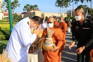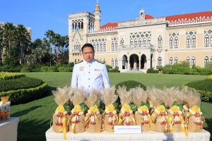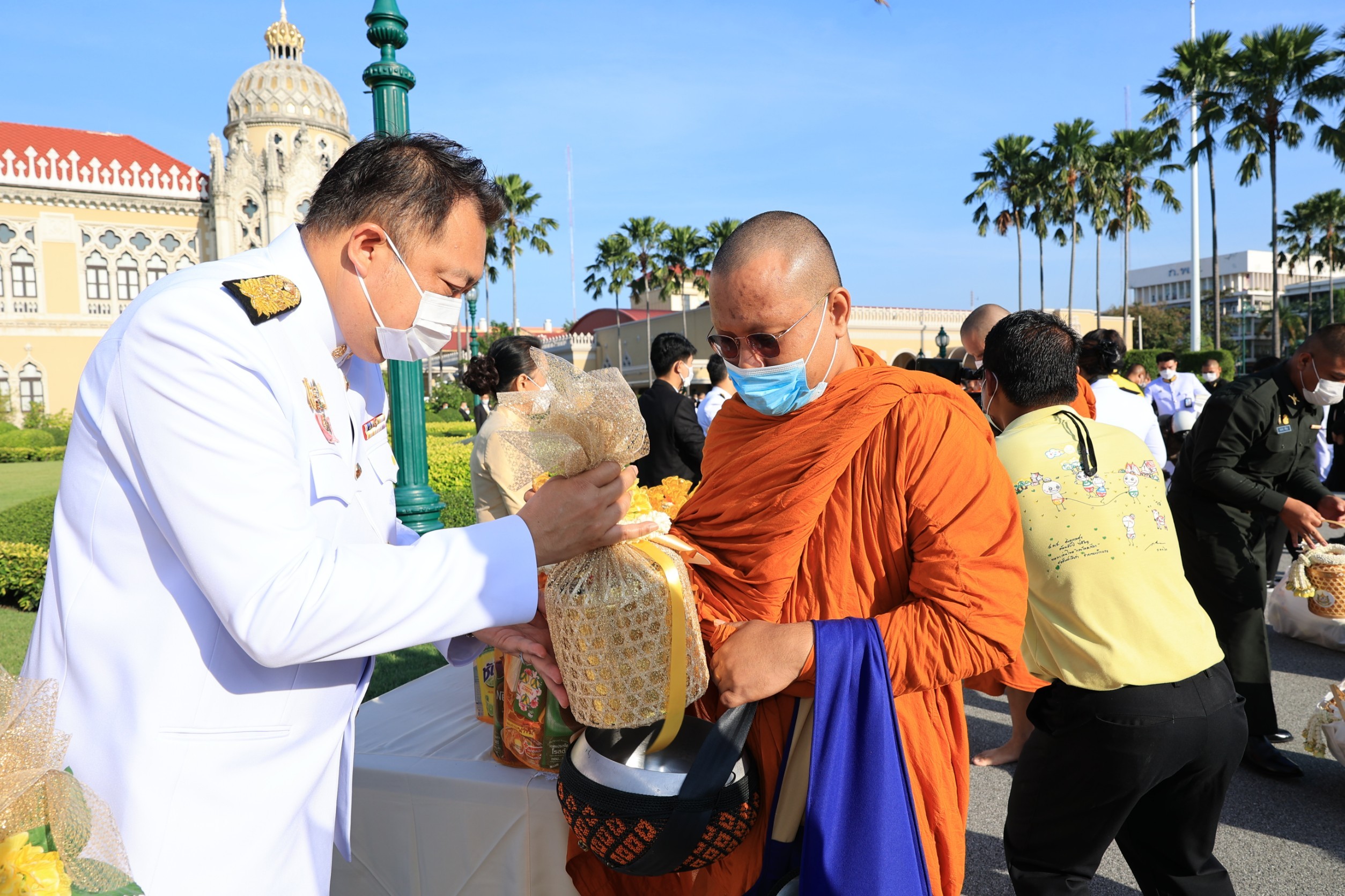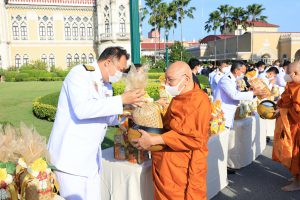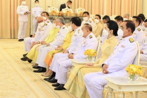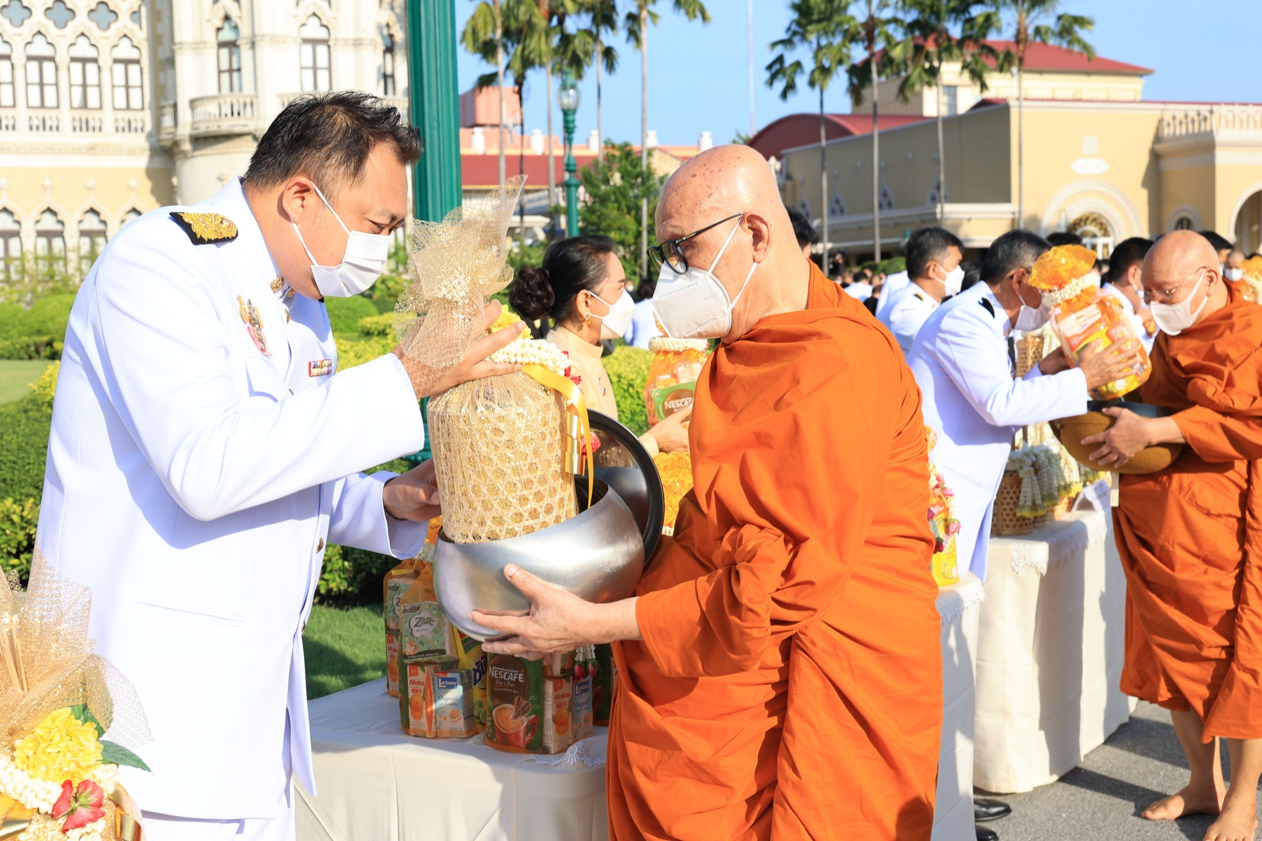 On October 13, 2022, at 06.45 hours, the Labour Minister, Mr. Suchart Chomklin, joined the merit-making ceremony and offered food to 89 monks, on the anniversary of the passing of His Majesty King Bhumibol Adulyadej the Great, on October 13 2022. The Prime Minister and Minister of Defense, General Prayuth Chan-ocha, and his wife presided over the occasion. The Cabinet members and their spouses attended the event at the Santi Maitree Building and in front of the Thai Khu Fah Building, Government Houses.