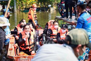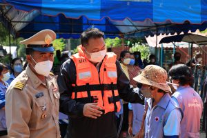 On October 24, 2022, the Labour Minister, Mr. Suchart Chomklin, joined the delegation of the Prime Minister and Minister of Defense General Prayuth Chan-ocha to visit the area, to monitor the flooding situation and give encouragement to flood victims at Phikun Thong Temple in Phikun Thong Subdistrict, Tha Chang District, Singburi Province. Provincial governors, heads of government agencies involved, labour volunteers, and community members in the area welcomed the delegation.
