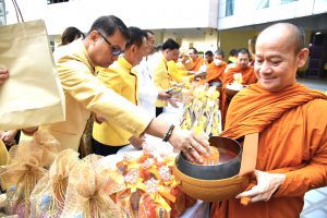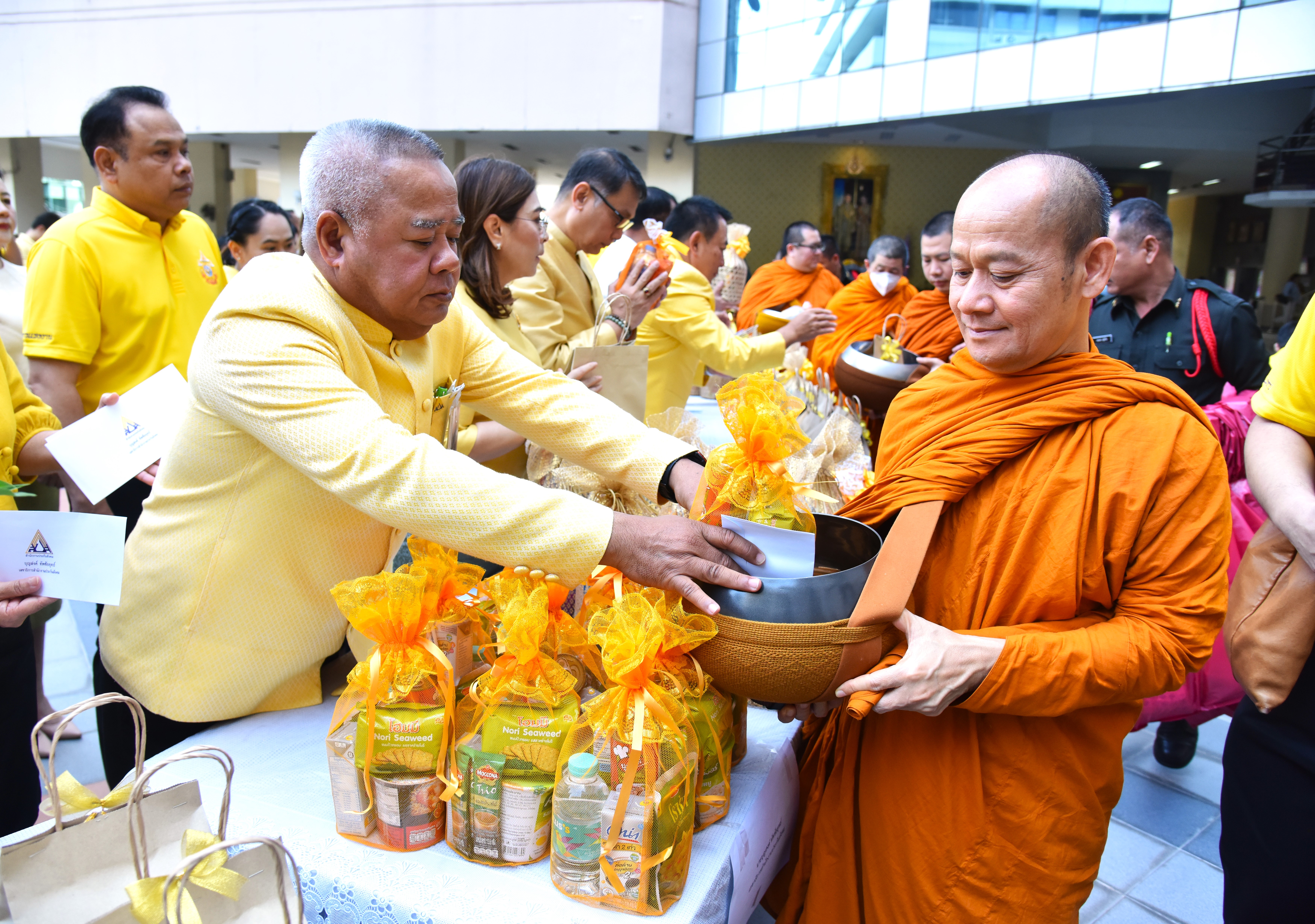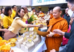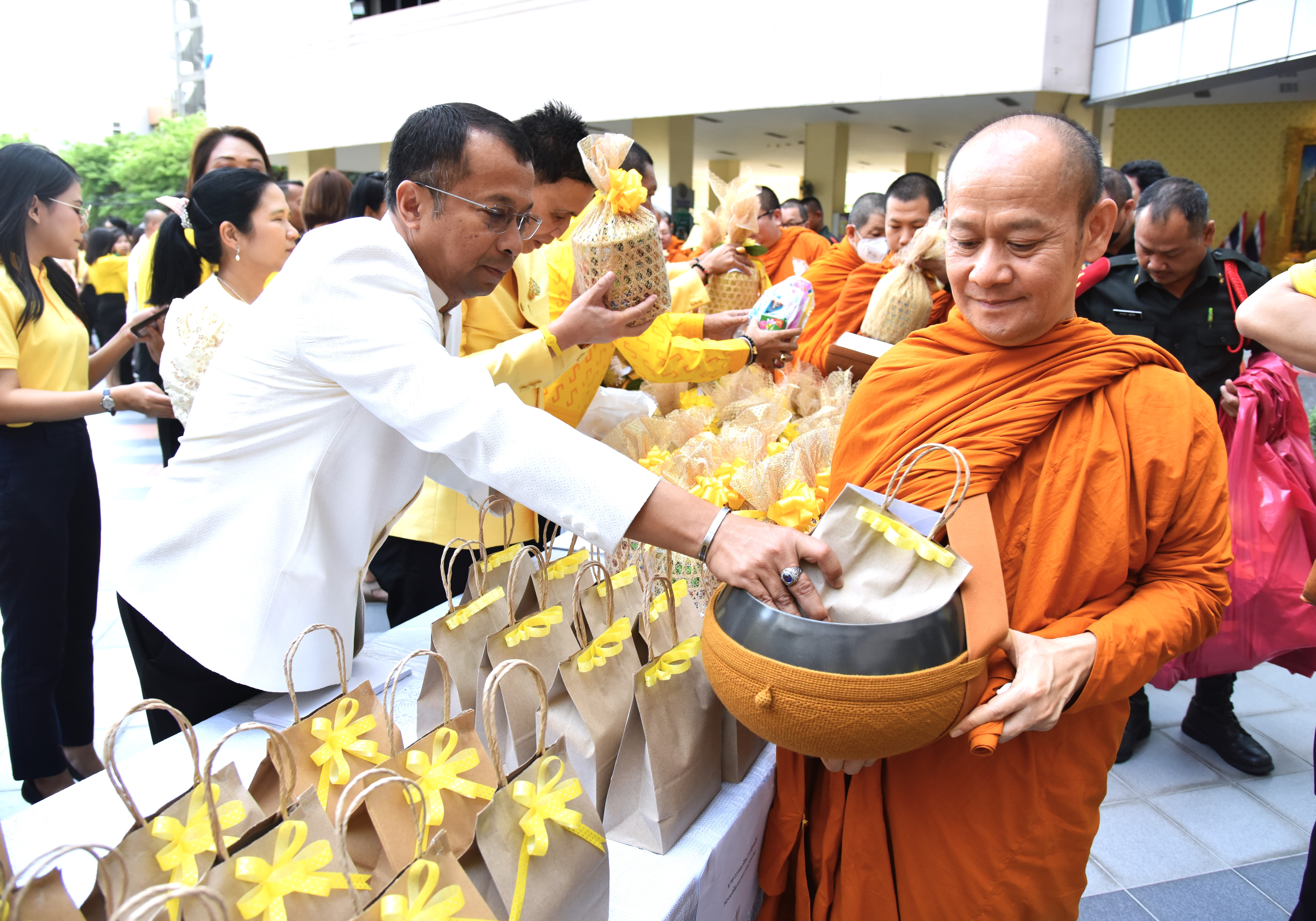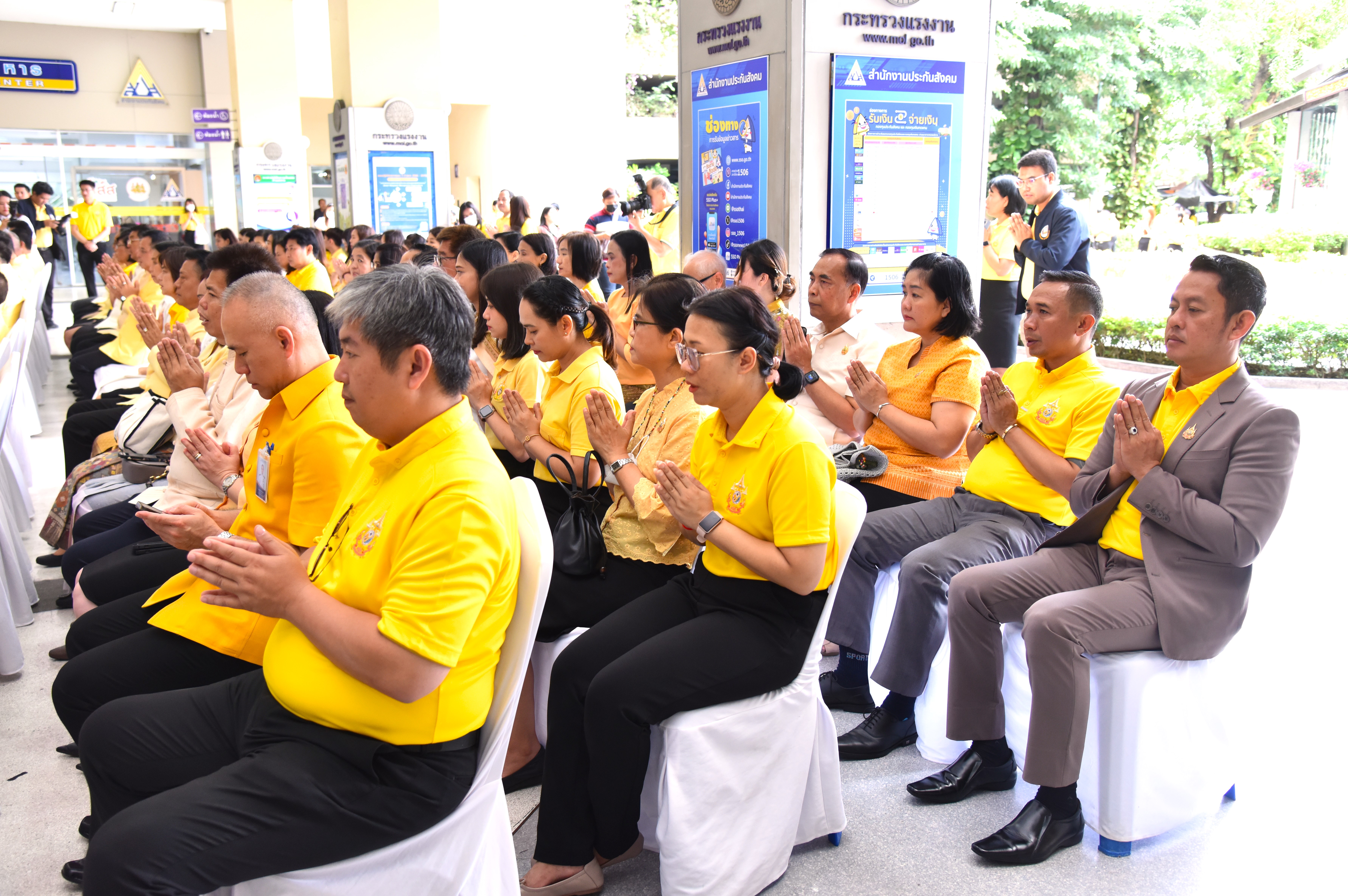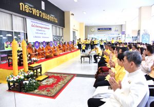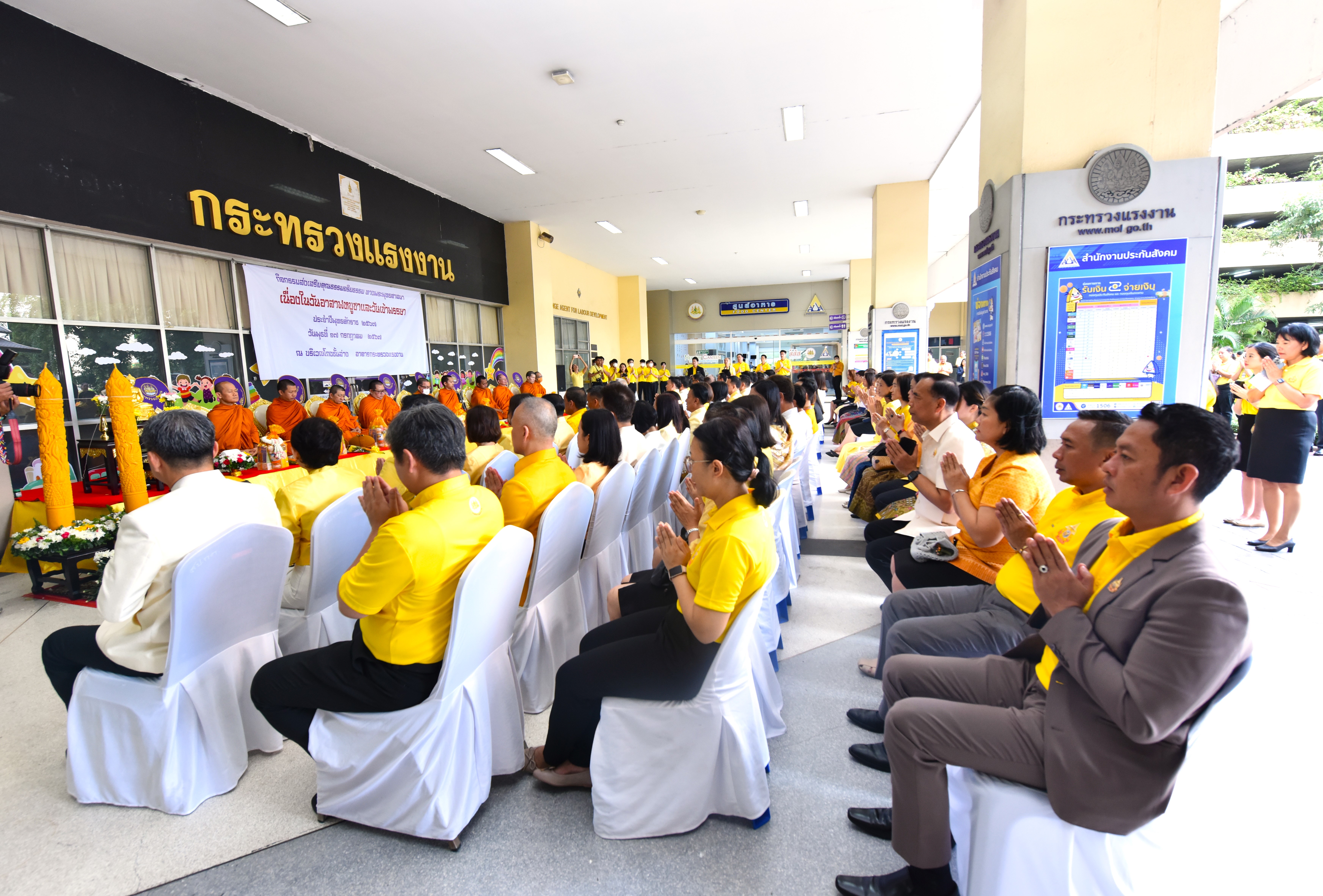 On July 17, 2024, at 08.30 hours, the Labour Minister, Mr. Phiphat Ratchakitprakarn, presided over the alms-giving ceremony to 10 monks, an activity promoting morality and ethics in Buddhism on the occasion of Asahna Bucha Day and Buddhist Lent Day 2024. The Assistant to the Labour Minister, Mr. Siraphop Duangsodsri, the Secretariat to the Labour Minister, Mr. Aree Krainara, from the Prime Minister’s Secretariat’s Office, performing duties for the Ministry of Labour, Mr. Phuchong Worasri, the Ministry of Labour’s Spokesperson, Mr. Phumiphat Mueanchan, the Permanent Secretary of Labour, Mr. Pairoj Chotikasathien, the Ministry of Labour’s executives, civil servants, and employees under the Ministry of Labour participated in activities at the ground floor hall of the Ministry of Labour building and the Phra Phuttha Sutthithambophit area.