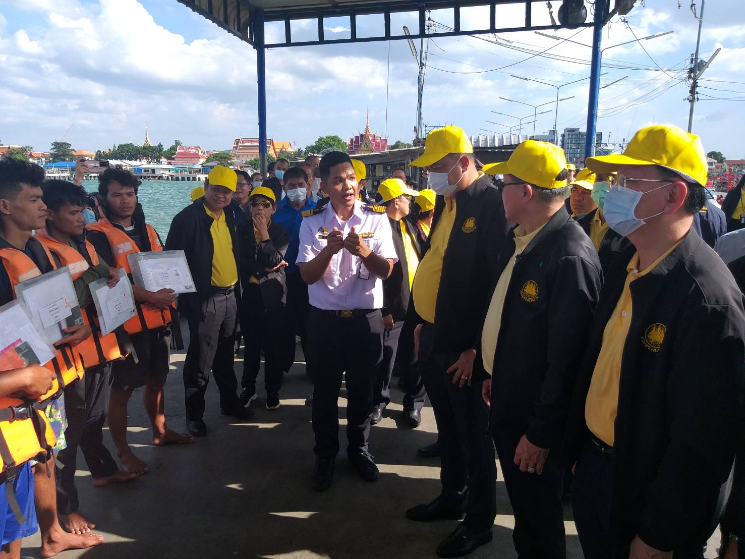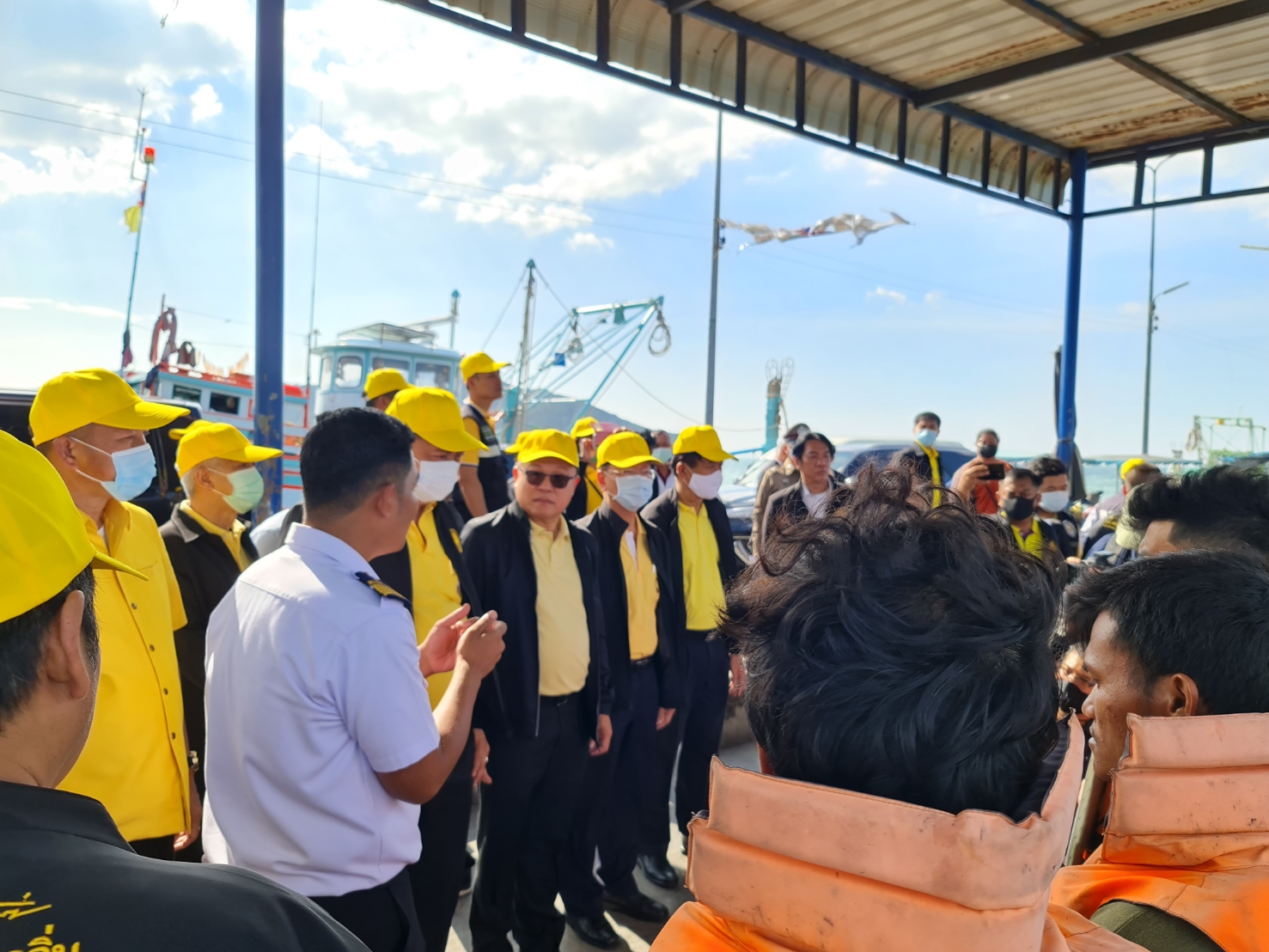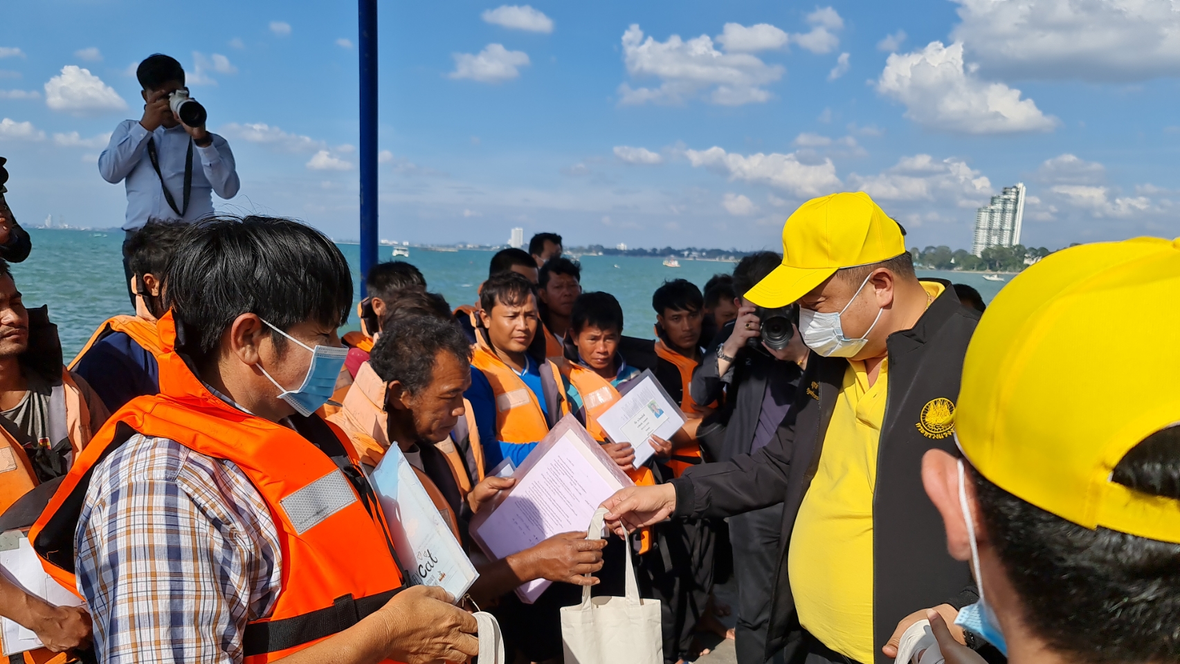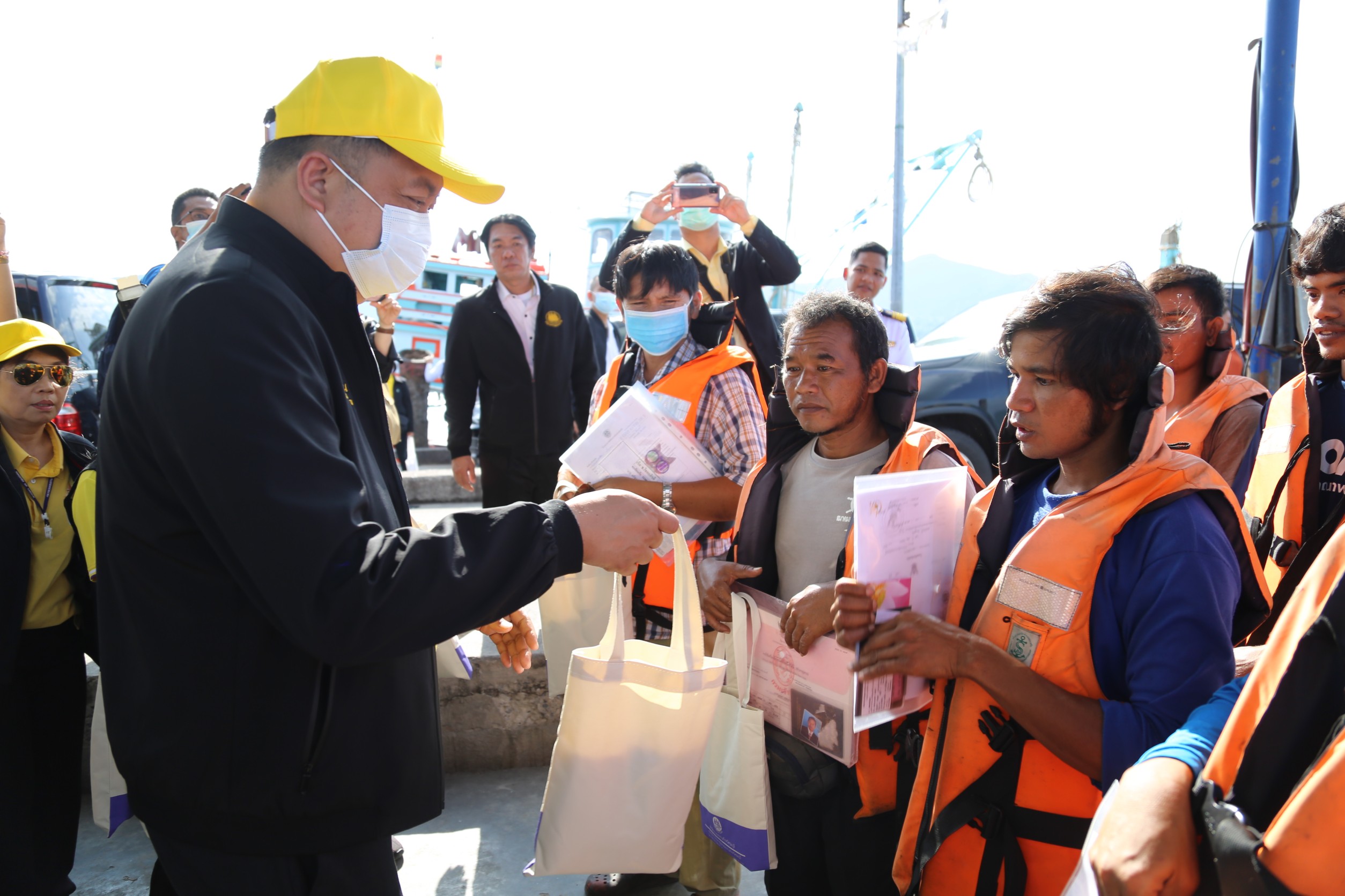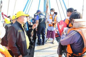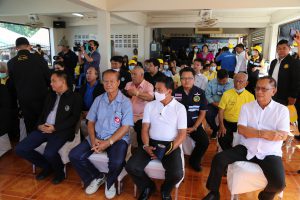 On November 6, 2020, Labour Minister Mr. Suchart Chomklin, together with Assistant to the Labour Minister Mr. Surachai Chaitrakulthong, Permanent Secretary of Labour Mr. Suthi Sukosol, and the Ministry of Labour’s executives also joined the event. Mr. Thawatchai Srithong, Deputy Governor of Chonburi Province, welcomed the visiting committee. President of the Samae San Fisheries Association in Chonburi submitted a complaint letter. On this occasion, the Labour Minister observed the Port in and Port out Control Center (PIPO) in Chonburi, located in Bang Saray, Sattahip, Chonburi. He said that the government under the leadership of Prime Minister General Prayuth Chan-ocha, and the Ministry of Labour under the supervision of Deputy Prime Minister General Prawit Wongsuwan, focuses on driving policies to prevent and resolve the problem of human trafficking. Today, the Labour Minister traveled to meet with employees, employers, and the relevant sectors to drive the policies. He listened to a briefing from Mr. Patawee Sukakasi, representative of the PIPO Center, about its operations. He listened to obstacles in marine fisheries in the area from Mr. Boonyang Nakrong, chairman of the Bang Saray Fishery Farmers Group. He also inspected the boat in front of the port, together with the team, met and spoke with sea fishers, and gave souvenirs to about 50 workers.