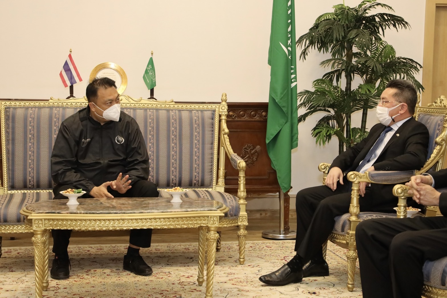 On March 27, 2022, at 07.30 hours local time, Labour Minister Mr. Suchart Chomklin, Assistant to the Labour Minister Mr. Surachai Chaitrakulthong, Permanent Secretary of Labour, Mr. Boonchob Suttamanaswong, the Ministry of Labour’s Spokesperson (on politics), Mrs. Theanrat Nawamawat, the Minister’s Advisor Sergeant Ekayossing Liamlert, the Department of Employment’s Director-General, Mr. Pairoj Chotikasathian, arrived in Saudi Arabia. Mr. Abdulmayid Al Rachudi, Deputy Minister of Labour Affairs, Ministry of Human Resources and Social Development, and Mr. Sathon Kasemsan Na Ayudhya, Charge d’affaires to Riyadh, gave the delegation a warm welcome on their arrival to Riyadh. Mr. Suchart said that today, he brought the Ministry of Labour’s executives to Riyadh, Saudi Arabia, to prepare to attend the labour agreement’s signing ceremony on March 28, 2022, at 12:30 hours local time.