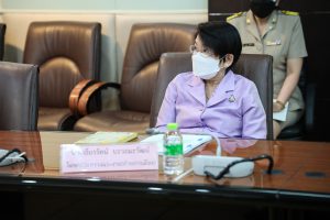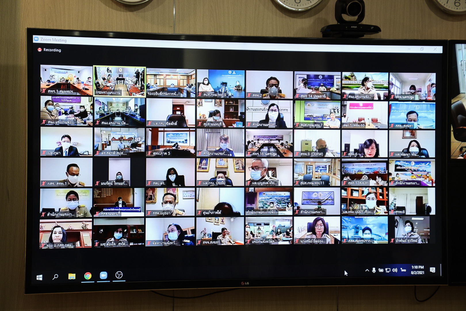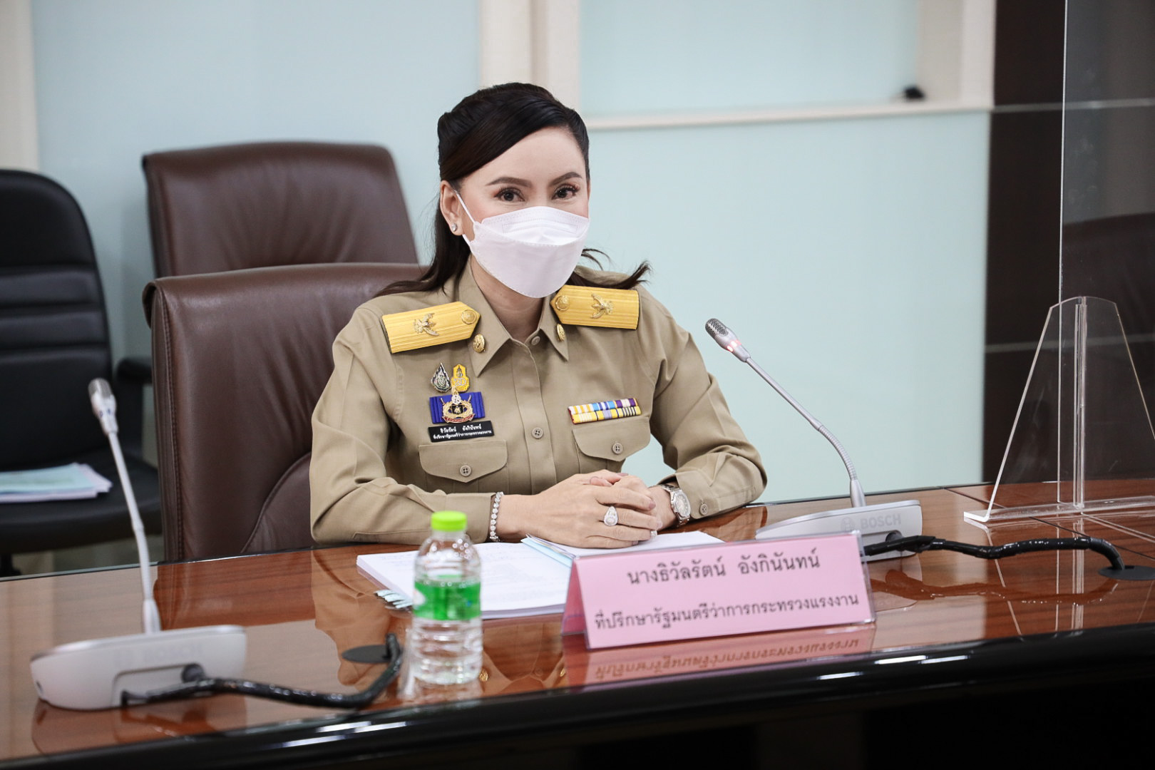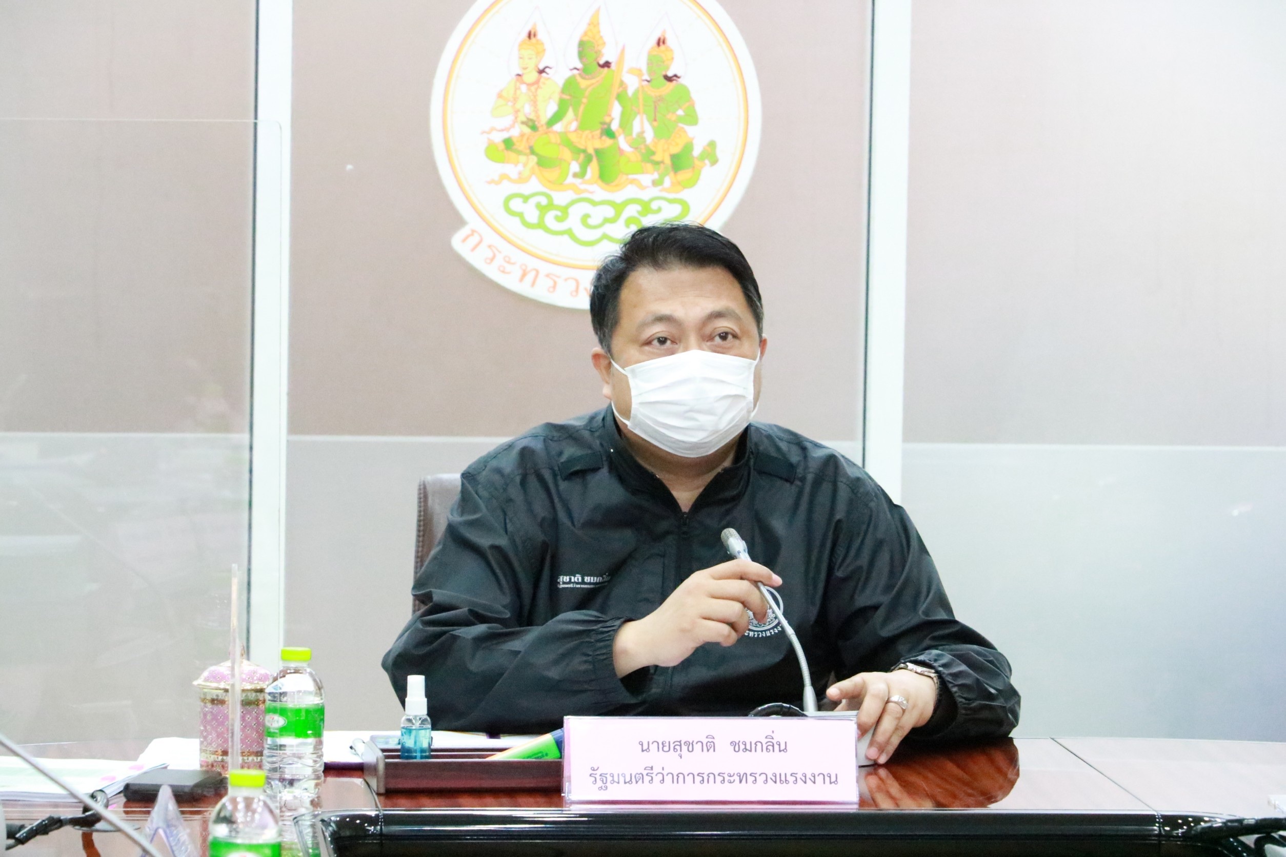 On August 2, 2021, at 13.00 hours, Labour Minister Mr. Suchart Chomklin chaired the meeting to monitor the COVID-19 situation across the country through Zoom. The meeting aimed to help people in the area recover from COVID-19 impacts, reduce infection and promote a better quality of life. The Ministry of Labour’s Advisor, Mrs. Thiwalrat Angkinan, the Labour Minister’s Secretariat Mr. Suthep Chitayawong, Pol. Maj. Gen. Nantachat Supamongkol from the Office of the Prime Minister’s Secretariat, performing duties for the Ministry of Labour, the Ministry of Labour’s Spokesperson (on politics) Mrs. Thienrat Navamawat, and the Ministry of Labour’s executives also joined the occasion at the Saengsingkaew meeting room, 5th floor, Ministry of Labour.