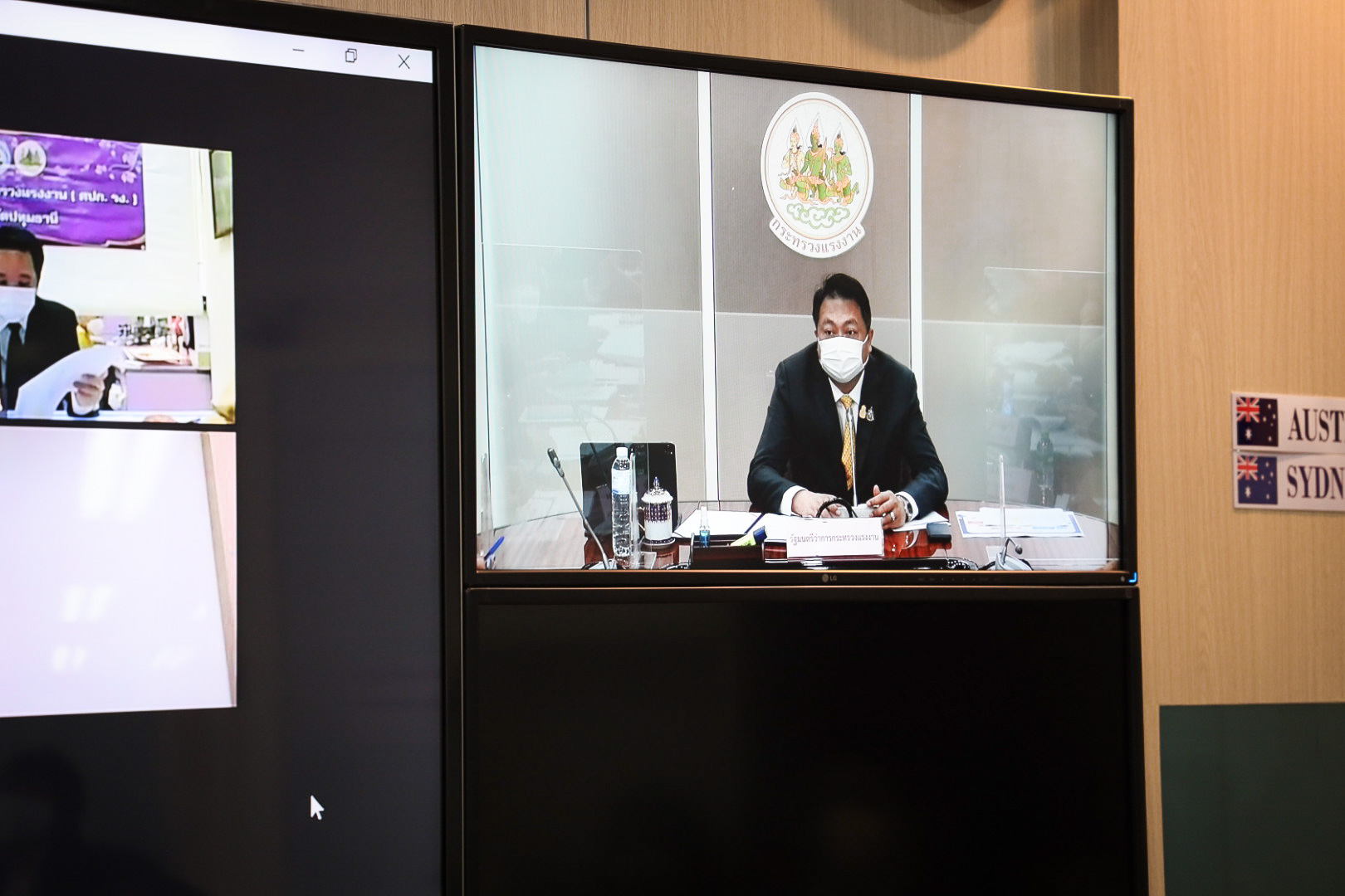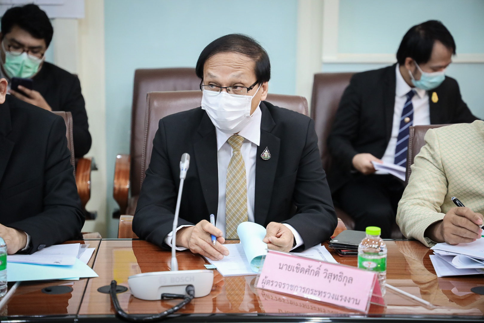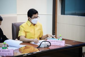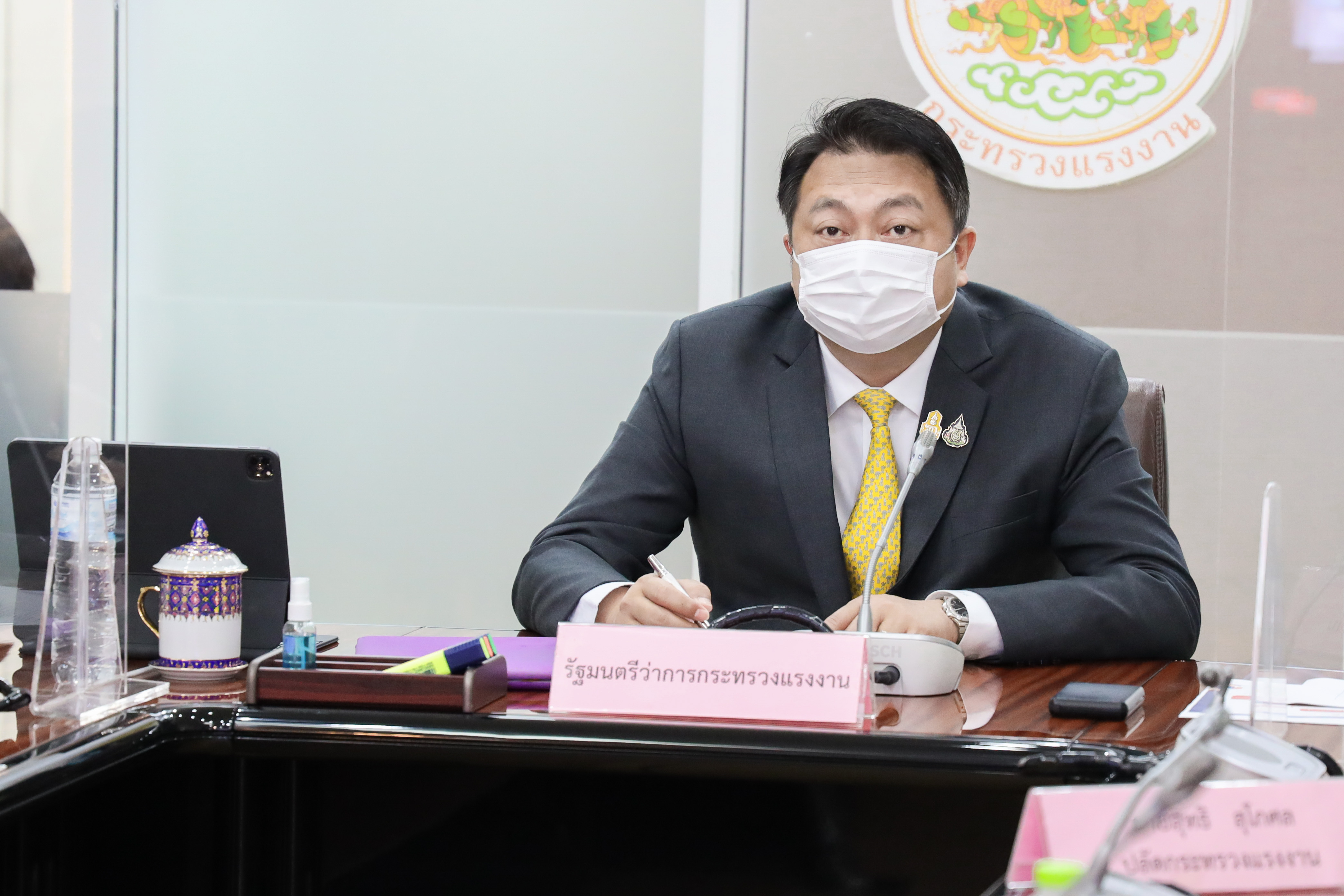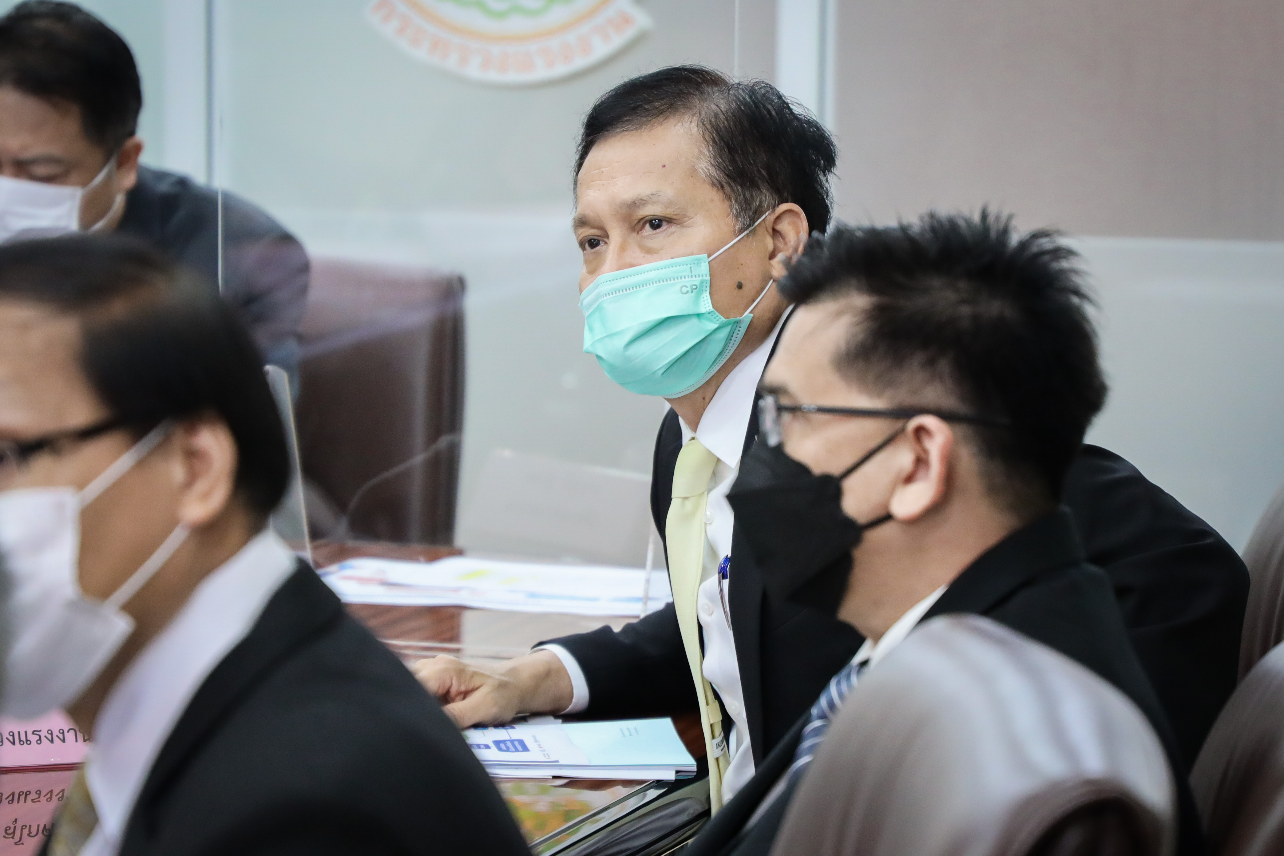 On July 30, 2021, at 10.00 hours, Labour Minister Mr. Suchart Chomklin chaired the meeting to monitor the COVID-19 situation in Nonthaburi, Pathum Thani, and Samut Sakhon, which took place via Zoom. Assistant to the Labour Minister Mr. Surachai Chaitrakulthong, the Labour Minister’s Secretariat Mr. Suthep Chitvong, the Ministry of Labour’s Spokesperson (on politics) Mrs. Theanrat Nawamawat, Permanent Secretary of Labour Mr. Suthi Sukosol, Nonthaburi Provincial Governor Mr. Suchin Chaichumsak, Pathum Thani Provincial Governor Mr. Chaiwat Chuenkosum, Samut Sakhon Provincial Governor Mr. Wirasak Withitsaengsri and the Ministry of Labour’s executives also joined the occasion at the Saengsingkaew meeting room, 5th floor, Ministry of Labour.