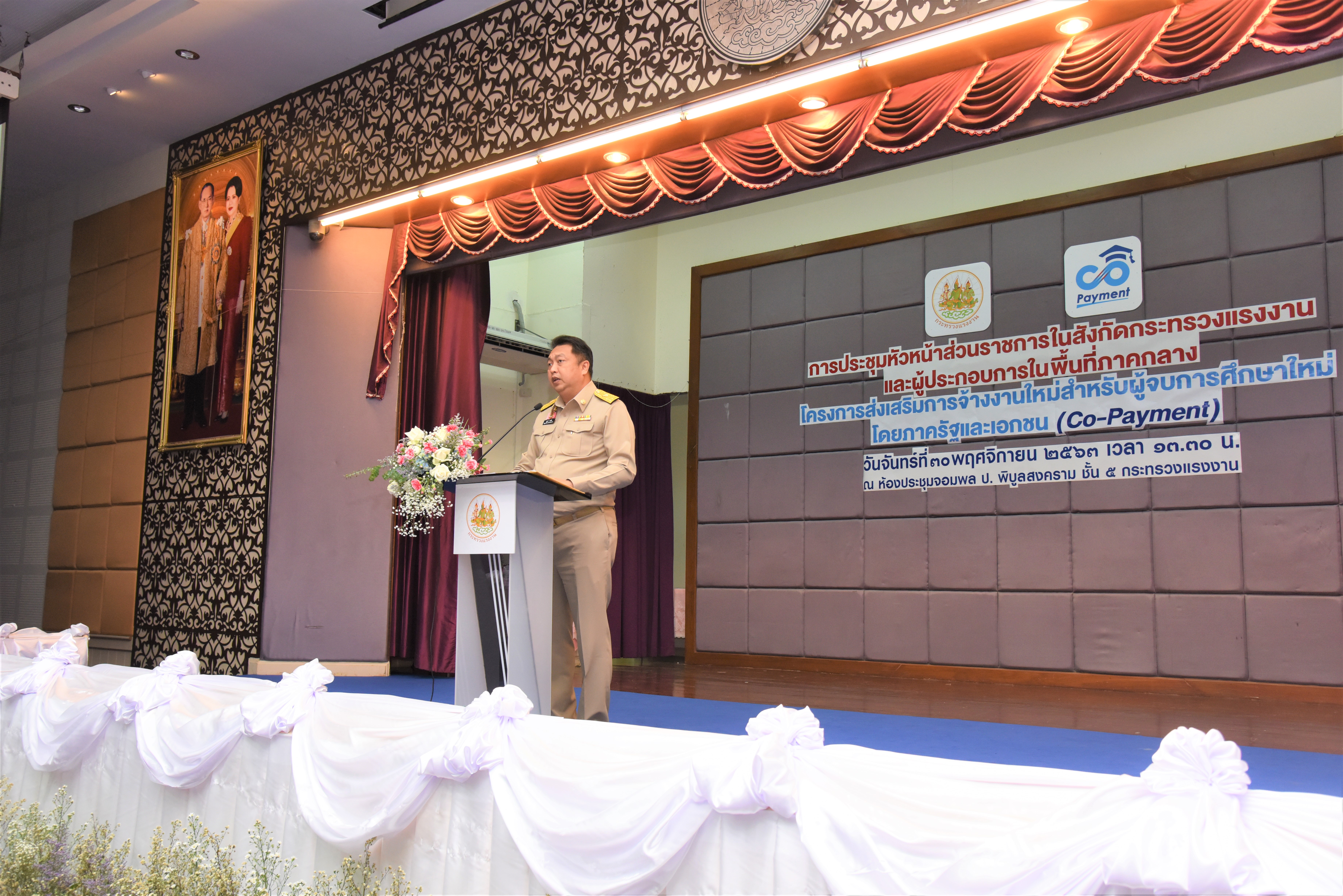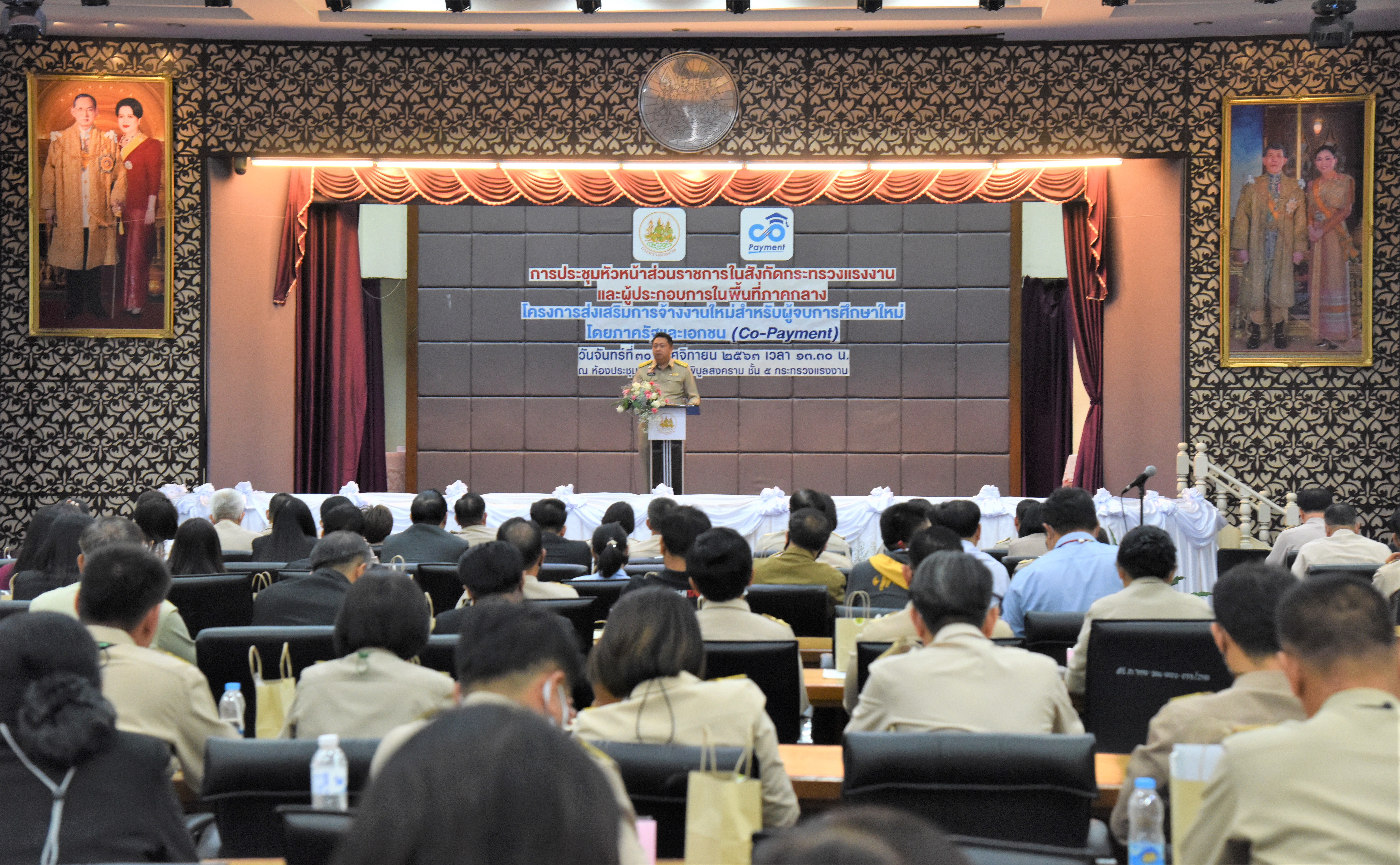 Mr. Suchart continued that acknowledging problems, facts from operations in the area, and suggestions from the perspective of employers/companies in implementing the Co-payment project is a matter that the Ministry of Labour gives priority to. It is finding common ways to encourage new graduates and employers/companies to reach a mutual agreement, leading to the targetted 260,000 people’s employment. Thus, 235 employers/companies in the central region were invited to attend the meeting and heads of government agencies under the Ministry of Labour in the central region. This comprised five agencies, including the Provincial Labour Offices, Provincial Employment Offices, Provincial Labour Protection and Welfare Offices, Provincial Skill Development Offices or Institutes, and the Provincial Social Security Office 21 provinces in the central region, to provide policies for the implementation of the Co-payment project.