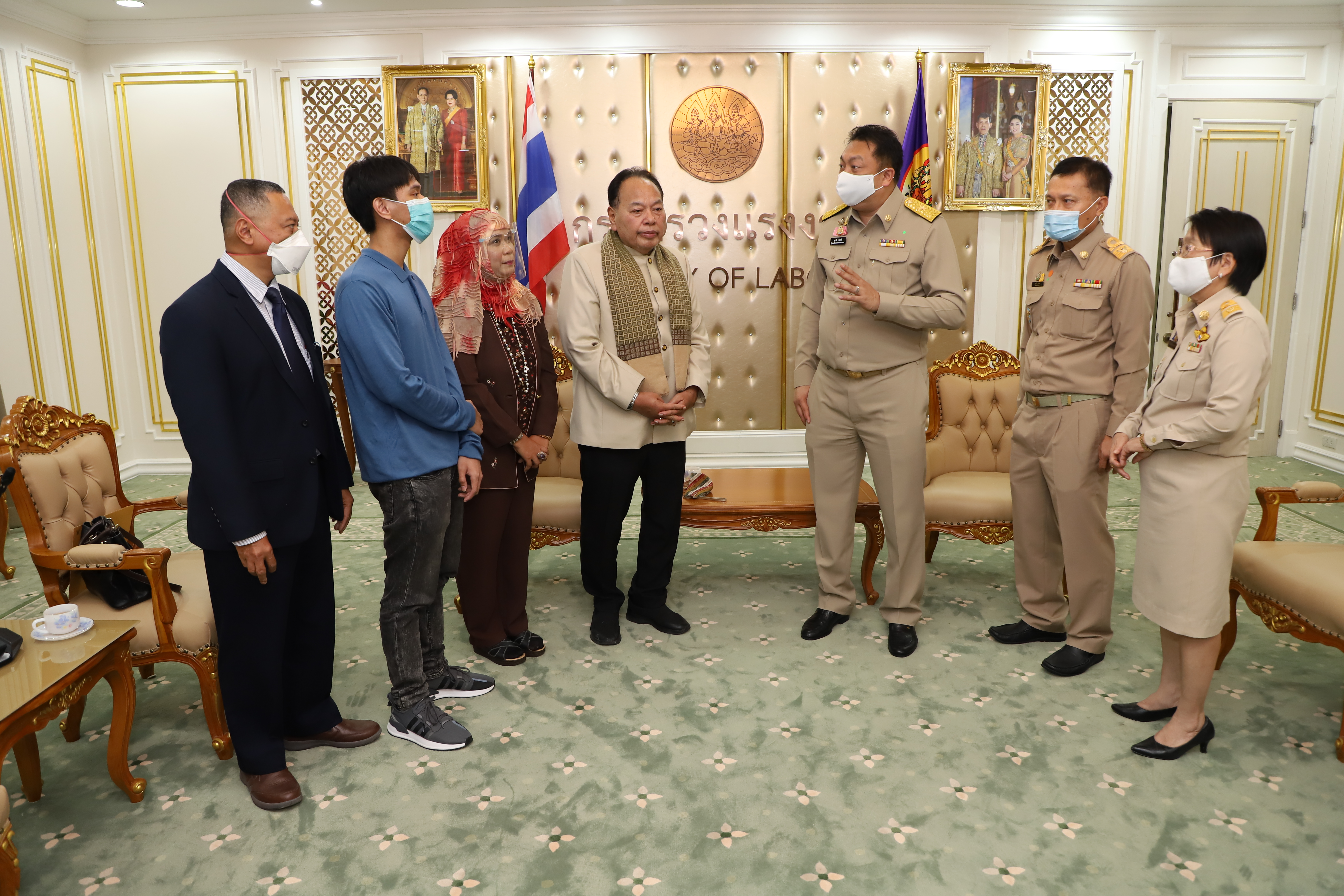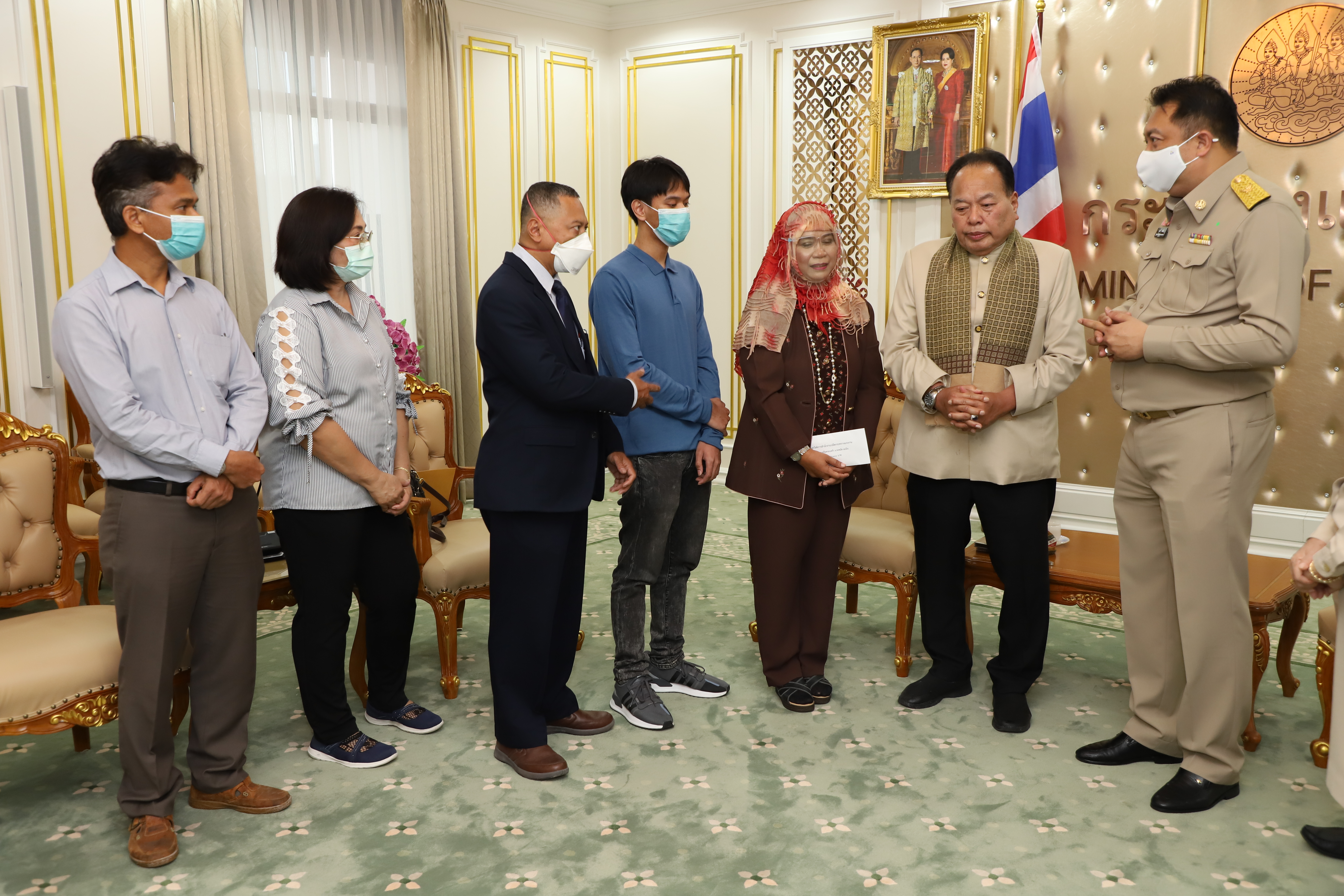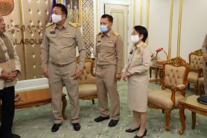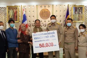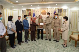 September 21, 2020, Labour Minister Mr. Suchart Chomklin welcomed Mrs. Anurak Ma-min, wife of Mr. Mad Ma-min, and family, to receive money from the Welfare Fund of the Office of the Permanent Secretary of Labour, to help and support the family. The occasion took place at the Chatumongkol Room, 6th floor, Ministry of Labor Building. Permanent Secretary of Labour Mr. Suthi Sukosol, Deputy Permanent Secretary Mrs. Theanrat Nawamawat, and Advisor to Chula Rama Dr. Kasit Srisanga, Bangkok Hospital, Mr. Prida Chuaphandee also attended the occasion. Mr. Mad Ma-min was an interpreter at the Saudi Arabia Labour Office (Riyadh). He died from a lung infection. His Majesty the King gave the grounds for a special burial on September 19 at Bustanul Arifin Mosque, Khlong Si Wa Phra Ajarn, Koh Ka, Bang Nam Priao, Chachoengsao. The Labour Minister said that the Prime Minister General Prayuth Chan-ocha had been concerned for the family of Mr. Mad Ma-min, an interpreter from the Saudi Arabi Labour Office (Riyadh), who had lost a family’s pillar. Therefore, the Ministry of Labour was assigned to take care of the family. Today, they presented money from the Welfare Fund of the Office of the Permanent Secretary to help and encourage Mr. Mad’s family in the initial phase.
