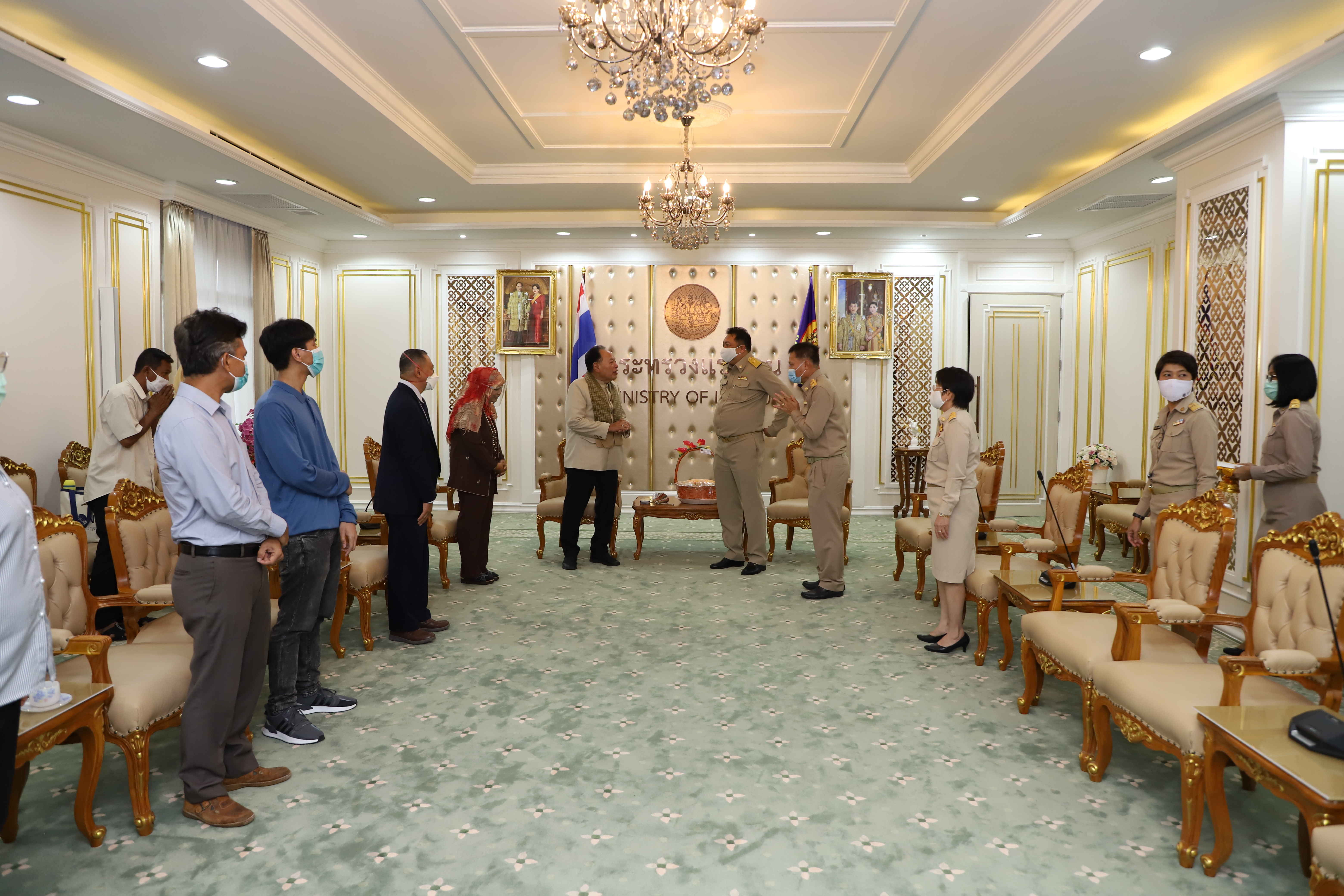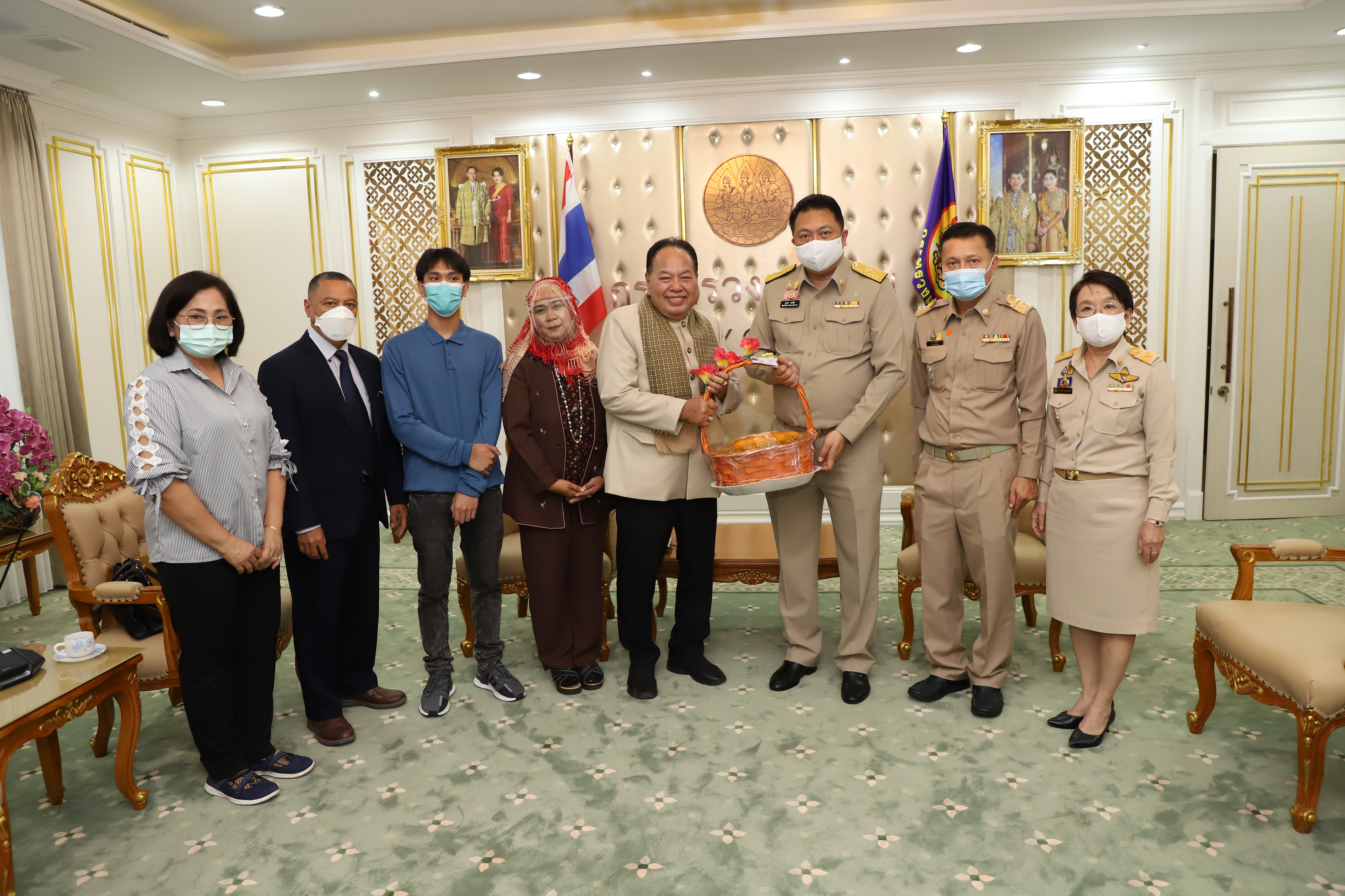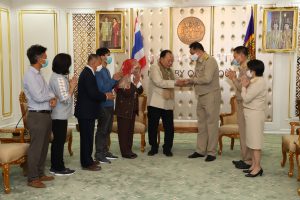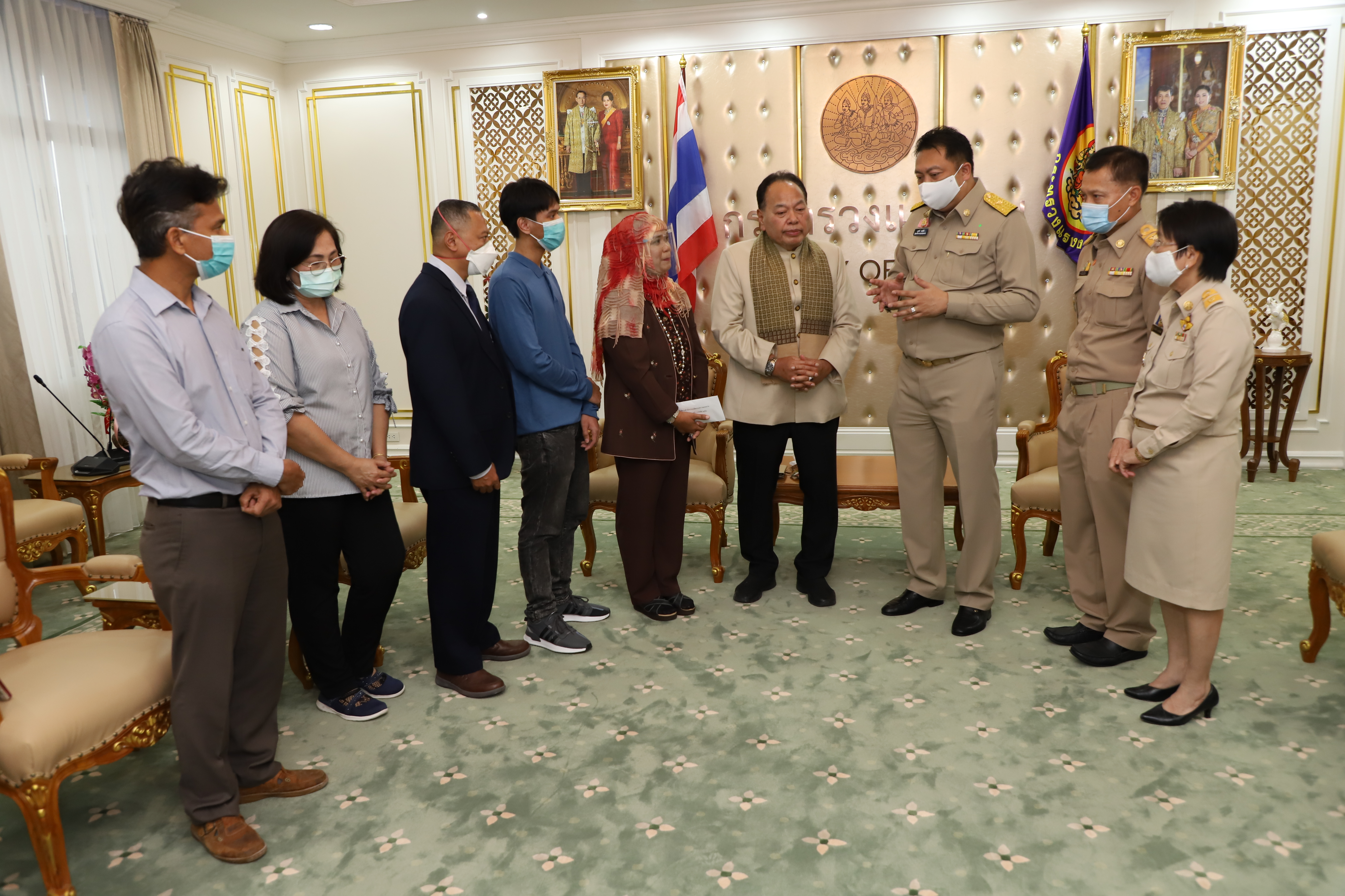 September 21, 2020, Labour Minister Mr. Suchart Chomklin welcomed Mrs. Anurak Ma-min, wife of Mr. Mad Ma-min, and family, to receive money from the Welfare Fund of the Office of the Permanent Secretary of Labour, to help and support the family. The occasion took place at the Chatumongkol Room, 6th floor, Ministry of Labor Building. Permanent Secretary of Labour Mr. Suthi Sukosol, Deputy Permanent Secretary Mrs. Theanrat Nawamawat, and Advisor to Chula Rama Dr. Kasit Srisanga, Bangkok Hospital, Mr. Prida Chuaphandee also attended the occasion. Mr. Mad Ma-min was an interpreter at the Saudi Arabia Labour Office (Riyadh). He died from a lung infection. His Majesty the King gave the grounds for a special burial on September 19 at Bustanul Arifin Mosque, Khlong Si Wa Phra Ajarn, Koh Ka, Bang Nam Priao, Chachoengsao. The Labour Minister said that the Prime Minister General Prayuth Chan-ocha had been concerned for the family of Mr. Mad Ma-min, an interpreter from the Saudi Arabi Labour Office (Riyadh), who had lost a family’s pillar. Therefore, the Ministry of Labour was assigned to take care of the family. Today, they presented money from the Welfare Fund of the Office of the Permanent Secretary to help and encourage Mr. Mad’s family in the initial phase.