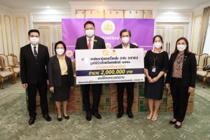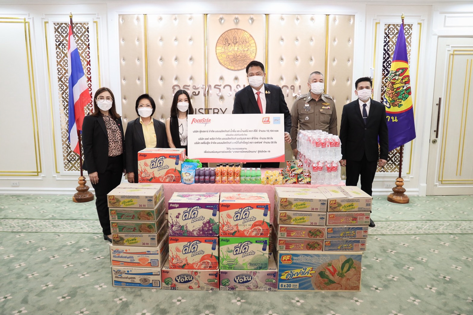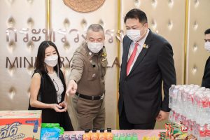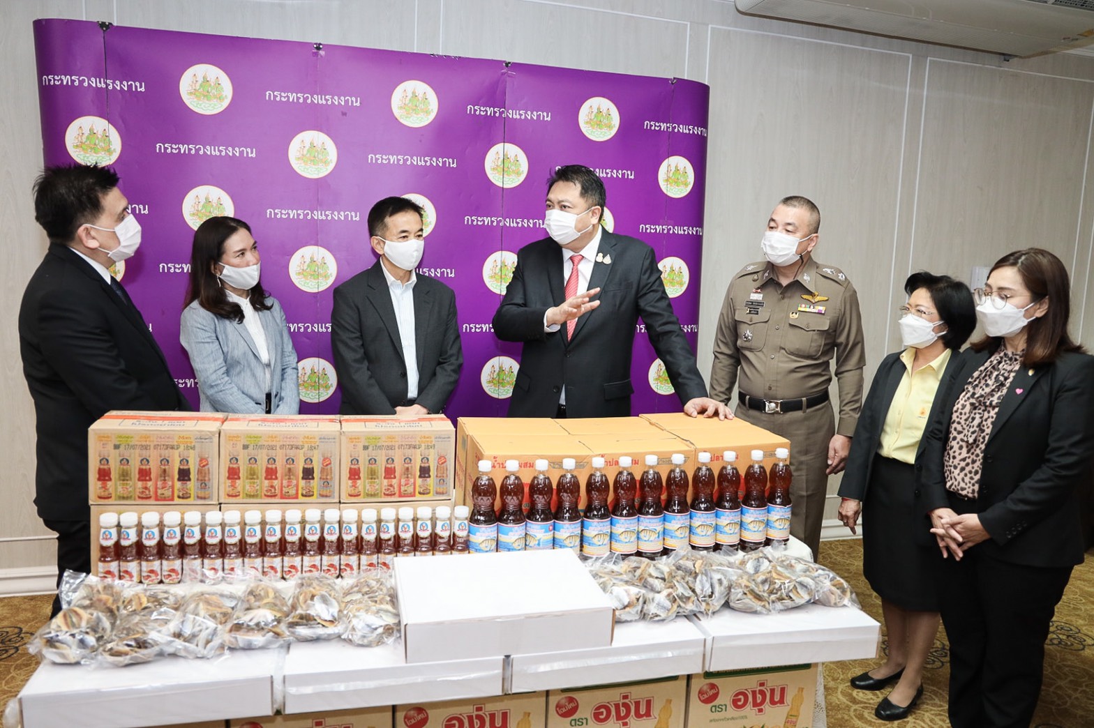 On July 7, 2021, Labour Minister Mr. Suchart Chomklin received consumer goods from the private sector to support workers following the measures to close worker camps in a fight against COVID-19. The meeting took place at the Chatumongkol Room, 6th floor, Ministry of Labour. The following donations were received: 1) Komos Corporation Co., Ltd. by Khun Sudjai Jirayapakorn, donated 18,000 packs of instant noodles. 2) JWD Group by Mr. Chitchai and Khun Atchara Nimitpanya donated consumer goods such as vegetable oil, fish sauce, chicken sauce, yellow stripe, baked bread, instant noodles, valued at 200,000 Baht. 3) Hatari Electric Co., Ltd. donated 15,000 kilograms of rice, valued at 300,000 Baht. 4) Saha Pathana InterHosting PCL, the Ruamjai Foundation of Saha Group 1997, donated instant noodles valued at 2,000,000 Baht. 5) Mr. Wichai Kulsompop, President of Saha Pathana Inter Holdings PCL, donated 200,250 packs of instant noodles. 6) Thantharat Chokwatana, Chairman of the Saha Group Foundation 1997, donated 200,500 packs of instant noodles. 7) Food Star Co., Ltd., by Mr. Chantra Pongsri, Managing Director of Food Star Co., Ltd., donated 2,400 bottles of drinking water, 1,056 bottles of fruit juice, 96 bottles of 40% fruit juice, 2,592 bottles of mixed yogurt drinks, 1,440 bottles of mixed yogurt and coconut jelly drinks, 50 boxes of seasoning powder, and 30 boxes of instant noodles. Deputy Permanent Secretary of Labour Ms. Aumpun Thuwawit, Director-General of the Department of Employment Mr. Phairoj Chotikasathian, and the Ministry of Labour’s Inspector-General Ms. Bubpha Rueangsud, also joined the occasion.