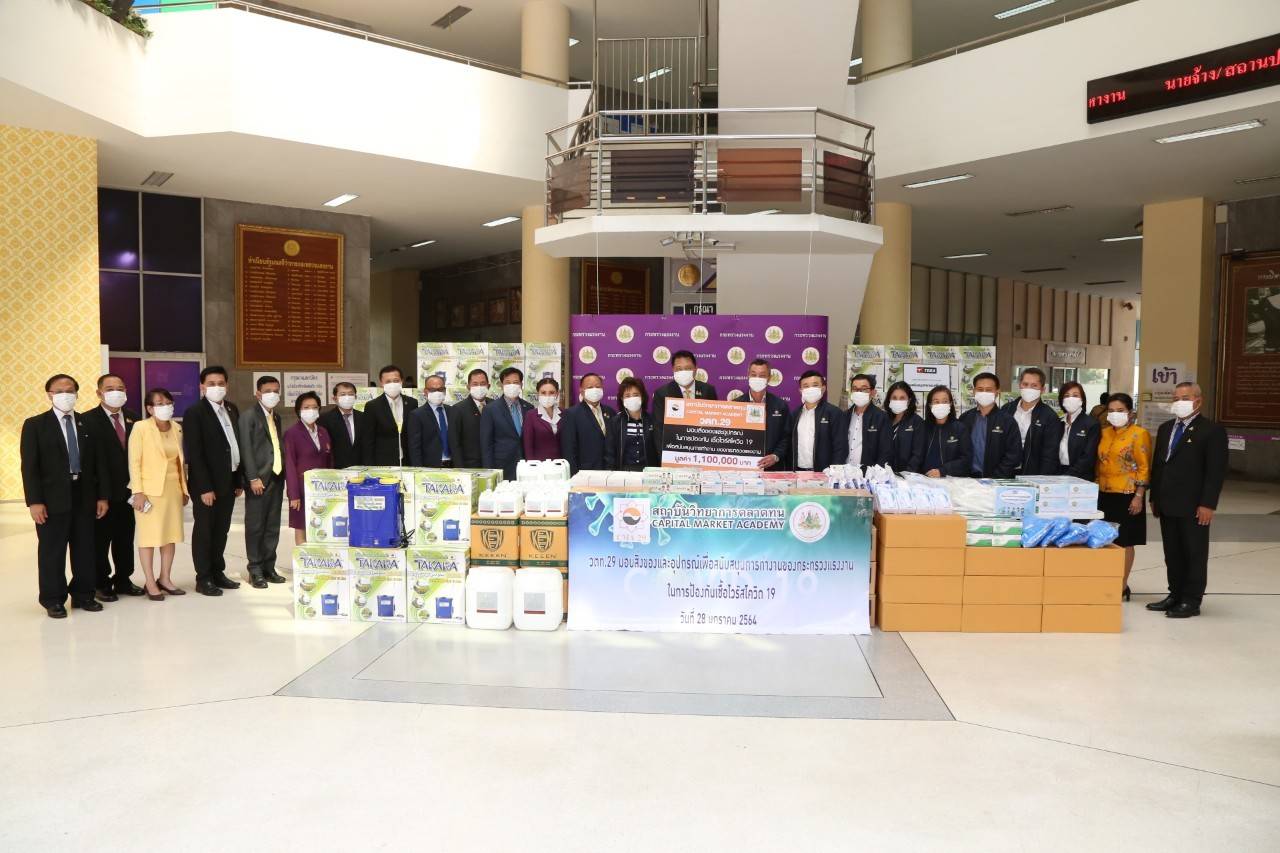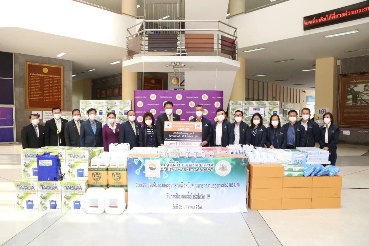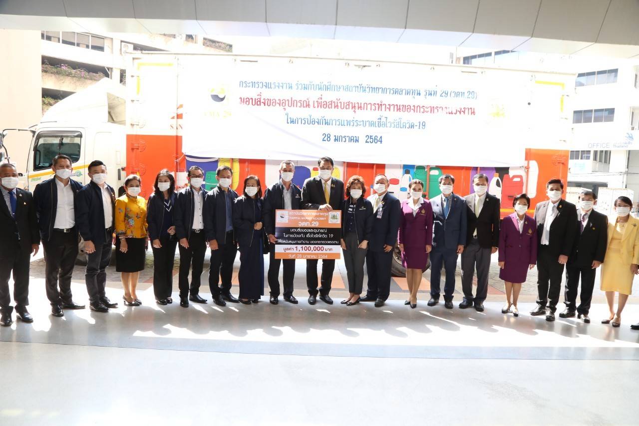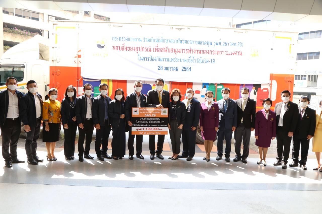 On January 28, 2021, at 13.00 hours, the Labour Minister welcomed Mr. Sumeth Boonsamrasuk leading the Capital Market Academy (CMA), Class 29, to meet and give supplies and equipment to prevent Covid-19 to the Ministry of Labour to deliver to Samut Sakhon, supporting government officials in preventing the spread of Covid-19. The occasion took place on the ground floor, Ministry of Labour. Assistant Minister from the Prime Minister’s Office performing duties at the Ministry of Labour Mr. Pornsak Charoenprasert, Advisor to the Labour Minister Mrs. Thiwalrat Angkinan, the Labour Minister’s Secretariat Mr. Suthep Chitayavong, the Permanent Secretary of Labour Mr. Suthi Sukosol and the Ministry of Labour’s executives, also joined the occasion. The supplies and equipment that the faculty from the Capital Market Academy (CMA), Class 29, brought to the Ministry of Labour included 70 sets of sprayers, 600 barrels of KEEEN Germ Killer, natural formula for virus disinfection, 1,120 pieces of N95 masks, 80 thermometers, 600 boxes of surgical masks, 200 pairs of shoe covers, 100 boxes of rubber gloves, and 694 sets of PPE kits. The supplies and equipment will be delivered to the Samut Sakhon government officials to continue supporting the work in preventing the spread of Covid-19.