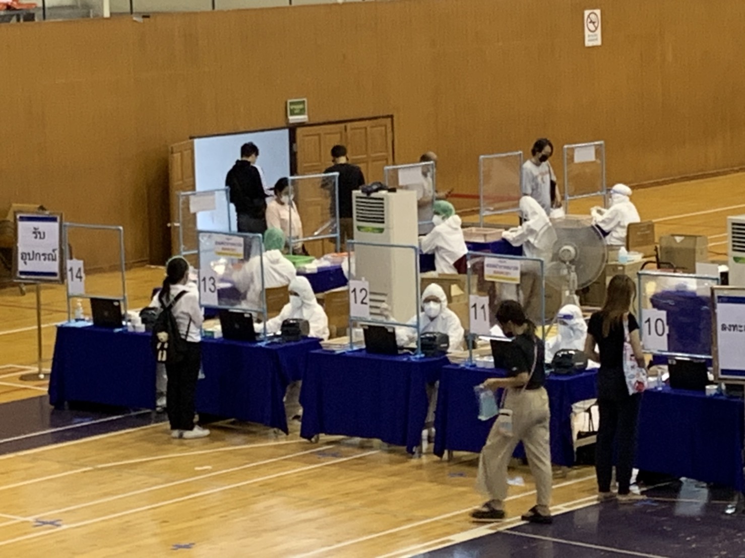 Labour Minister Mr. Suchart Chomklin reported the atmosphere of the proactive Covid-19 screening project for insured persons at the Thai-Japan Bangkok Youth Center in Din Daeng. He said it was a smooth first day, where everything followed the procedures and measures set by the Ministry of Health. The first insured person came to check-in at 07.39 hours.