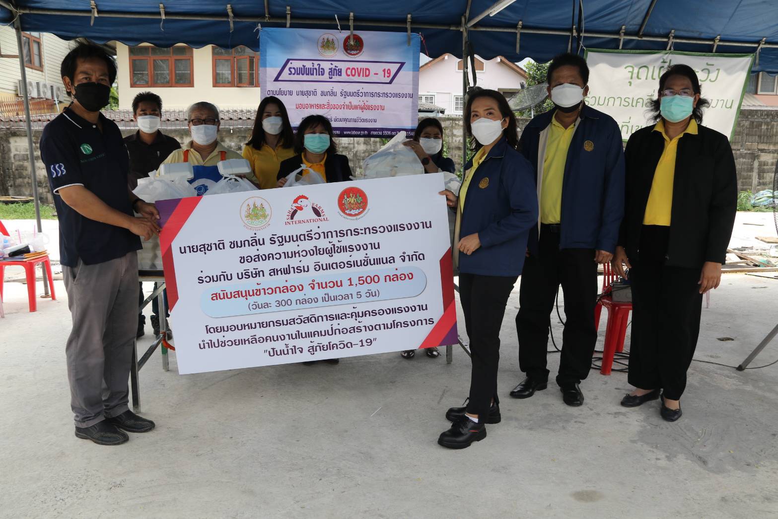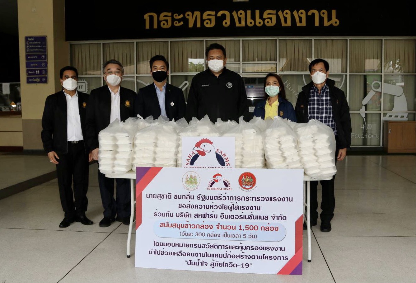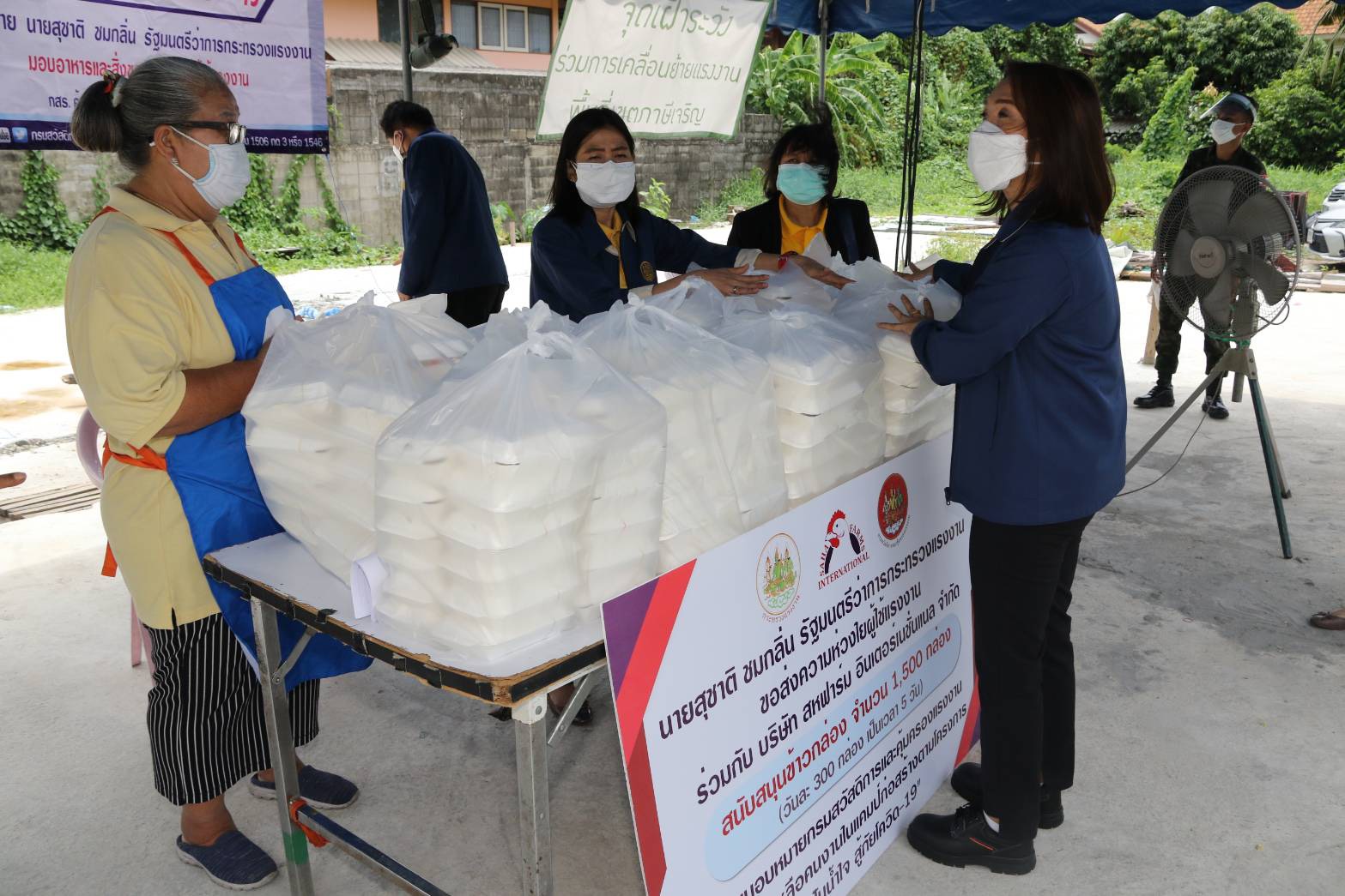Labour Minister Mr. Suchart Chomklin said with the escalating COVID-19 situation, the Ministry of Labour is concerned about the workforce, especially construction camp workers in quarantine, following the CCSA’s decision to close the worker camps in the dark red provinces for a month. The Ministry of Labour’s measures to help affected construction camp workers include working with the private sector in delivering food, drinks, and necessary goods to the construction worker camps. This is a supplementary measure, in addition to the Ministry of Labour’s request for employers to take care of all three meals for workers and the payment of unemployment benefits in case of unemployment at the rate of 50 percent of wages. Today, food boxes were delivered from Mr. Nattakit Rungjaroon, representative of Saha Farm International Co., Ltd., who supported the delivery of 300 food boxes daily for five days, totaling 1,500 boxes. The Labour Minister assigned the Deputy Director-General of the Department of Labour Protection and Welfare, Mrs. Sopa Kieatnircha, to deliver the food boxes to the construction camp workers to help alleviate the suffering. At the same time, she asked the workers to be confident that the Ministry of Labour will not abandon them and will stand to help workers and overcome this crisis together.