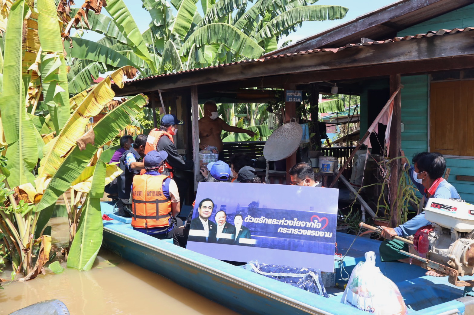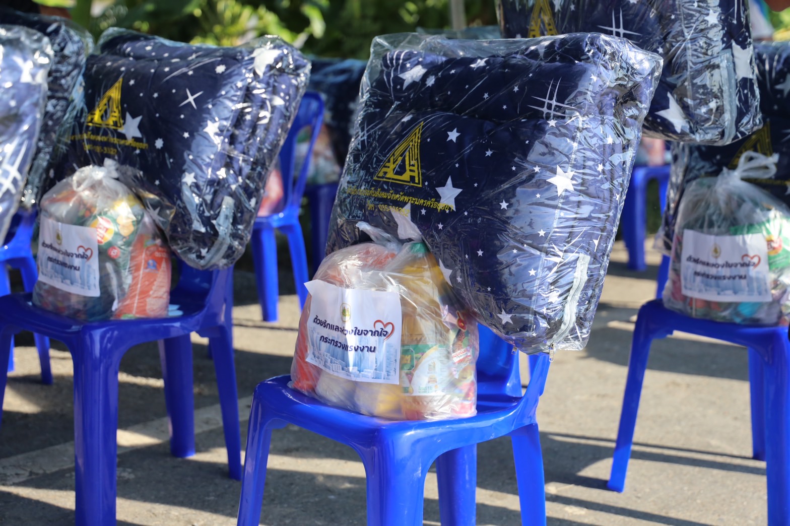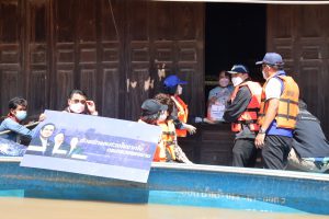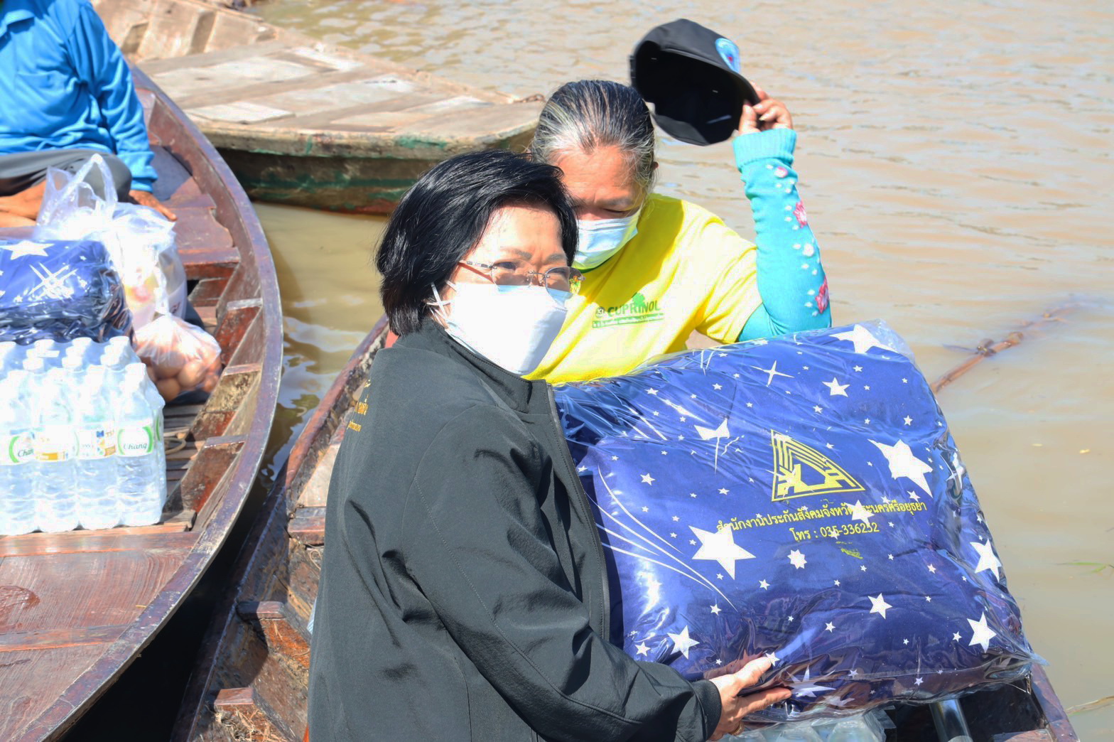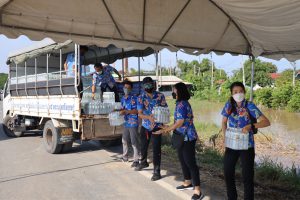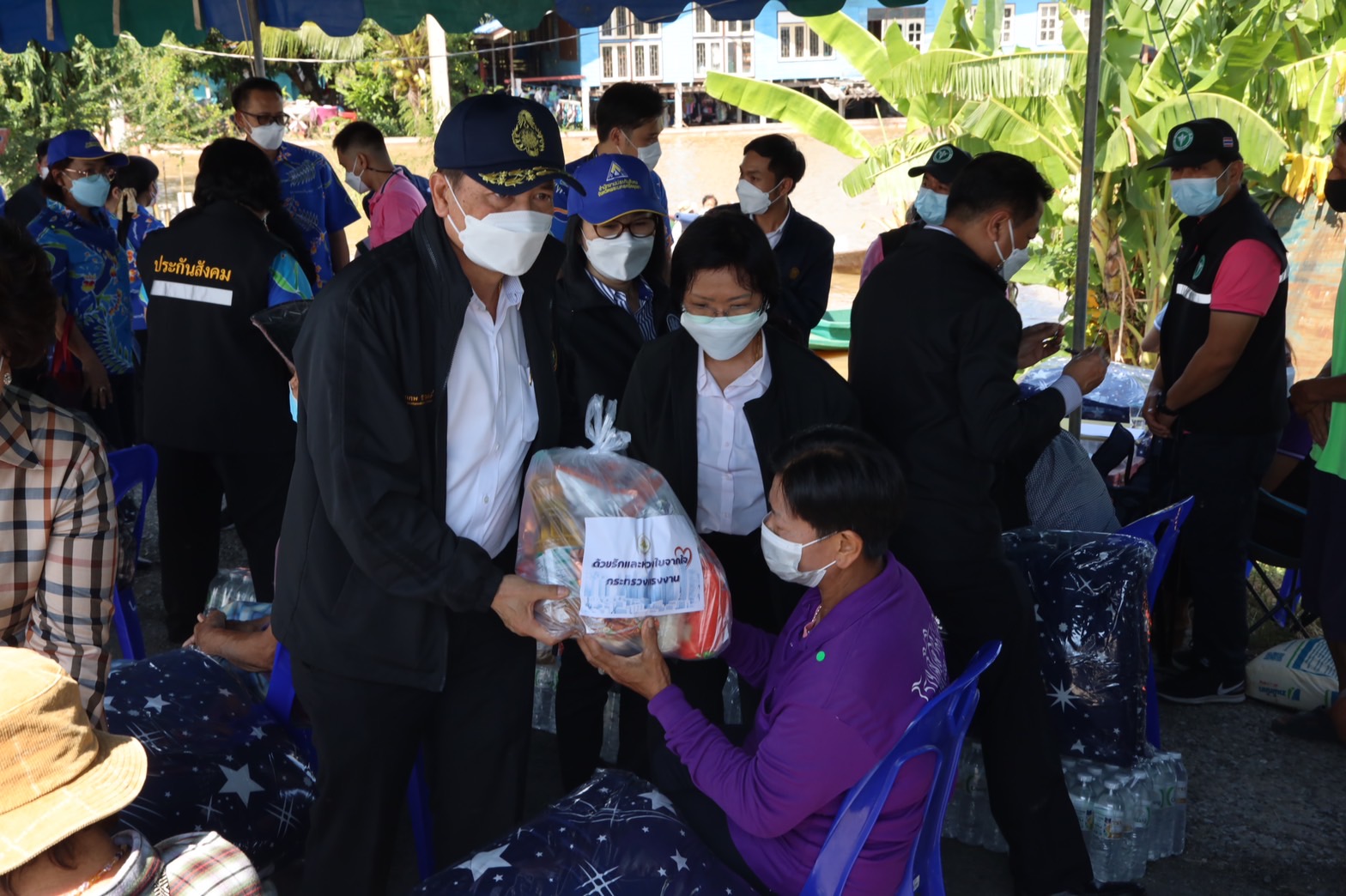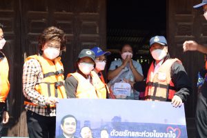 On October 5, 2021, Labour Minister Mr. Suchart Chomklin assigned Secretariat to the Labour Minister Mr. Suthep Chitayawong and Deputy Permanent Secretary of Labour Ms. Aumpun Thuwawit, to visit the area to support and donate 100 survival bags to flood victims at Thang Chang Subdistrict, Bang Ban District, Phra Nakhon Si Ayutthaya Province. The visit took place together with the Governor of Phra Nakhon Si Ayutthaya Province, Mr. Weerachai Nakmat. In this regard, the Social Security Office’s Secretary-General, Mr. Boonsong Thapchaiyut, assigned the Social Security Office’s Chief Inspector-General, Ms. Pailin Jindamaneeporn, to join the group. Mrs. Potjanart Suthiporn, Phra Nakhon Si Ayutthaya Provincial Social Security Officer, and the head of the Phra Nakhon Si Ayutthaya provincial governments, gave a welcoming.