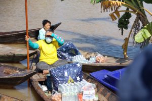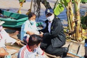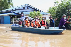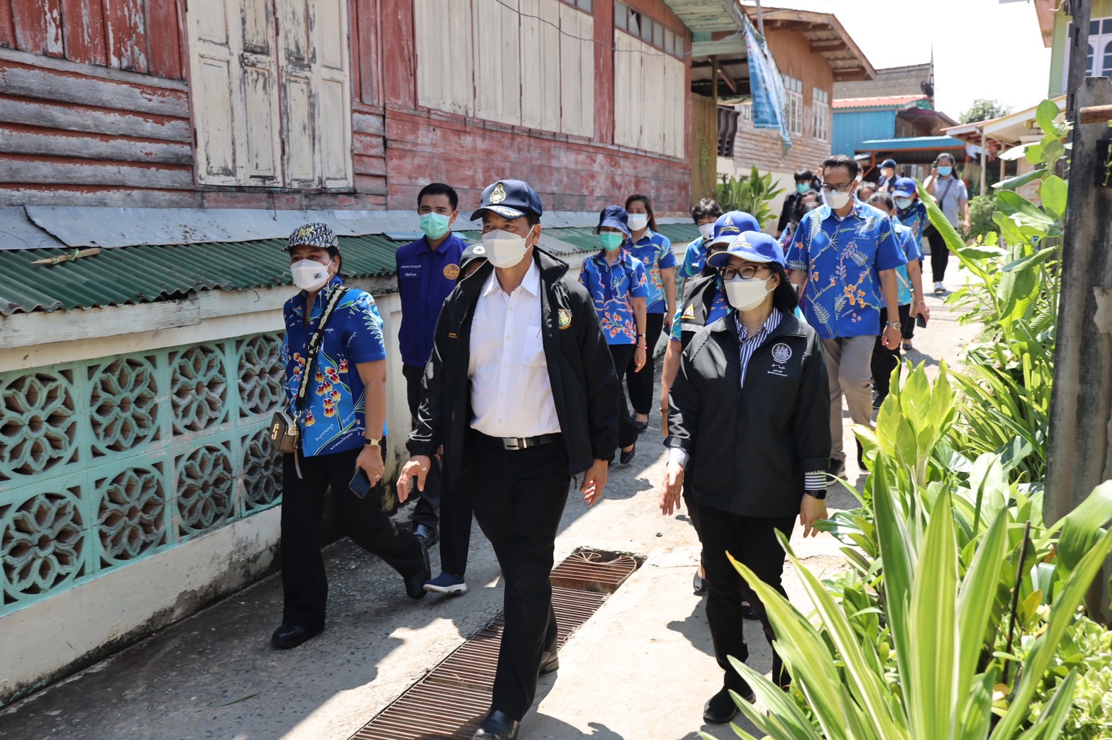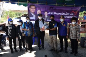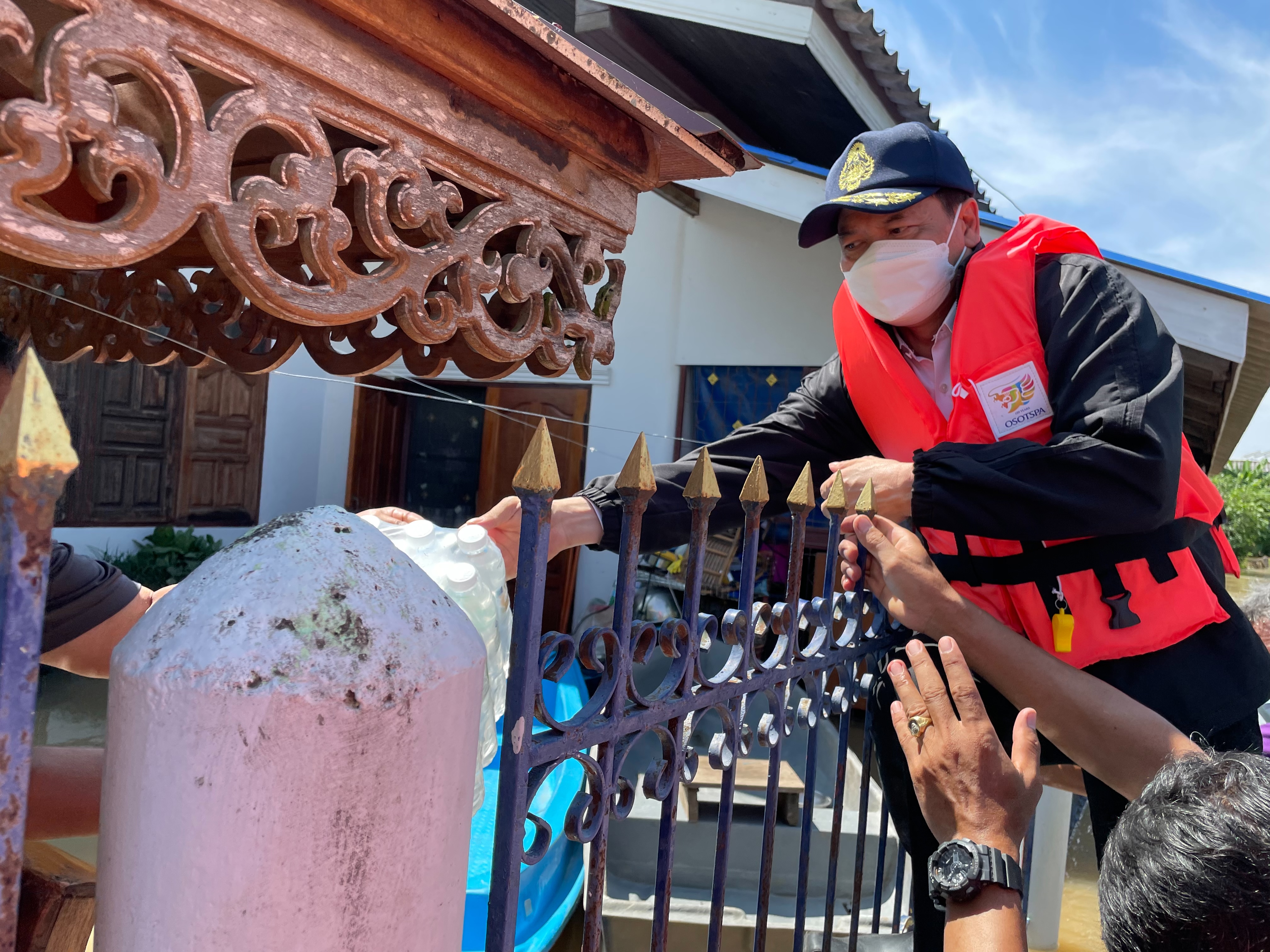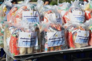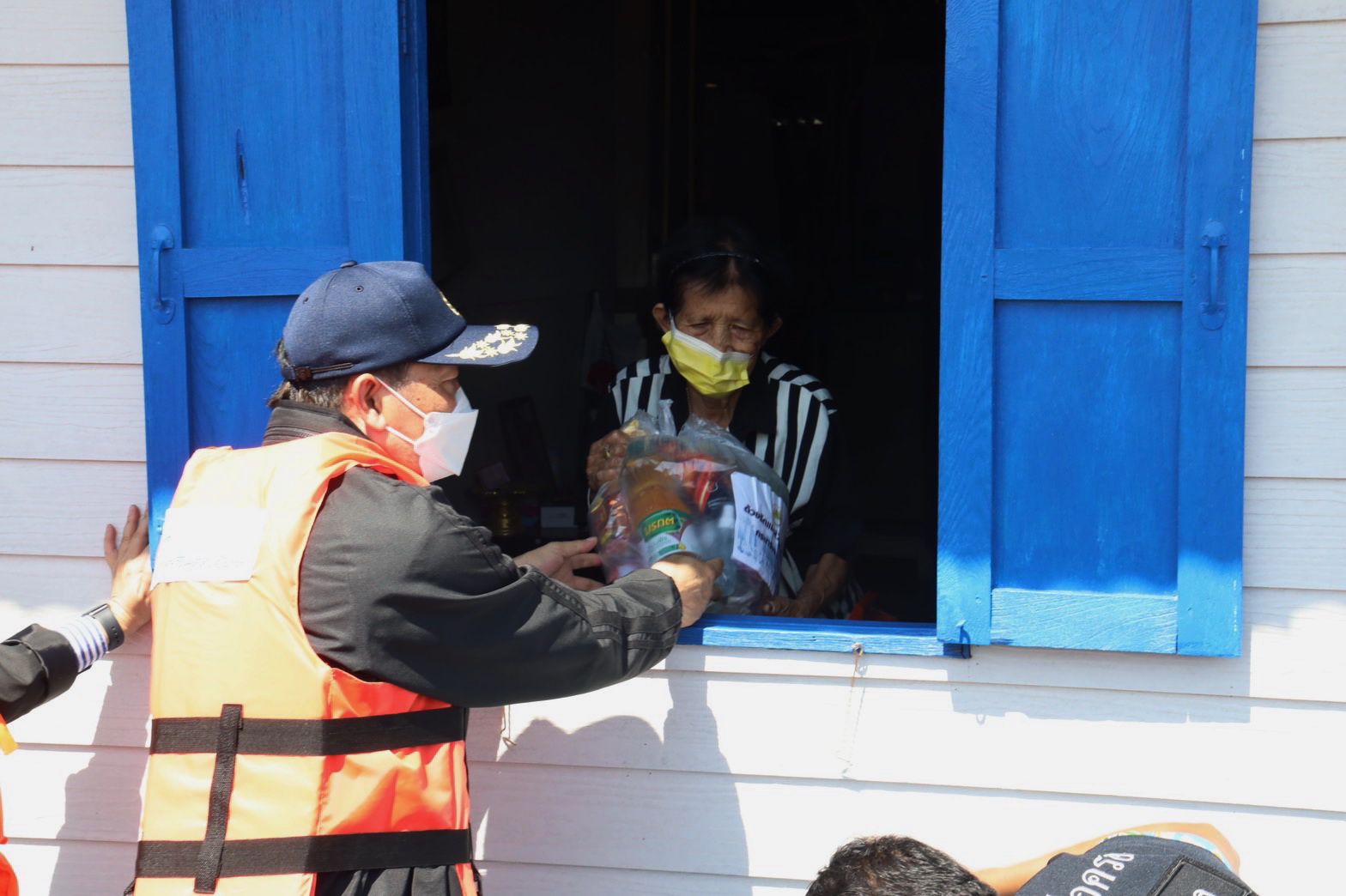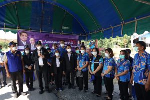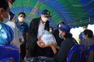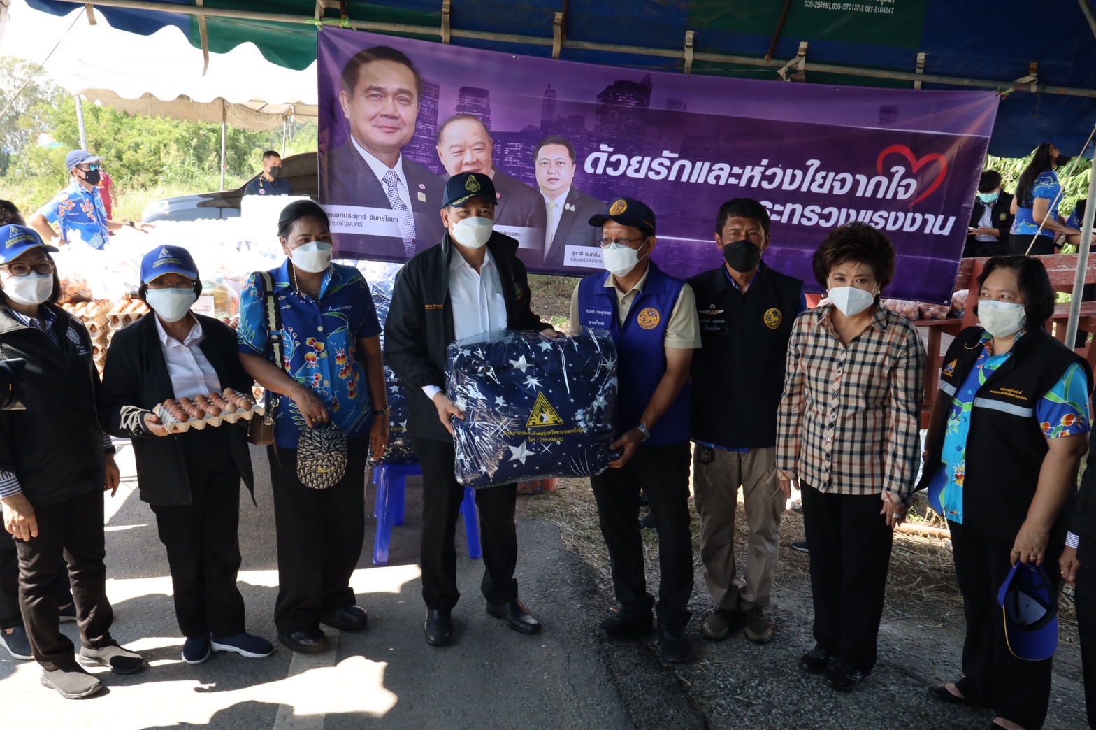 On October 5, 2021, Labour Minister Mr. Suchart Chomklin assigned Secretariat to the Labour Minister Mr. Suthep Chitayawong and Deputy Permanent Secretary of Labour Ms. Aumpun Thuwawit, to visit the area to support and donate 100 survival bags to flood victims at Thang Chang Subdistrict, Bang Ban District, Phra Nakhon Si Ayutthaya Province. The visit took place together with the Governor of Phra Nakhon Si Ayutthaya Province, Mr. Weerachai Nakmat. In this regard, the Social Security Office’s Secretary-General, Mr. Boonsong Thapchaiyut, assigned the Social Security Office’s Chief Inspector-General, Ms. Pailin Jindamaneeporn, to join the group. Mrs. Potjanart Suthiporn, Phra Nakhon Si Ayutthaya Provincial Social Security Officer, and the head of the Phra Nakhon Si Ayutthaya provincial governments, gave a welcoming.