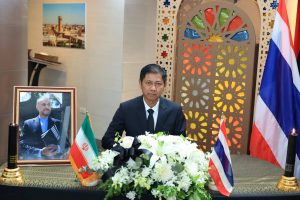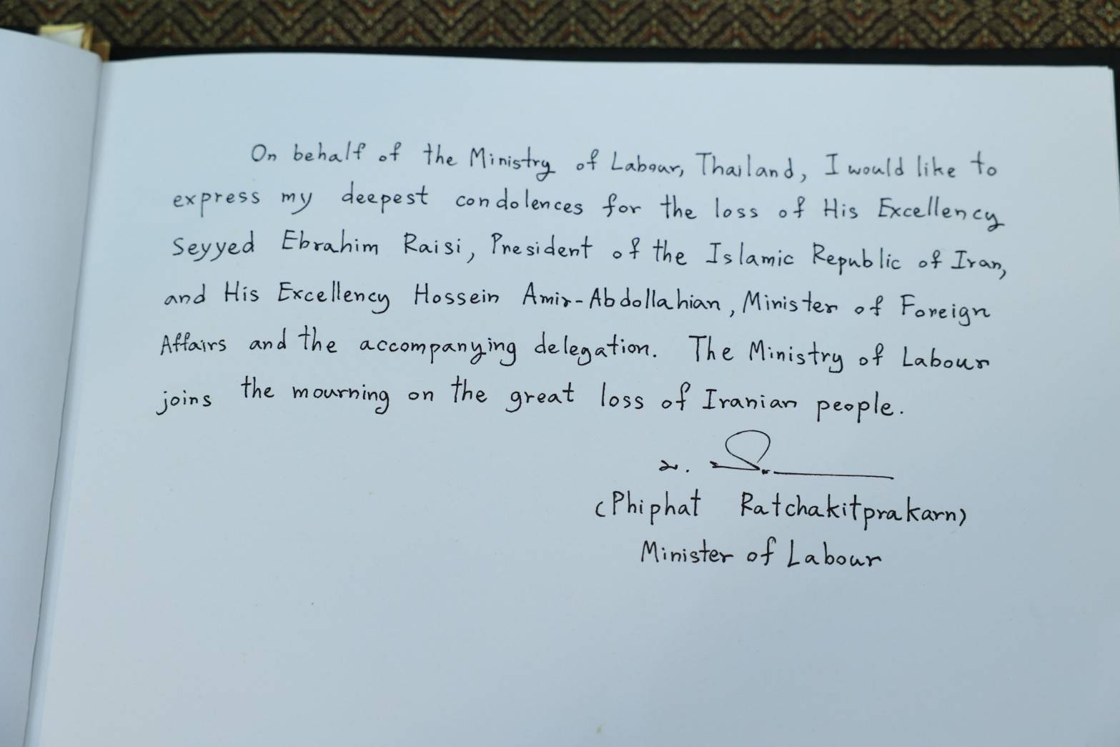 On May 24, 2024, at 10.00 hours, the Labour Minister, Mr. Phiphat Ratchakitprakarn, led the Ministry of Labour’s executives to sign a book of condolences on the passing of the President of the Islamic Republic of Iran, His Excellency Dr. Seyyed Ebrahim Raisi. The Permanent Secretary of Labour, Mr. Pairoj Chotikasathien, the Ministry of Labour’s Inspector-General, Mr. Samat Pattamasukon, the Assistant to the Permanent Secretary of Labour, Mr. Sakdinart Sonthisakyotin, and the Ministry of Labour’s executives joined in signing the book at the Embassy of the Islamic Republic of Iran in Thailand, Sukhumvit Road, Watthana District, Bangkok.