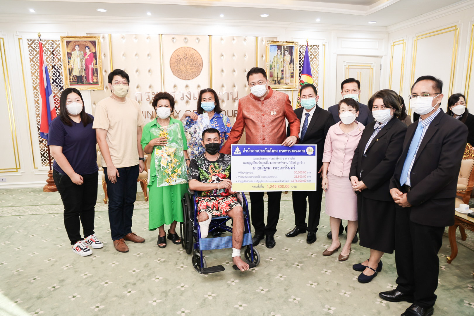On November 15, 2022, the Labour Minister, Mr. Suchart Chomklin, provided compensation in the case of loss of income and loss of organs due to work to Mr. Nattaphon Dechkessarin, an employee who had an accident while driving a car where he crashed into a construction line in Samut Sakhon Province. The Ministry of Labour’s executives also joined the occasion at the Chatumongkol Room, 6th floor, Ministry of Labour.
