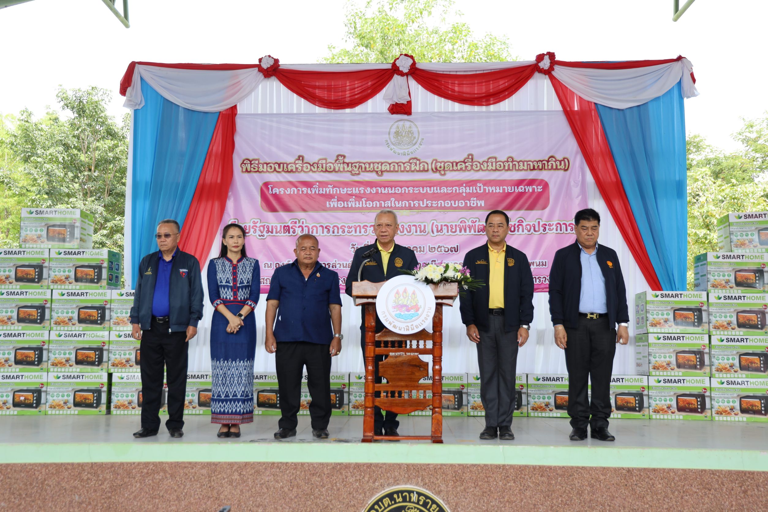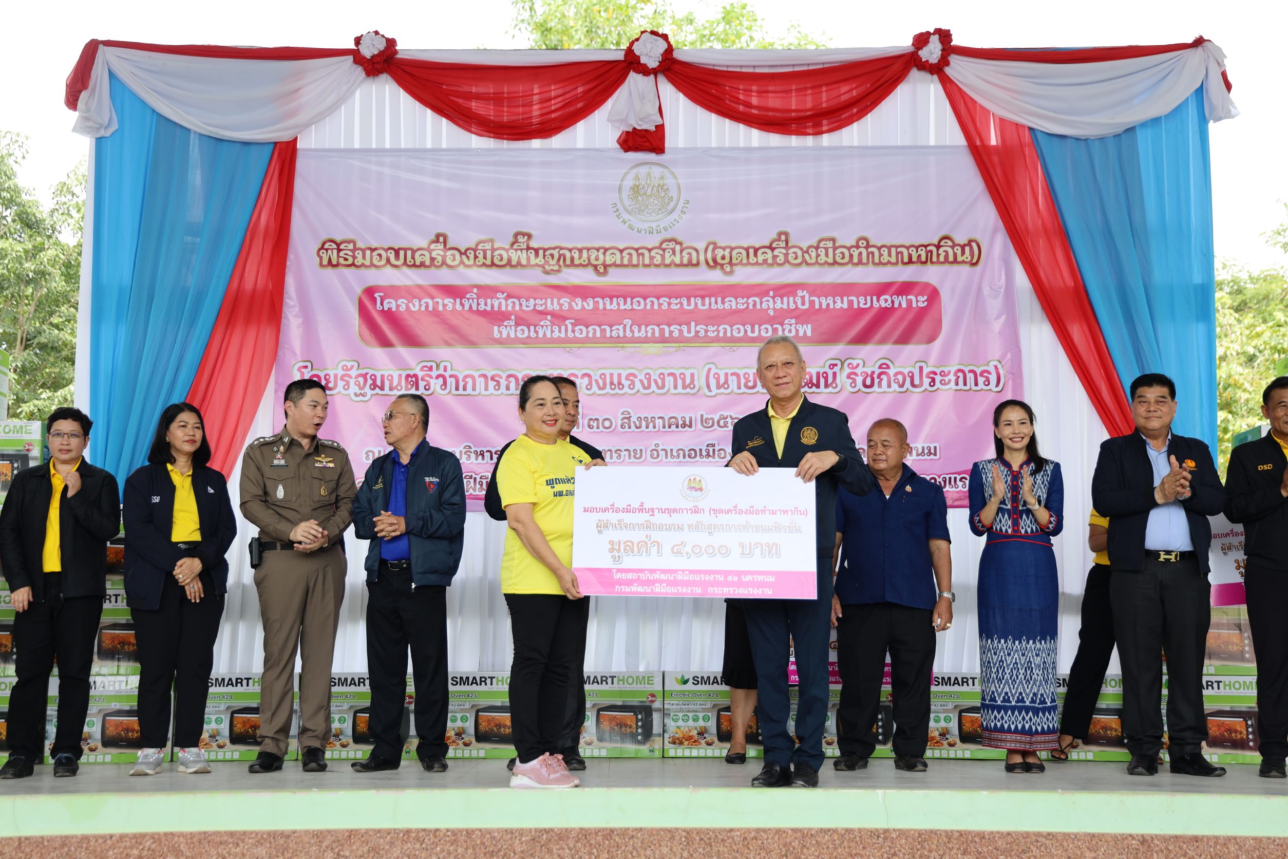 Then, Mr. Phipat presided over the ceremony to present livelihood tools to those who completed training to upgrade their skills under the project to develop skills of informal workers and specific target groups to enhance career opportunities through activities to develop their skills in line with individual abilities for employment in the 2024 fiscal year. The training was organized by the Nakhon Phanom Skill Development Institute 41, Na Sai Subdistrict Administrative Organization, Mueang Nakhon Phanom District. Mr. Phiphat said that he was pleased and honoured to preside over the ceremony to present essential training tools (livelihood tools) to those who completed the training to upgrade their skills under the project to upgrade the skills of informal workers (freelance occupations) to enhance their career opportunities, organized by the Nakhon Phanom Skill Development Institute 41 today. This project has a target group of state welfare cardholders with basic career skills and informal workers (freelance occupations) who want to learn new skills and receive support that focuses on creating career opportunities, increasing household income, and supporting local resources in line with the context of the area.