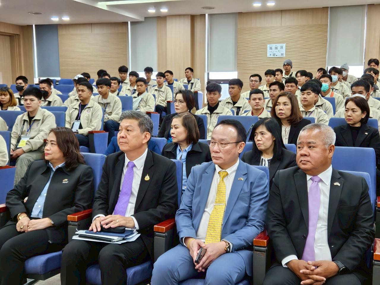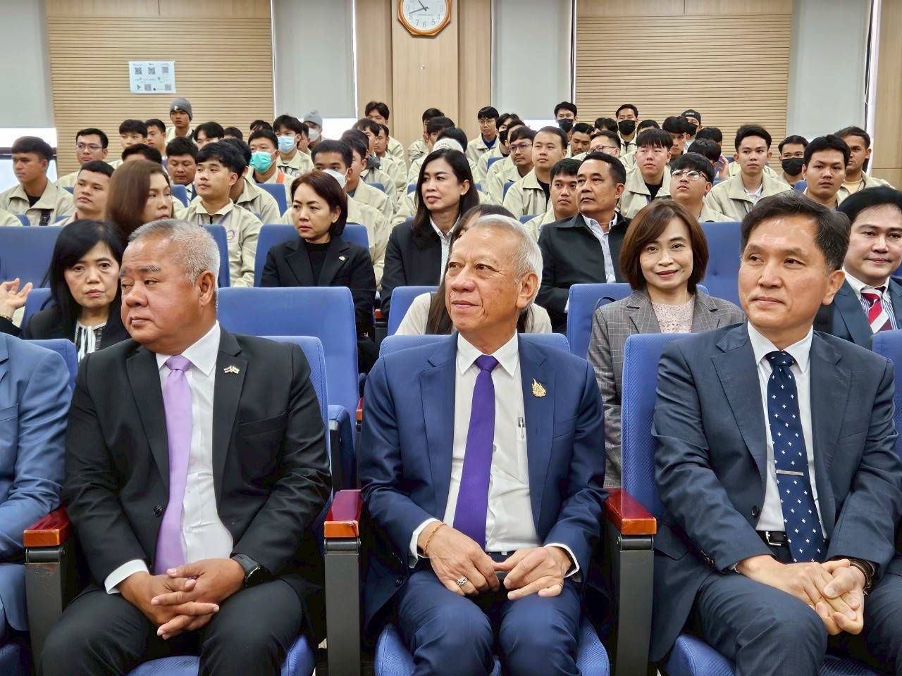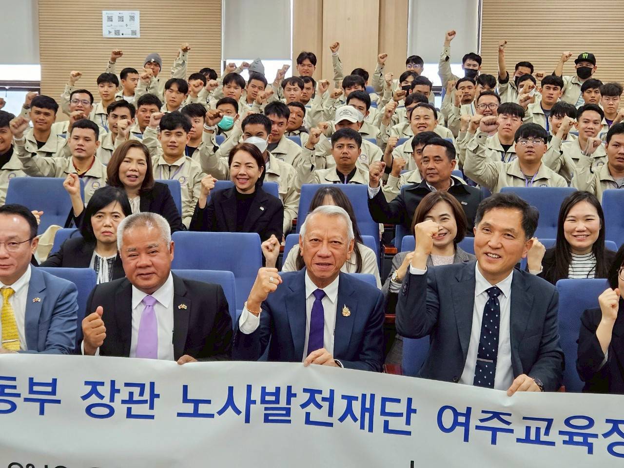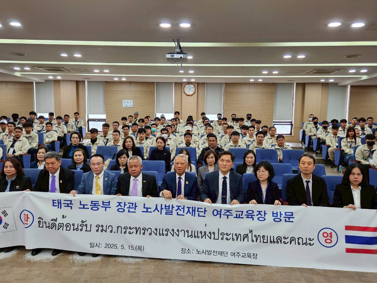 May 15, 2025, 10.00 hours (KST) – Mr. Phiphat Ratchakitprakarn, Minister of Labour, together with Mr. Boonsong Thapchaiyut, Permanent Secretary of Labour, Mr. Somchai Morakotsriwan, Director-General of the Department of Employment, Mrs. Sirirat Srichart, Labour Minister-Counsellor at the Royal Thai Embassy in Seoul, and delegation visited 119 newly arrived Thai workers at the Yeoju Training Center for New Foreign Workers, operated by the Korea Labour and Employment Foundation (KLEF) under South Korea’s Ministry of Employment and Labour. The visit aimed to show moral support on the workers’ first day of EPS training, following their arrival in South Korea the previous day.