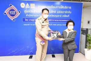 Labour Minister Mr. Suchart Chomklin led a team to Pathum Thani to visit the Rights Review Coordination Center’s services for the Section 33 We Love Each Other project at the Social Security Office in the Mobile Coordination Center at Demco PCL, Pathum Thani.