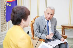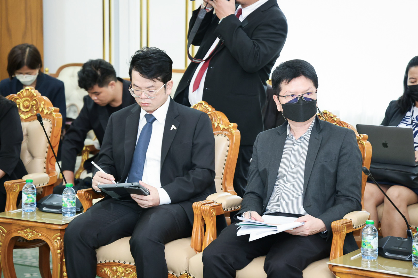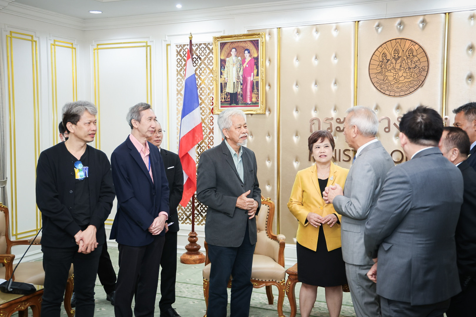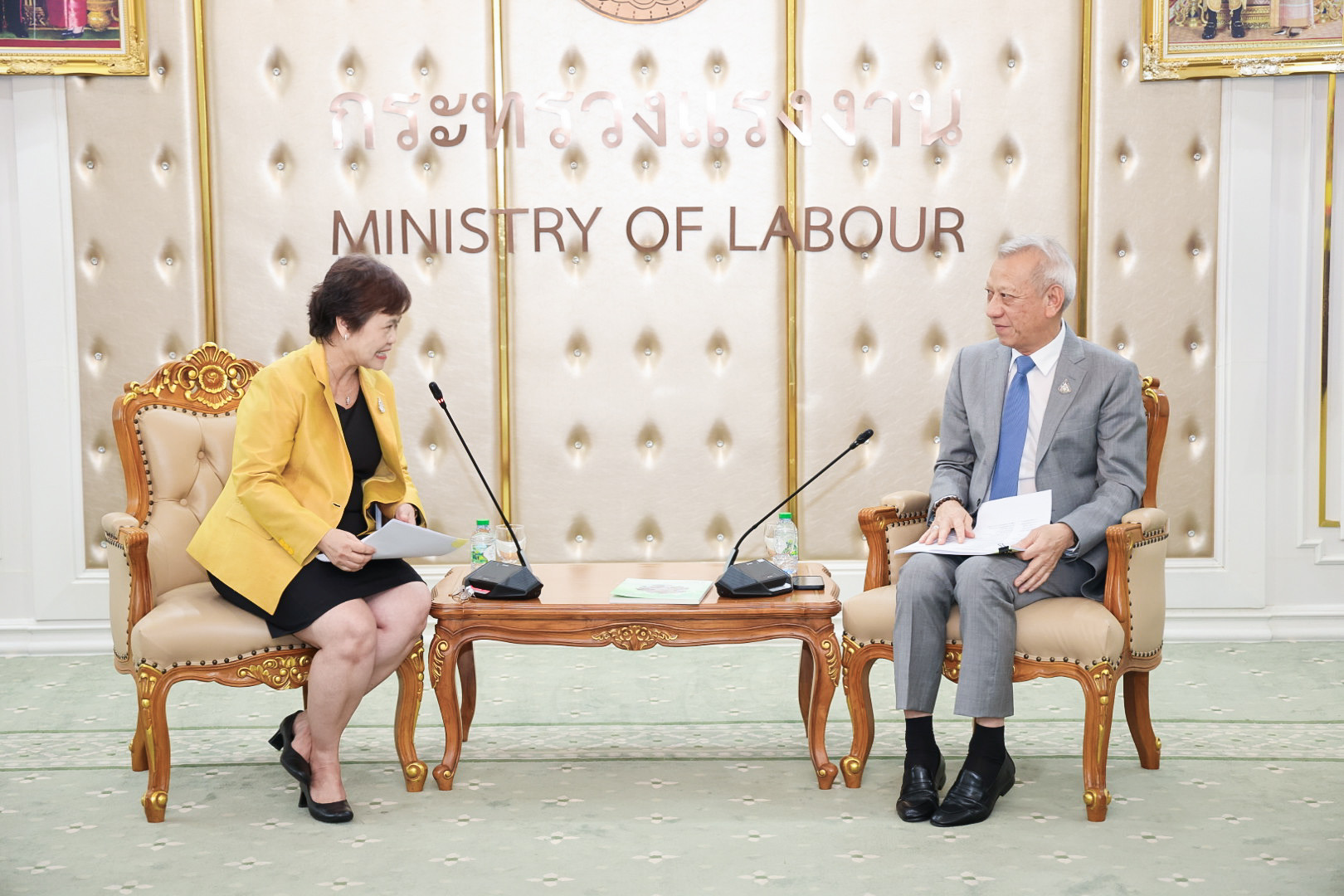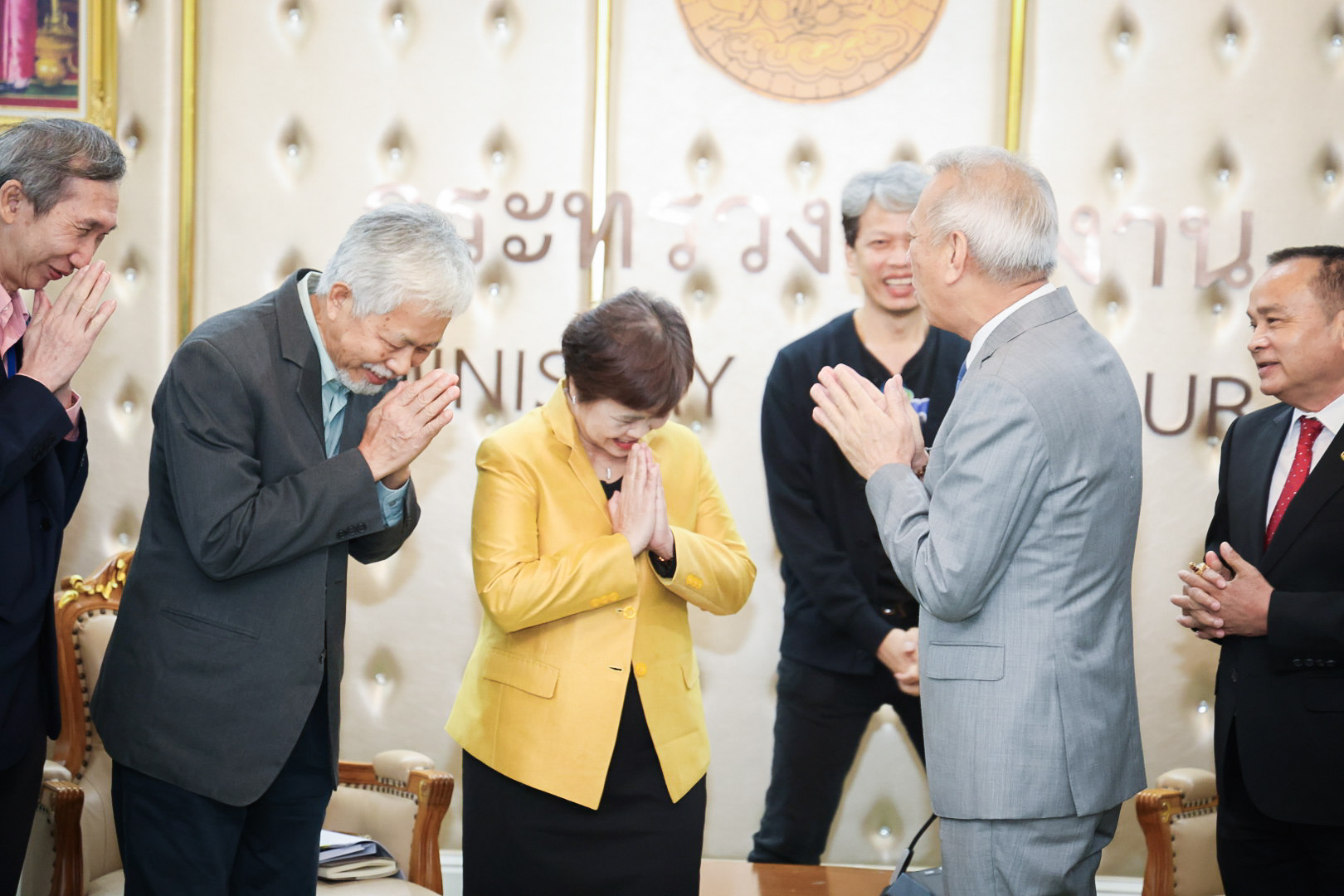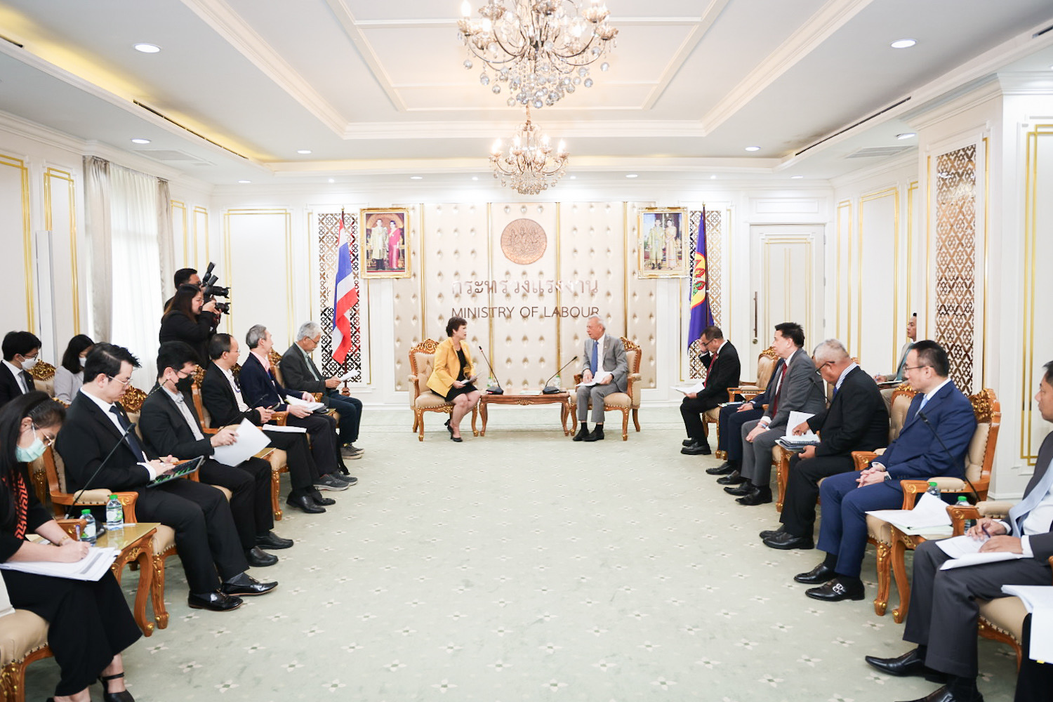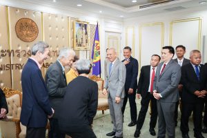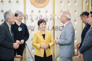 On June 6, 2024, at 13.30 hours, the Labour Minister, Mr. Phiphat Ratchakitprakarn, welcomed the Chairperson of the National Human Rights Commission, Ms. Supattra Nakaphiw, and the committee, on the occasion of a meeting to discuss joint operations with the Ministry of Labour. The Secretariat to the Labour Minister, Mr. Aree Krainara, from the Prime Minister’s Secretariat’s Office, performing duties for the Ministry of Labour, Mr. Phuchong Worasri, the Permanent Secretary of Labour, Mr. Pairoj Chotikasathien, the Social Security Office’s Secretary-General, Mr. Boonsong Thapchaiyut, the Department of Employment’s Director-General, Mr. Somchai Morakotsriwan, and the Ministry of Labour’s executives joined the occasion at the Chatumongkol Room, 6th floor, Ministry of Labour.