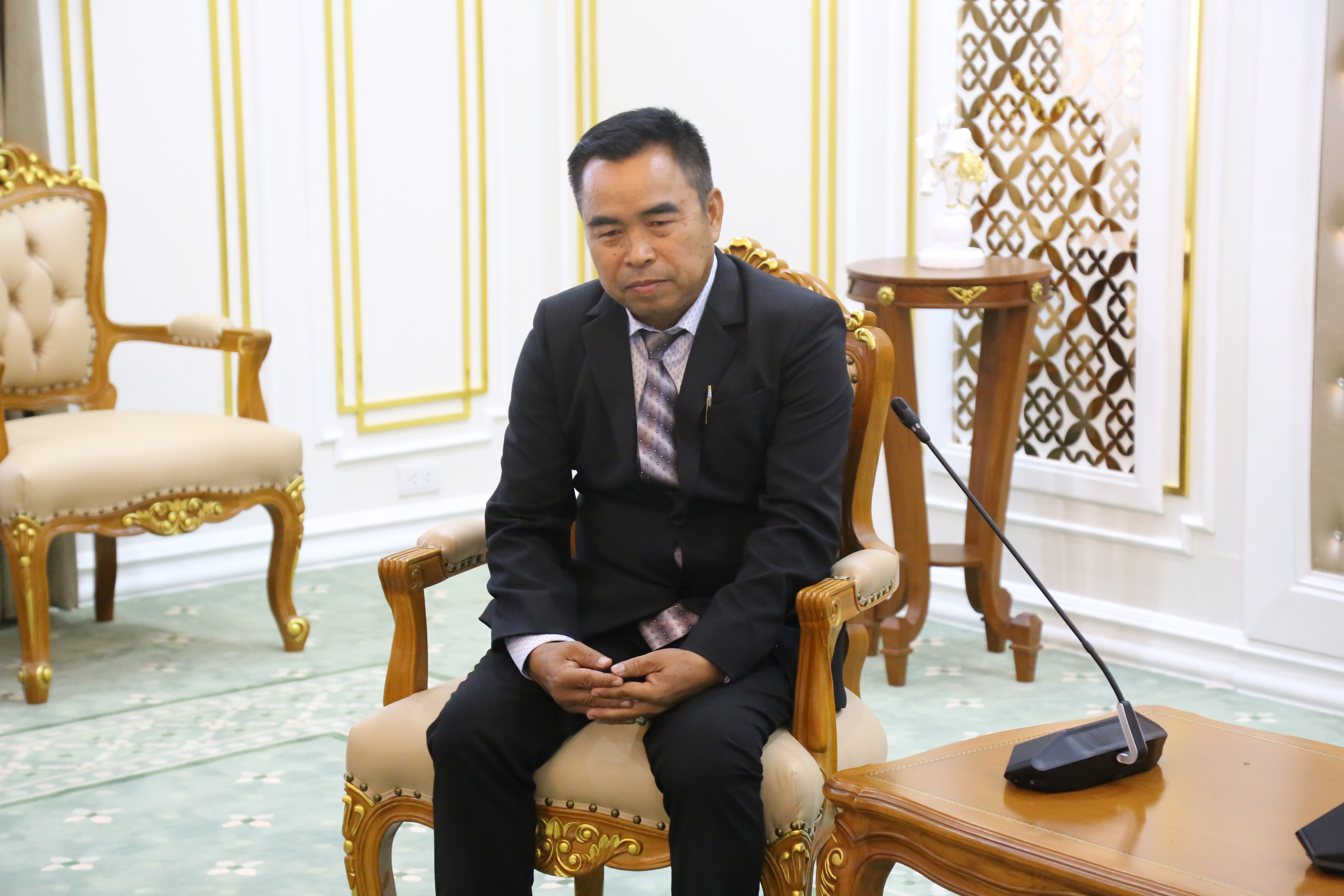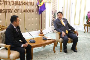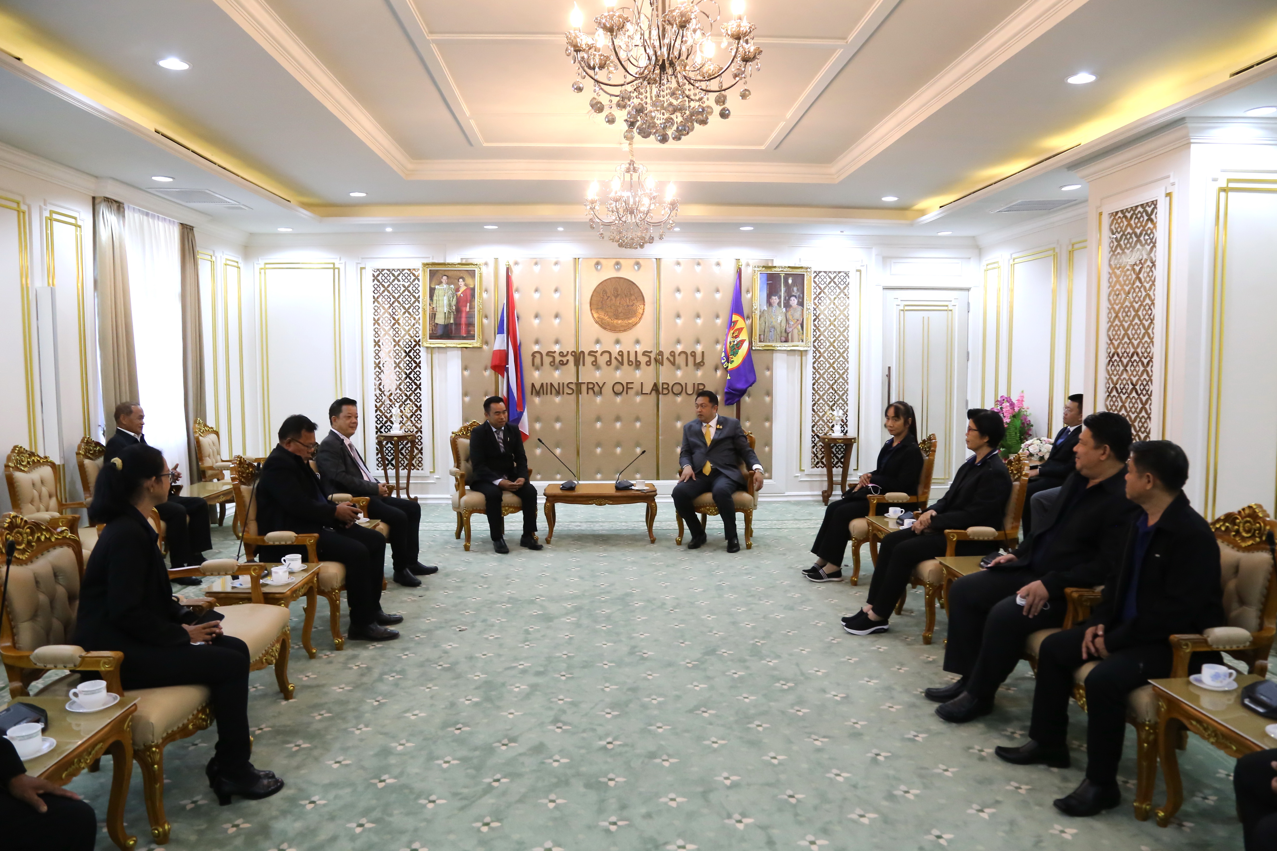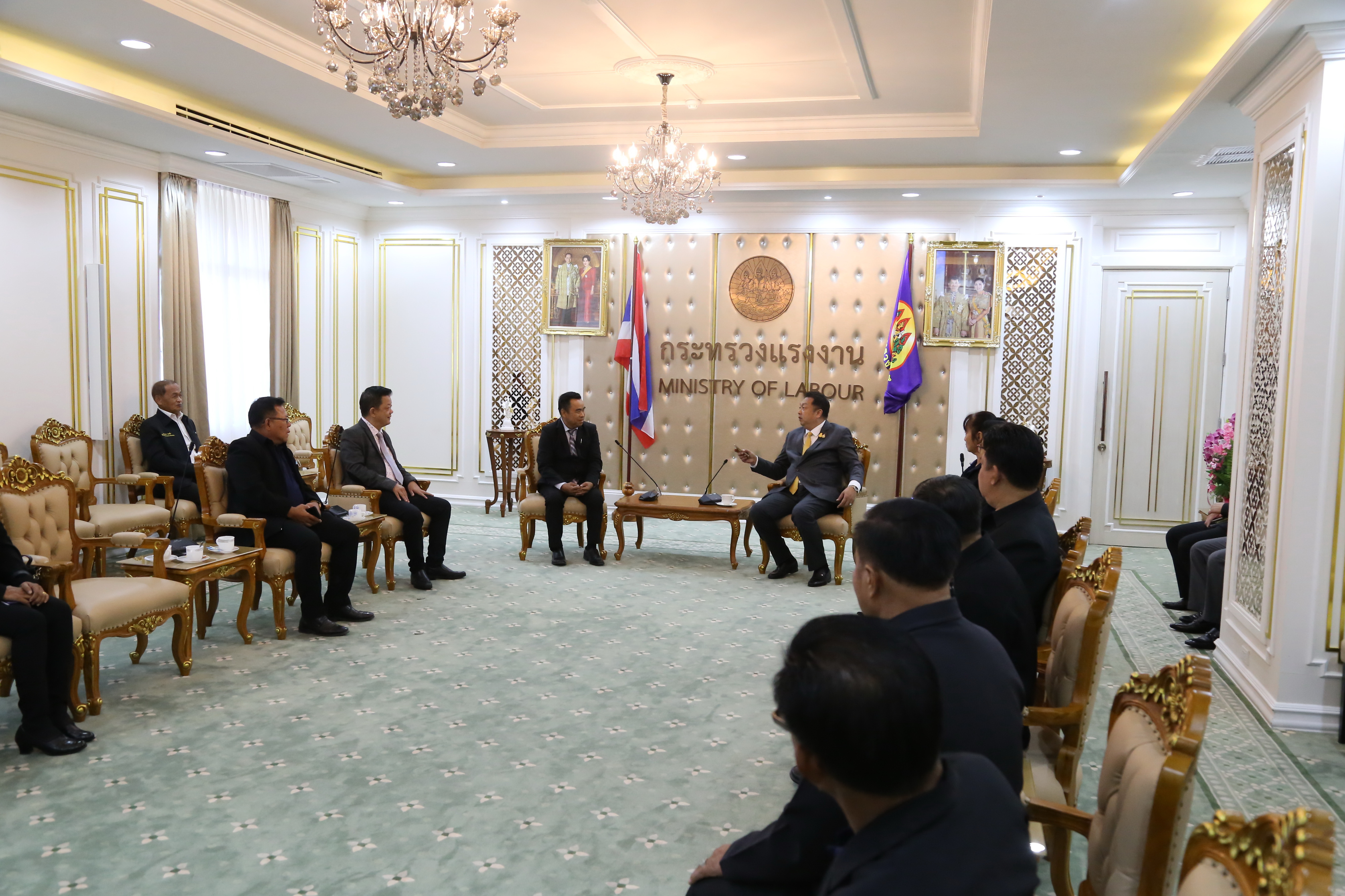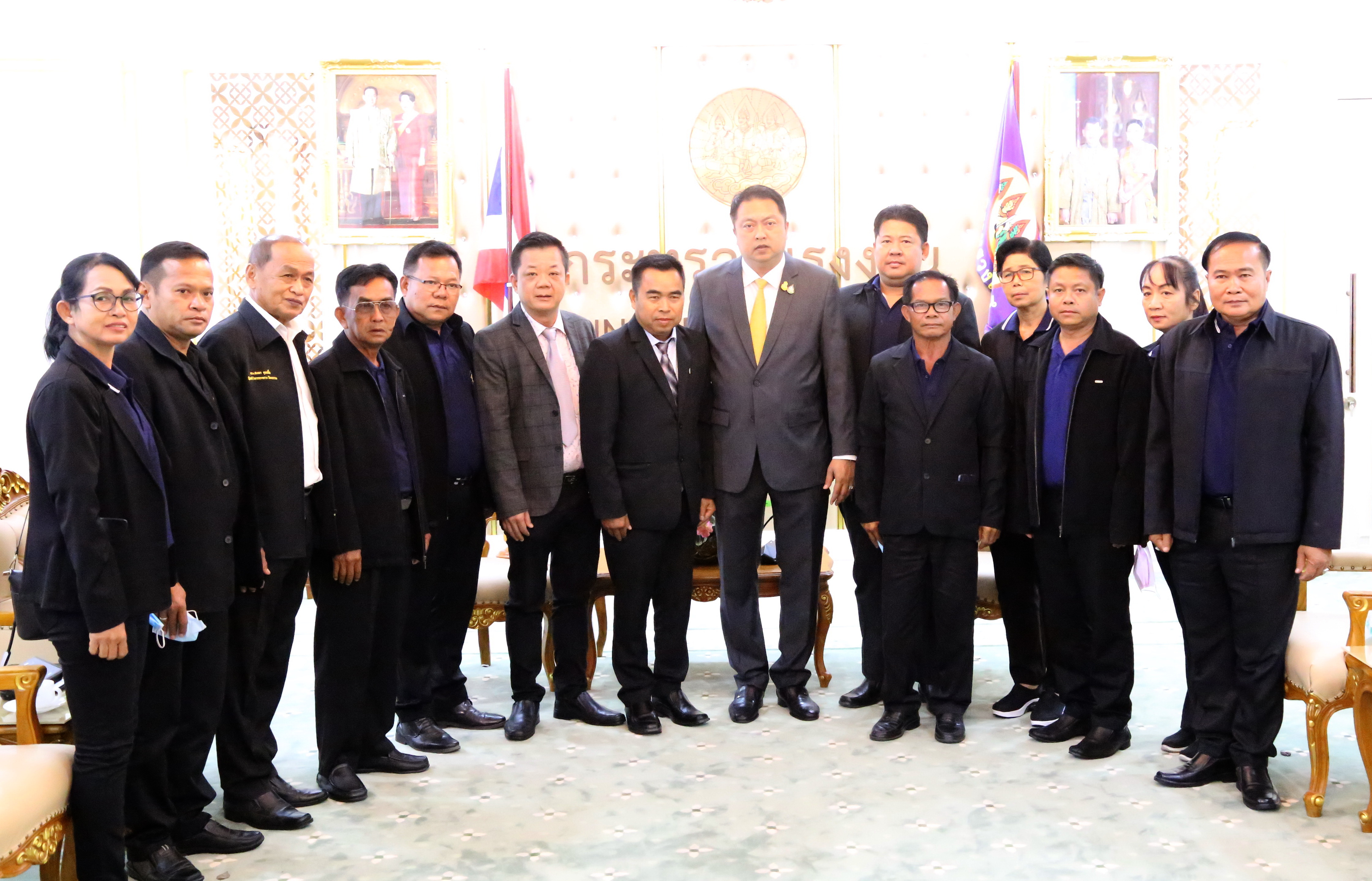On September 11, 2020, at 11.30 hours, Labour Minister Mr. Suchart Chomklin welcomed the Chairman of Nong Hiang Subdistrict Administrative Organization Mr. Mongkon Niyom, and the committee met to congratulate him on the occasion of taking his position as Labour Minister and to discuss labour issues. The meeting took place at the Jatumongkol Room, 6th floor, Ministry of Labour.