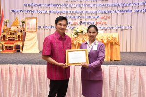 Assoc. Prof. Dr. Jak also praised the labour volunteers for having a volunteer spirit and sacrifice for the public. In working with the Ministry of Labour, the volunteers act as a medium for cooperation, helping to liaise with government agencies under the Ministry of Labour and people who experience labour problems in the community and society that they are involved in. The volunteers are always on the lookout for unfair labour practices, issues in using foreign workers in the local area, launching awareness campaigns and strengthening immunity in drug prevention for employees/employers in workplaces with less than 10 employees to be aware of drug problems. Currently, Roi Et has 193 labour volunteers in the district as a medium for cooperation. They help liaise with government agencies under the Ministry of Labour and people experiencing labour problems in the community. In addition, Assoc. Prof. Dr. Jak has handed the Skill Standard Certificate of Patient’s Helper (NA) at the Level 1 skills, at Churavej Hospital.