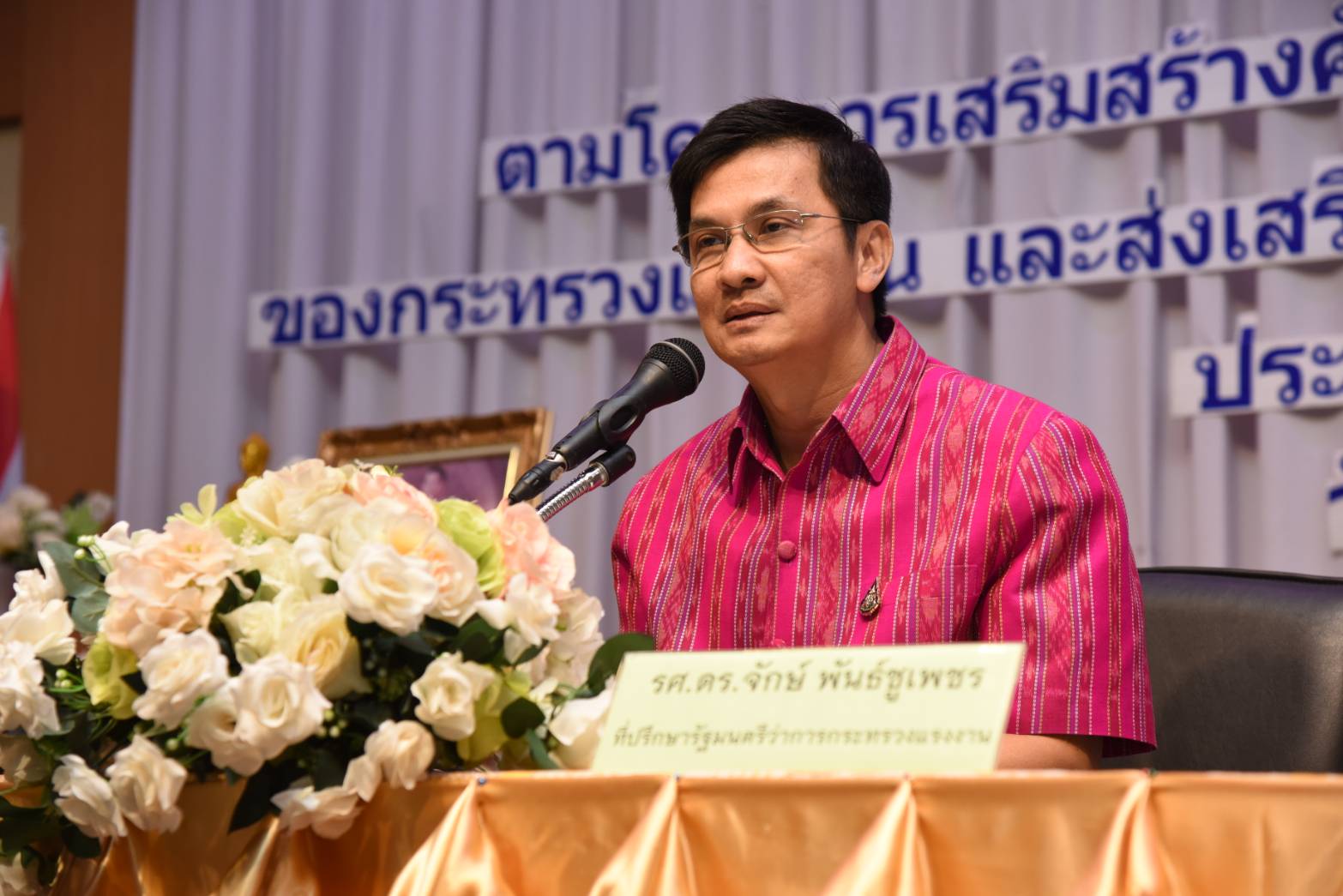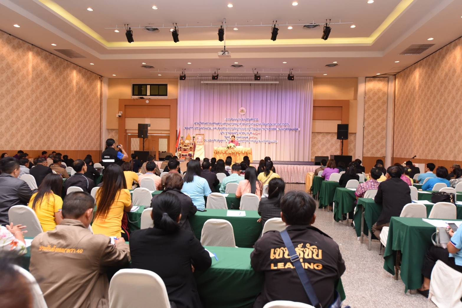 On February 28, 2020, at 10.00 hours, Advisor to the Labour Minister Assoc. Prof. Dr. Jak Punchoopet presided over the opening ceremony of the workshop on capacity building for labour volunteers to integrate with the mission of the Ministry of Labour. The workshop aims to promote the prevention and resolution of drug issues in Roi Et for 2020 and took place at the Praduen room, Petcharat Garden Hotel, Nuea Mueang, Mueang Roi Et, Roi Et. Deputy Provincial Governor of Roi Et Mr. Tavee Jongprasert gave a welcome speech and Labour Academic Export Ms. Achaniya Mai, acting Labour Officer for Roi Et gave a report. The Labour Minister’s Advisor said that labour volunteers are essential players in the operations in all areas, whether it is public health, community development, disaster prevention, and mitigation, protecting the environment, security, justice, or labour. Each department will appoint volunteers to help with all operations. It can be considered that volunteers are people with great sacrifice, as volunteers are people who sacrifice their time that should be spent as a career or time from their personal and family lives. They are essential people to the development of the country and a significant force to work with both government and private organizations to help people who are suffering. He said that he would like to encourage everyone to study and exchange experiences from speakers and cooperate in various activities of the training for development. This will help the volunteers themselves and labour missions. When the training is finished, he said he encouraged the volunteers to apply their knowledge to perform in their duties, which will benefit the people, villages, communities, and families more efficiently and effectively.
