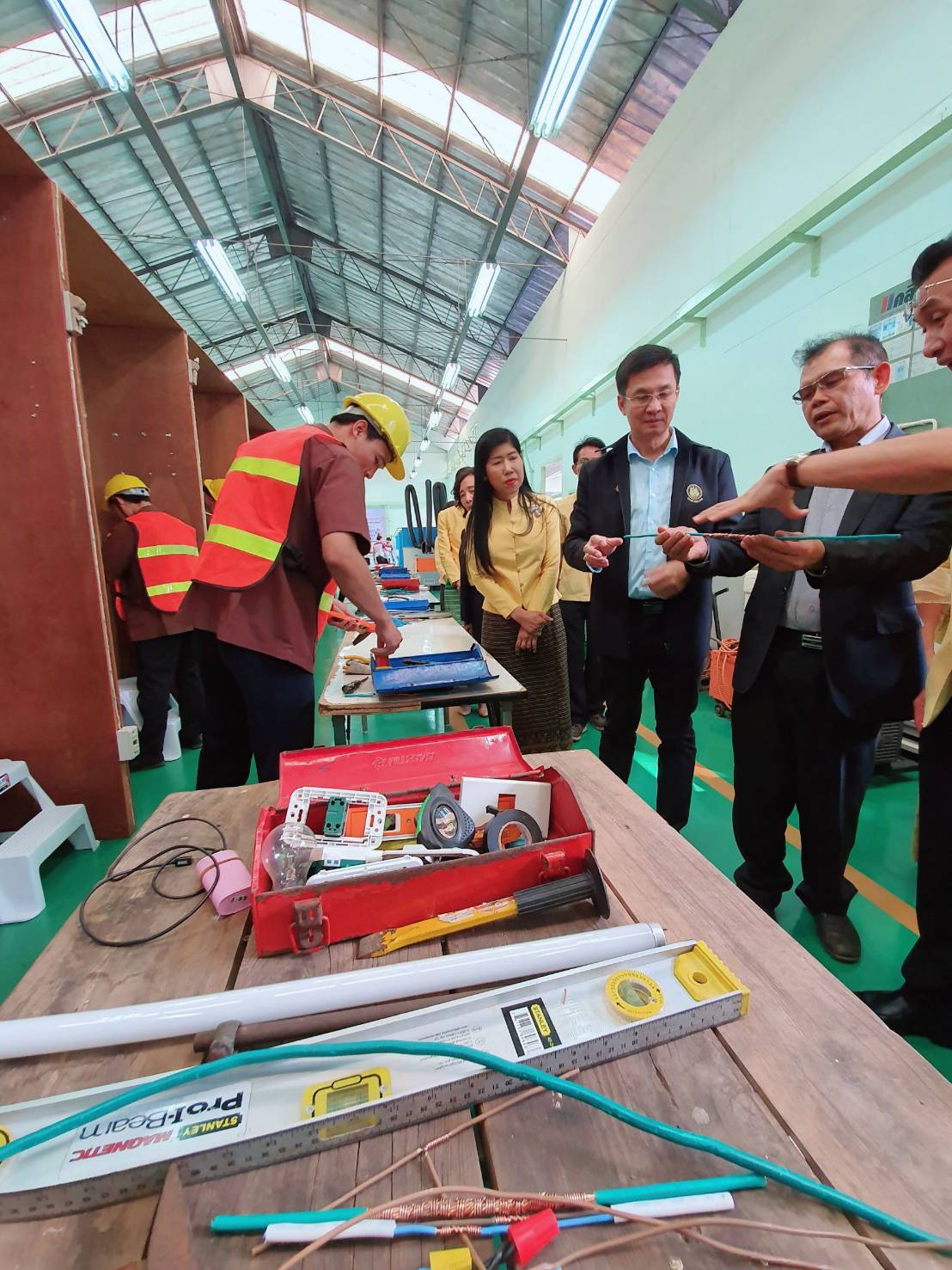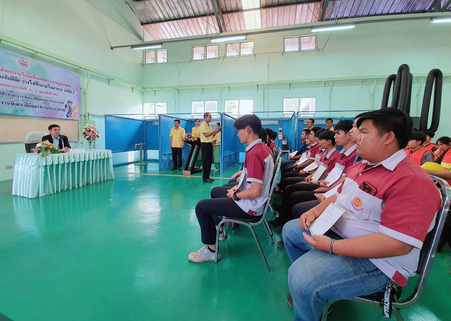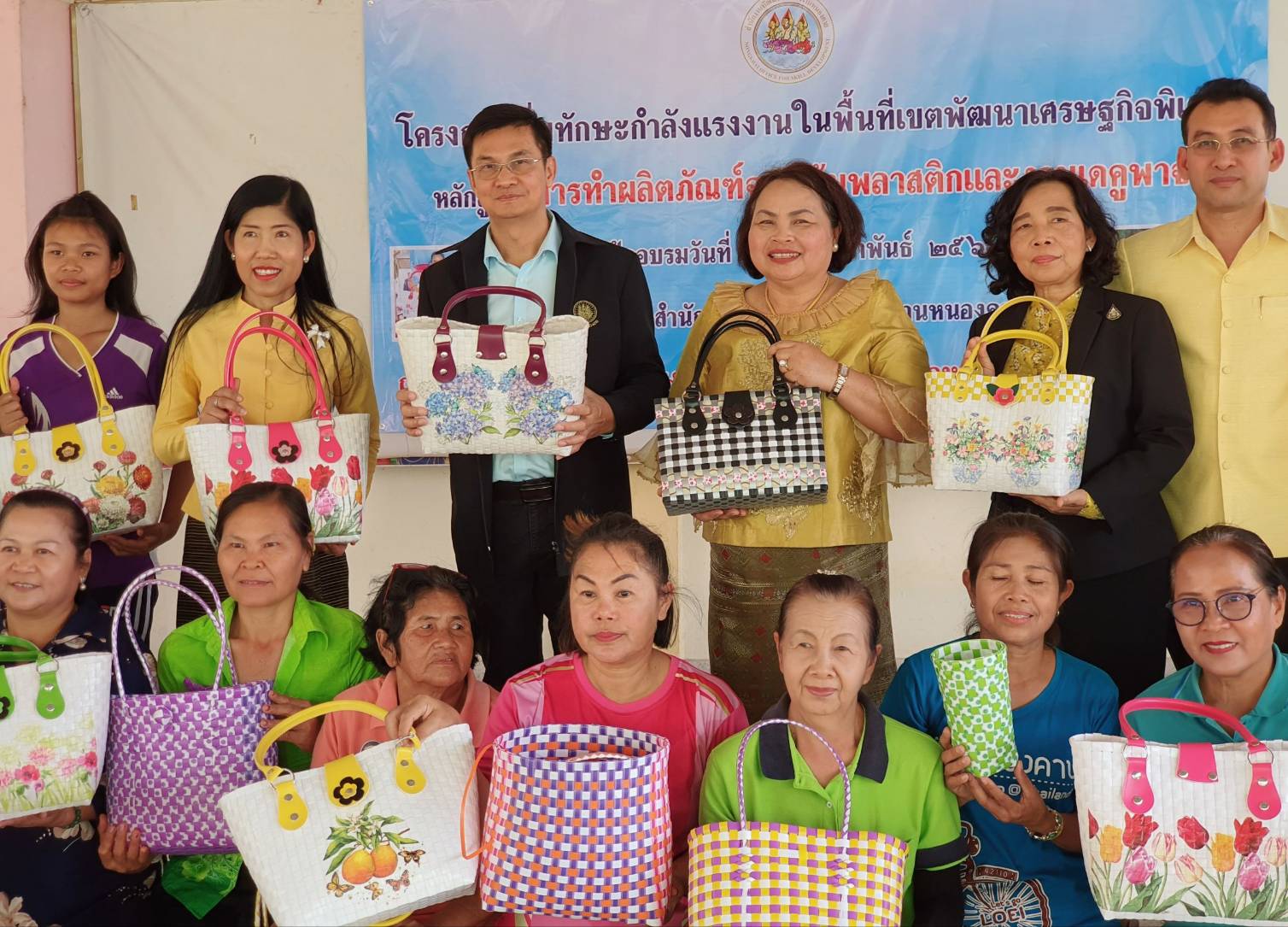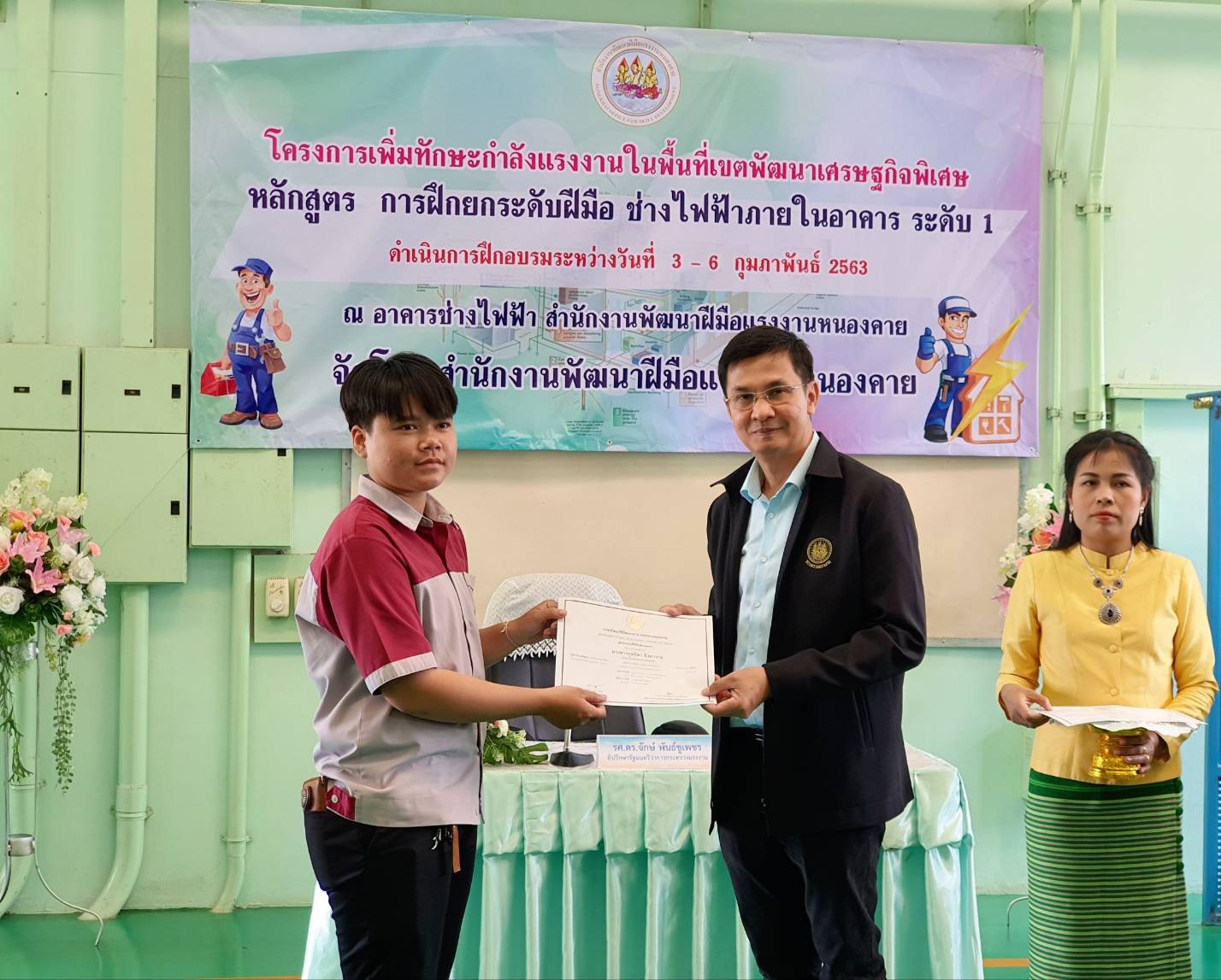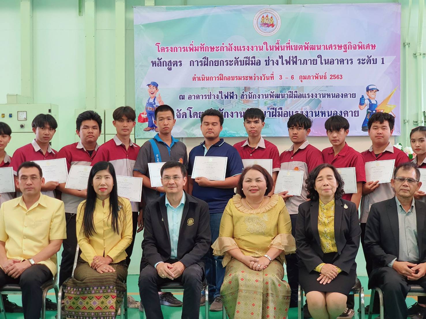On this occasion, the Advisor to the Labour Minister joined in the planting of honeycomb trees at the Nong Khai Provincial Skill Development Office and observed the training on electrician work. He also gave certificates to trainees, and observed the implementation of the labour skills enhancement project in the special economic development zone, in the field of making products from plastic strips and decoupage, at the Nong Khai Skill Development Office, Kai Bok Wan, Mueang Nong Khai, Nong Khai.