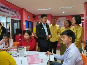 At 15.00 hours, the Advisor to the Labour Minister inspected operations of the Employment Office of Nong Khai. Nong Khai Employment Officer Mrs. Kanokrawee Wongsarot and officials from departments under the Ministry of Labour in Nong Khai welcomed the visiting committee.