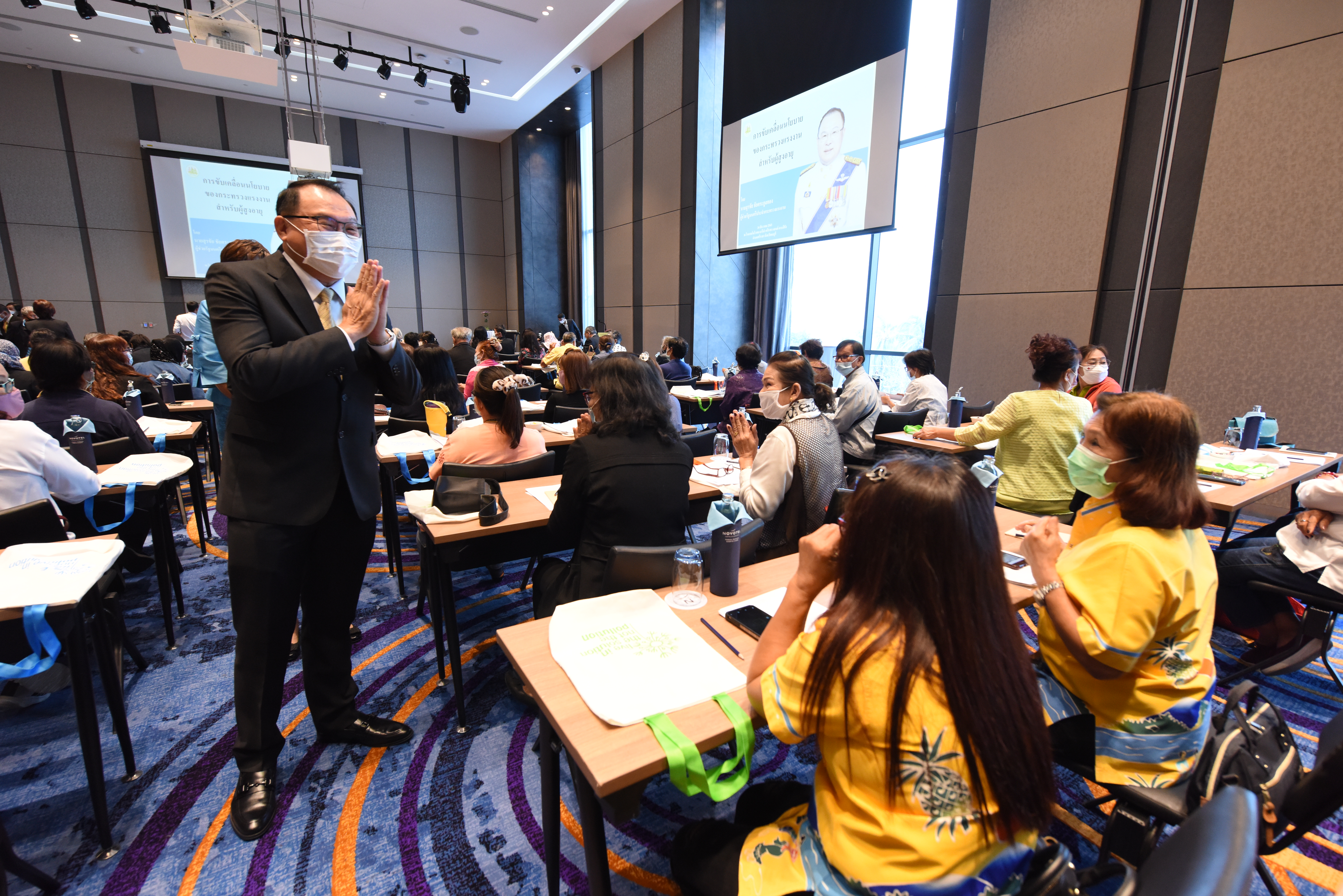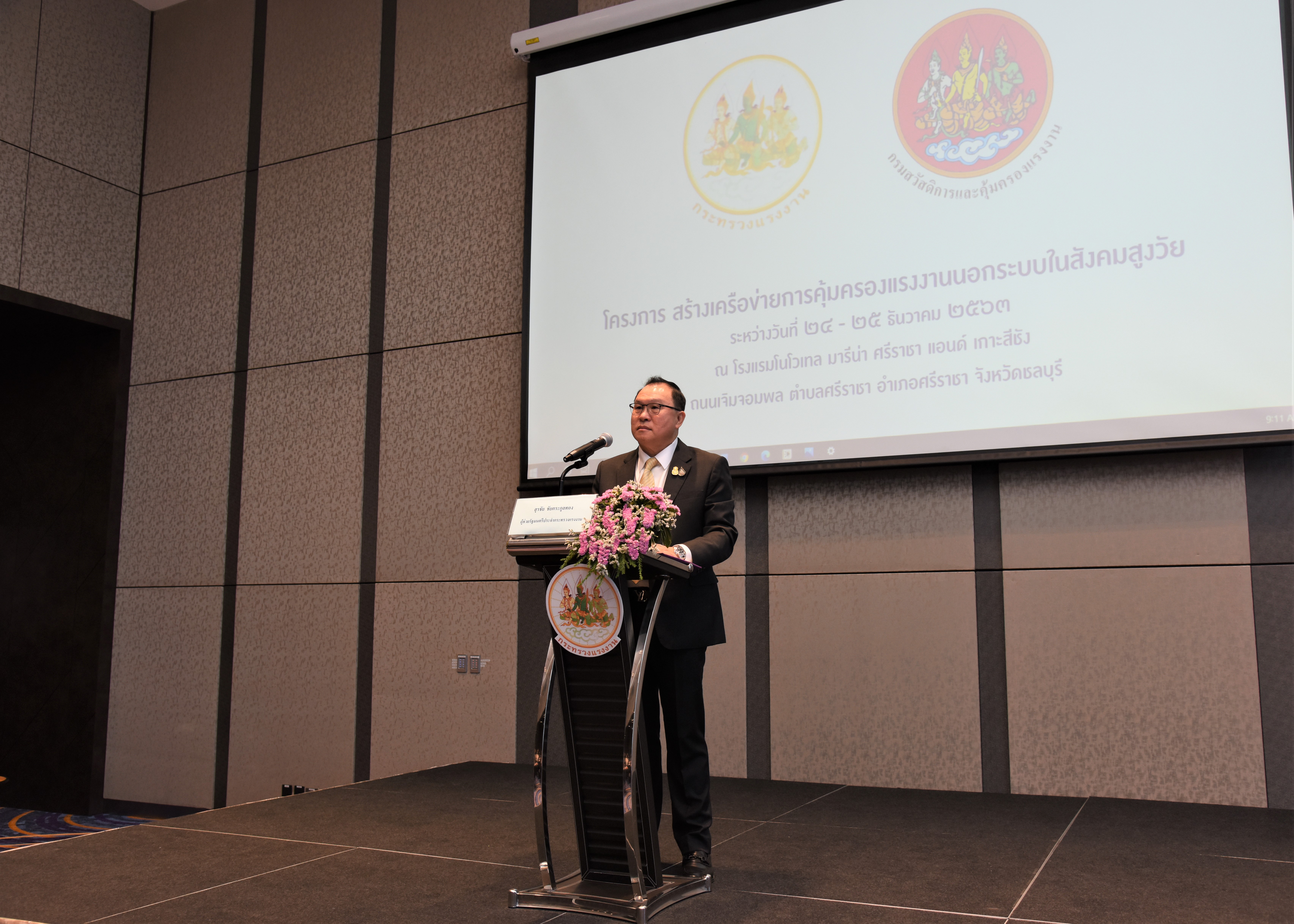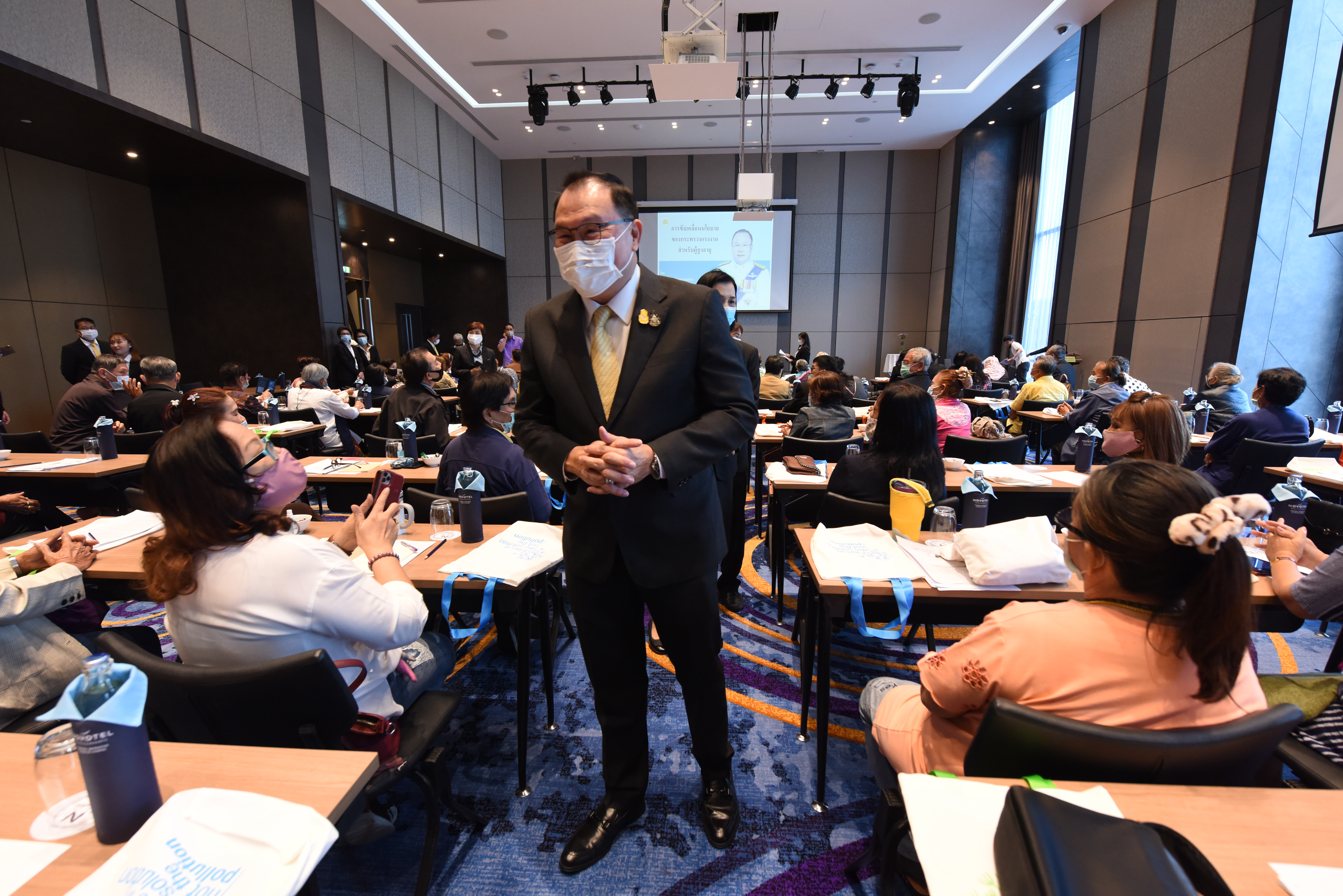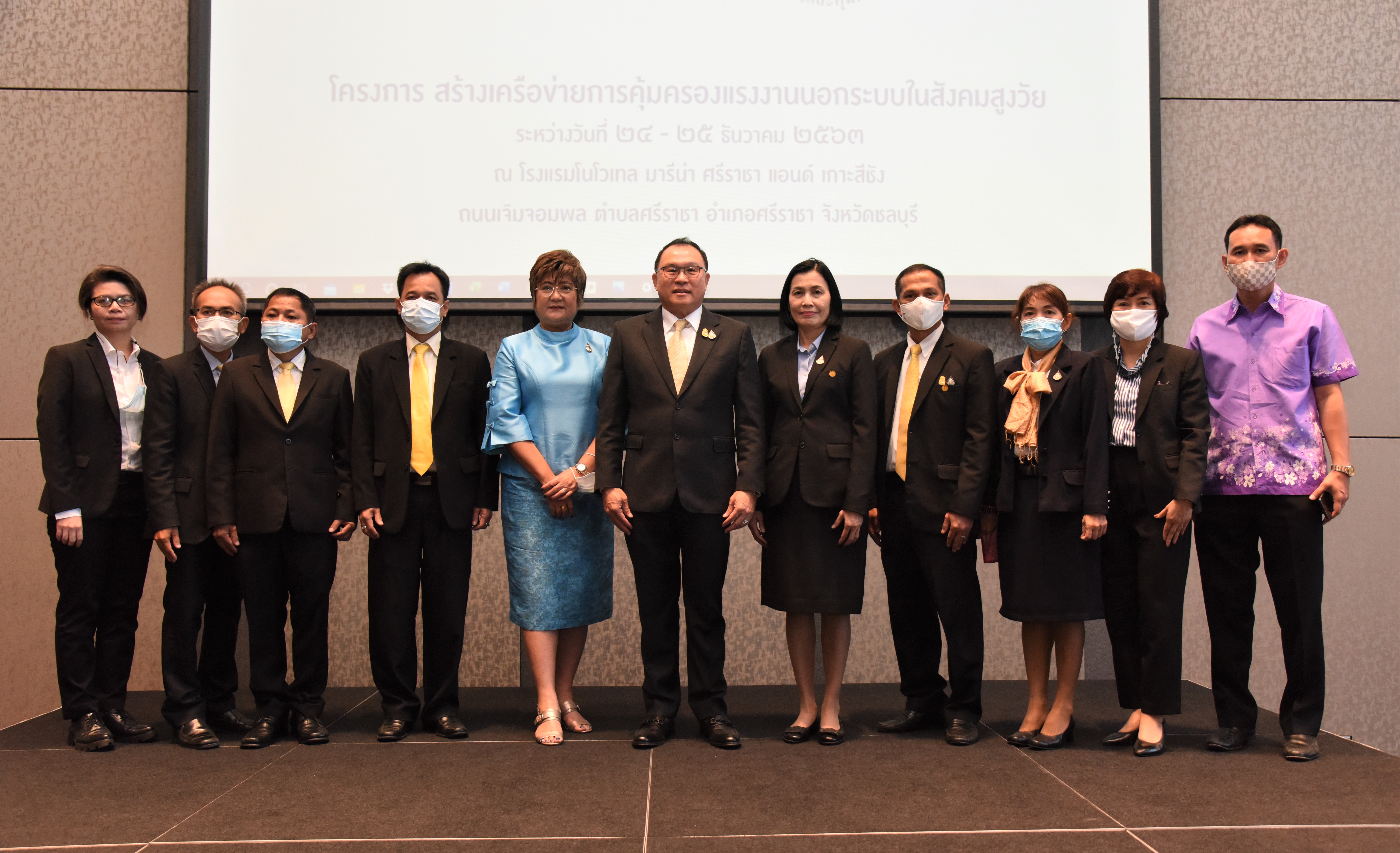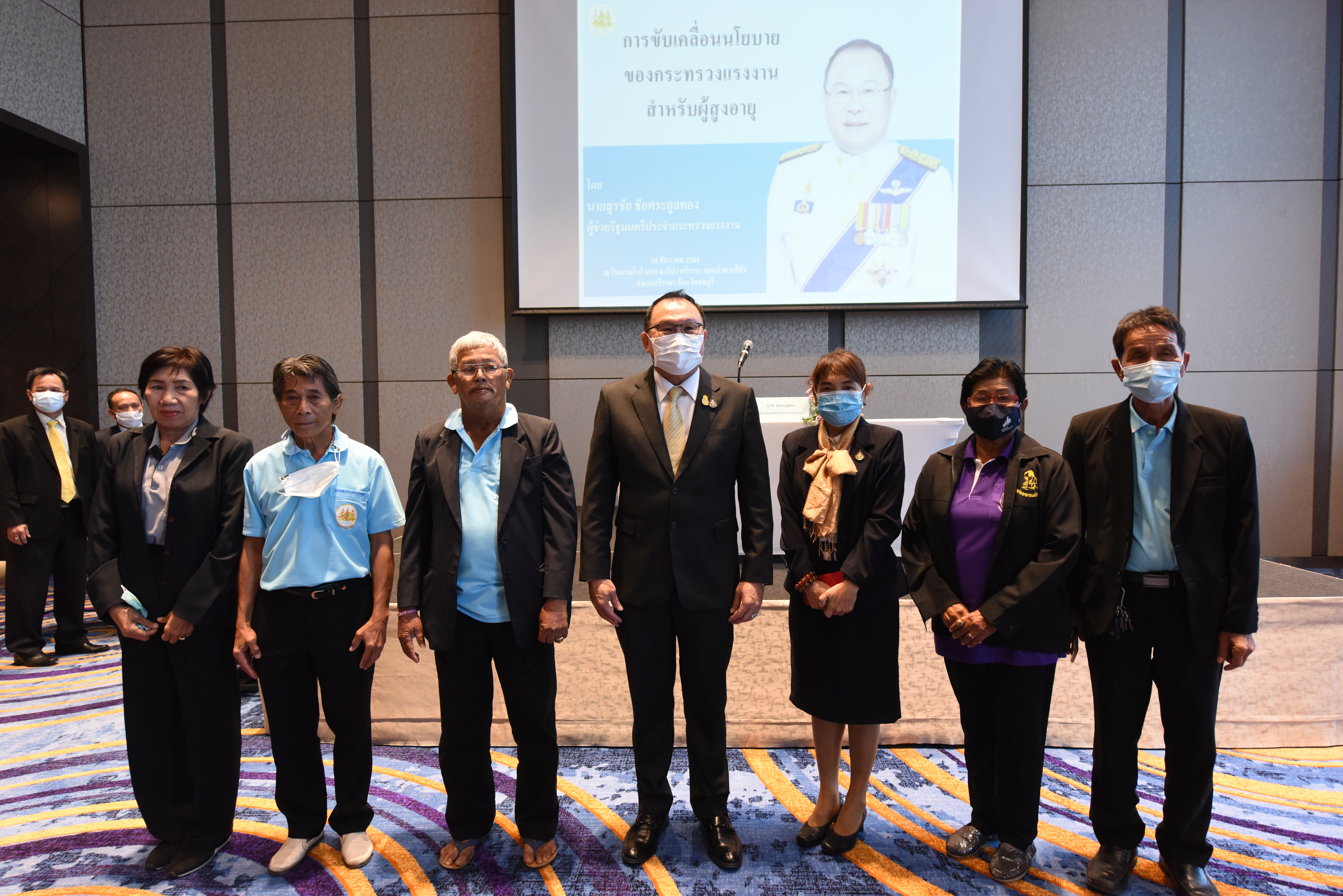On December 24, 2020, at 09.00 hours, Assistant to the Labour Minister Mr. Surachai Chaitrakulthong chaired the project to create a network to protect informal workers in the aging society. The project aims to enable elderly workers to enter the aging society and reflects on the importance of government agencies in promoting and encouraging elderly workers to form a network. Such networks facilitate the exchange of knowledge and information to strengthen access rights and ensure understanding of relevant laws are covered thoroughly and fairly in preparation to become a valuable elderly society. The event took place at the Novotel Marina Sriracha and Koh Si Chang Hotel, Sriracha District, Chonburi. The Department of Labour Protection and Welfare’s Deputy Director-General Mrs. Udomlak Sonsarn, gave a report. Most of the elderly are self-employed, intending to supplement income or work as hobbies, careers, or less strenuous activity, not working full-time. Such workers are not protected by law and have no social security. Moreover, most informal workers lack a proper understanding of labour laws, occupational safety, health and environment laws, and relevant legislation. This training includes informal workers, elderly groups (60 years and over) in Chonburi Province, whereby 110 people attended the training. The project’s duration is two days, which will benefit the trainees in their occupation and life, promoting group relationship activities to build relationships with the elderly to create and form networks.