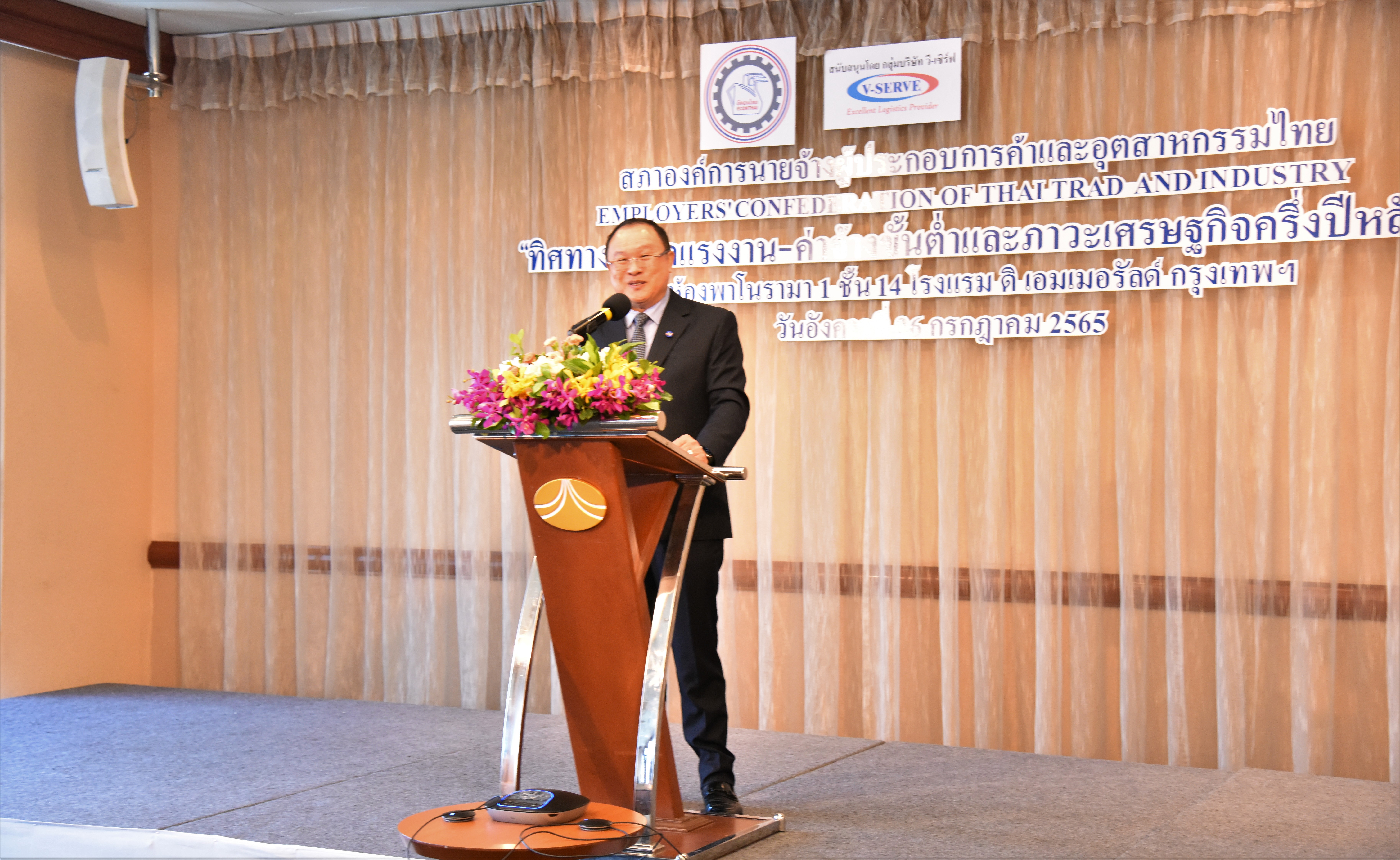 On July 26, 2022, at 13.45 hours, Assistant to the Labour Minister, Mr. Surachai Chaitrakulthong, gave a special lecture on “The direction of Thai worker’s development in the 5G era”. He spoke about the trend of Thai industries that will benefit from the workforce digital skills classification framework, guidelines for developing workers’ digital skills, and the plan to develop a training model with digital technology by the Department of Skill Development. He participated in the panel discussion on “The trend of employment amid the fragile economic situation and how businesses should adapt .” Fifty business owners who are members of the Employers’ Confederation of Thai Trade and Industry attended the special lecture, brainstormed, and shared opinions on adapting to economic and social changes. The occasion took place at the Panorama Room 1, 14th floor, The Emerald Hotel, Ratchadaphisek Road, Bangkok.
