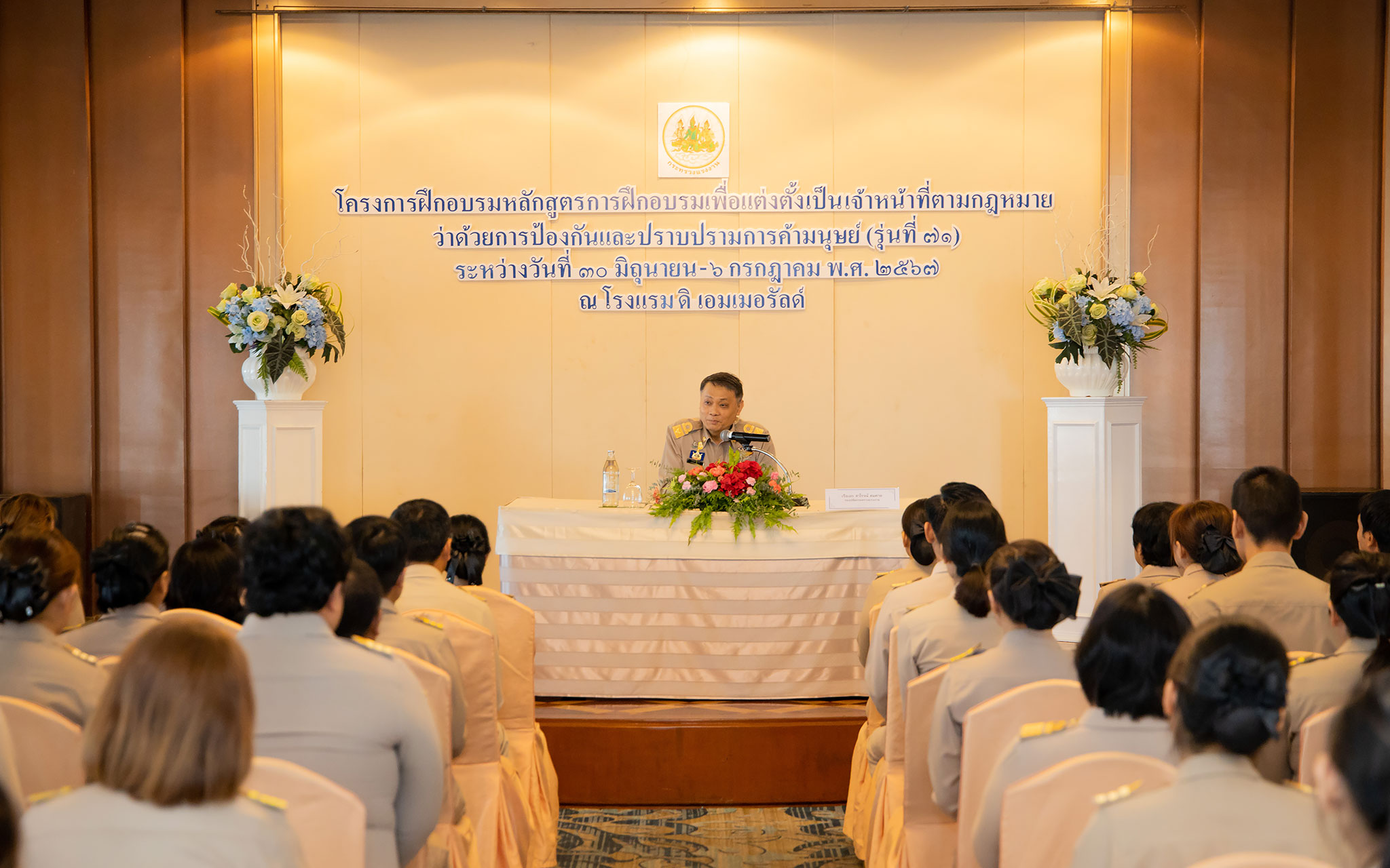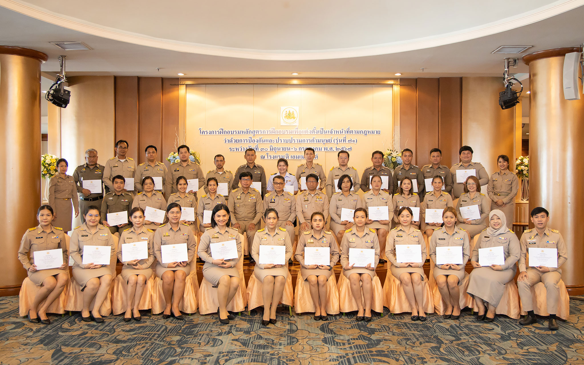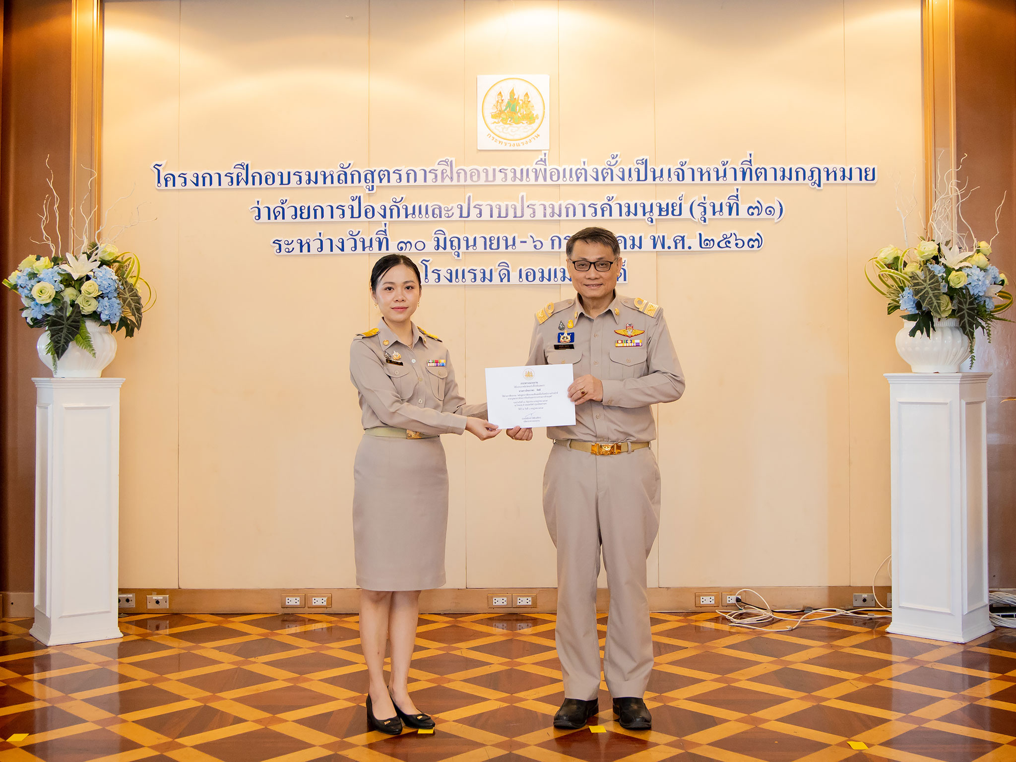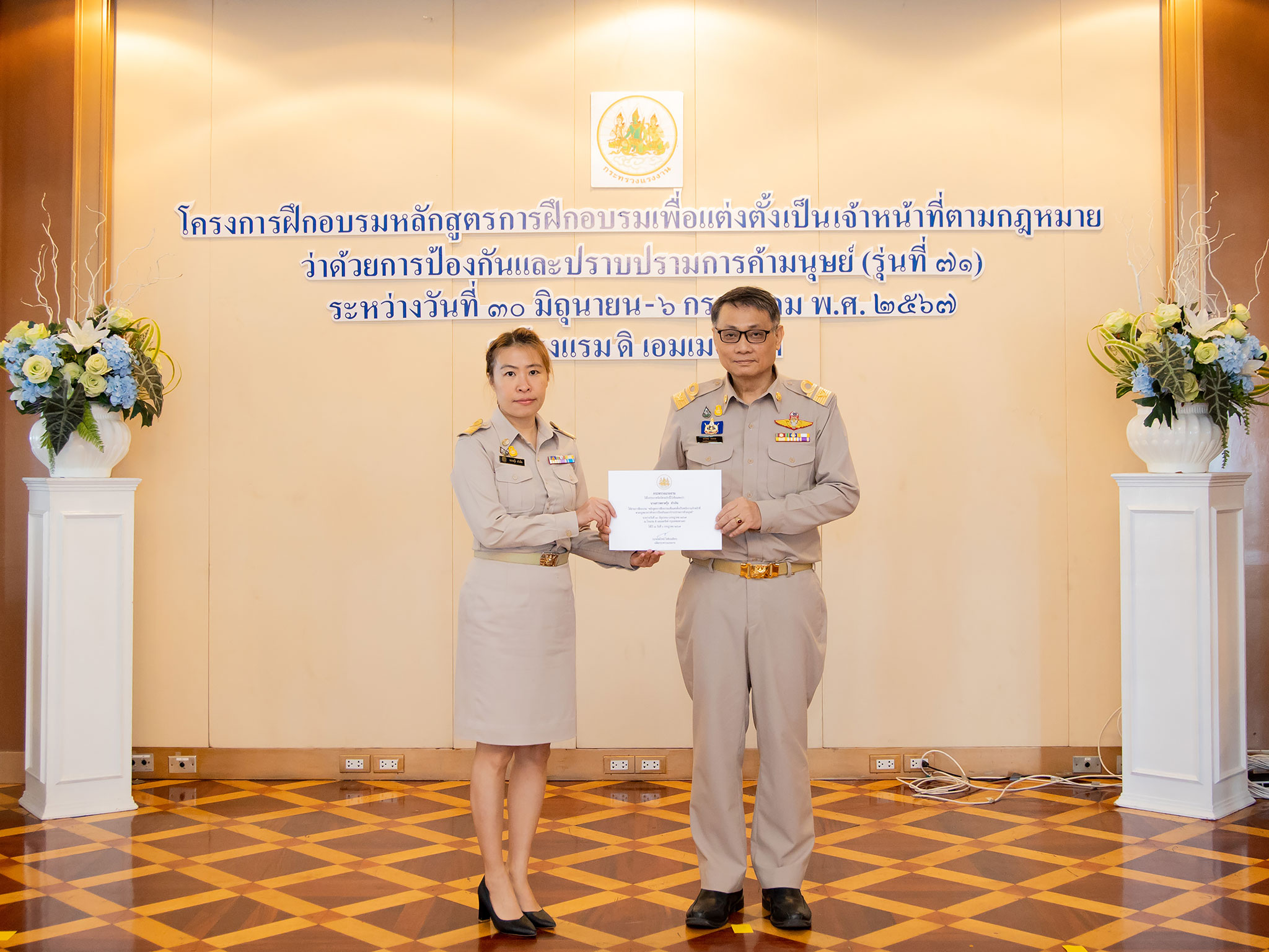 On July 6, 2024, at 10.30 hours, the Permanent Secretary of Labour, Mr. Pairoj Chotikasathien, assigned the Deputy Permanent Secretary of Labour, Lieutenant Saroj Komkhai, to chair the closing of the training program for the training course to appoint officials in accordance with the law on the prevention and suppression of human trafficking in the 2024 fiscal year, along with presenting certificates to the trainees. The event aims to equip participants with knowledge and understanding of policies to prevent and suppress human trafficking and forced labour or services and to assist victims of human trafficking and forced labour or services in accordance with legal and international principles. It also strives to provide participants with the qualifications according to the Ministerial Regulations specifying the qualifications for persons to be appointed as officials under the Prevention and Suppression of Human Trafficking Act B.E. 2551 and its amendments. The Director of the Office of the Secretariat of the Labour Trafficking Prevention Command Center, Ms. Sopana Boon-Long, reported on the results of the training. Senior executives of the Ministry of Labour, along with the trainees, joined in the welcome at The Emerald Hotel, Ratchadaphisek Road, Din Daeng District, Bangkok.