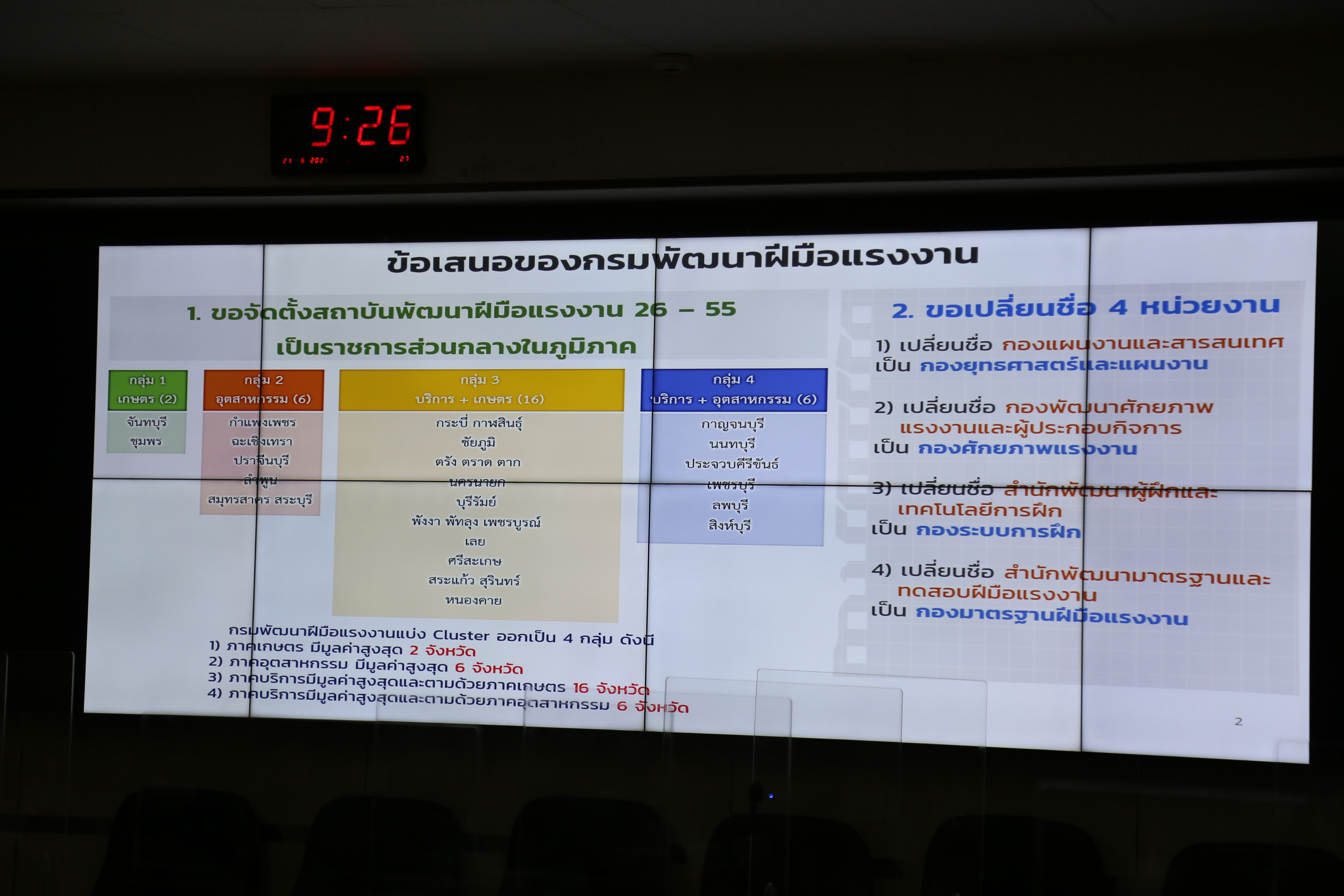 Improvement to the Department of Skill Development’s structure will play an important role in driving the missions of the 30 Skill Development Offices, to upgrade them to Skill Development Institutions 26 to 55, to be central governments in the region. There are provinces in the EEC area such as Chachoengsao and other important economic areas such as Samut Sakhon, Nonthaburi, Prachinburi, Phang Nga, Krabi, and Trang. The details are with the committee to help consider upgrading the Department of Skill Development by approving to establish 30 Skill Development Institutes to effectively drive the missions on skill development in the responsible areas and to produce benefits promote both the formal and informal workforce.