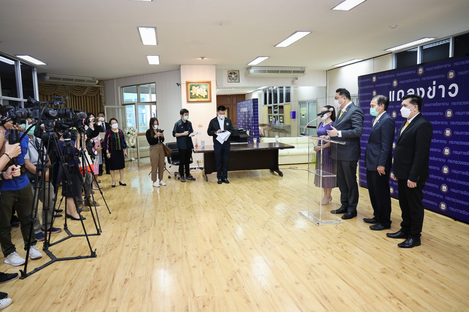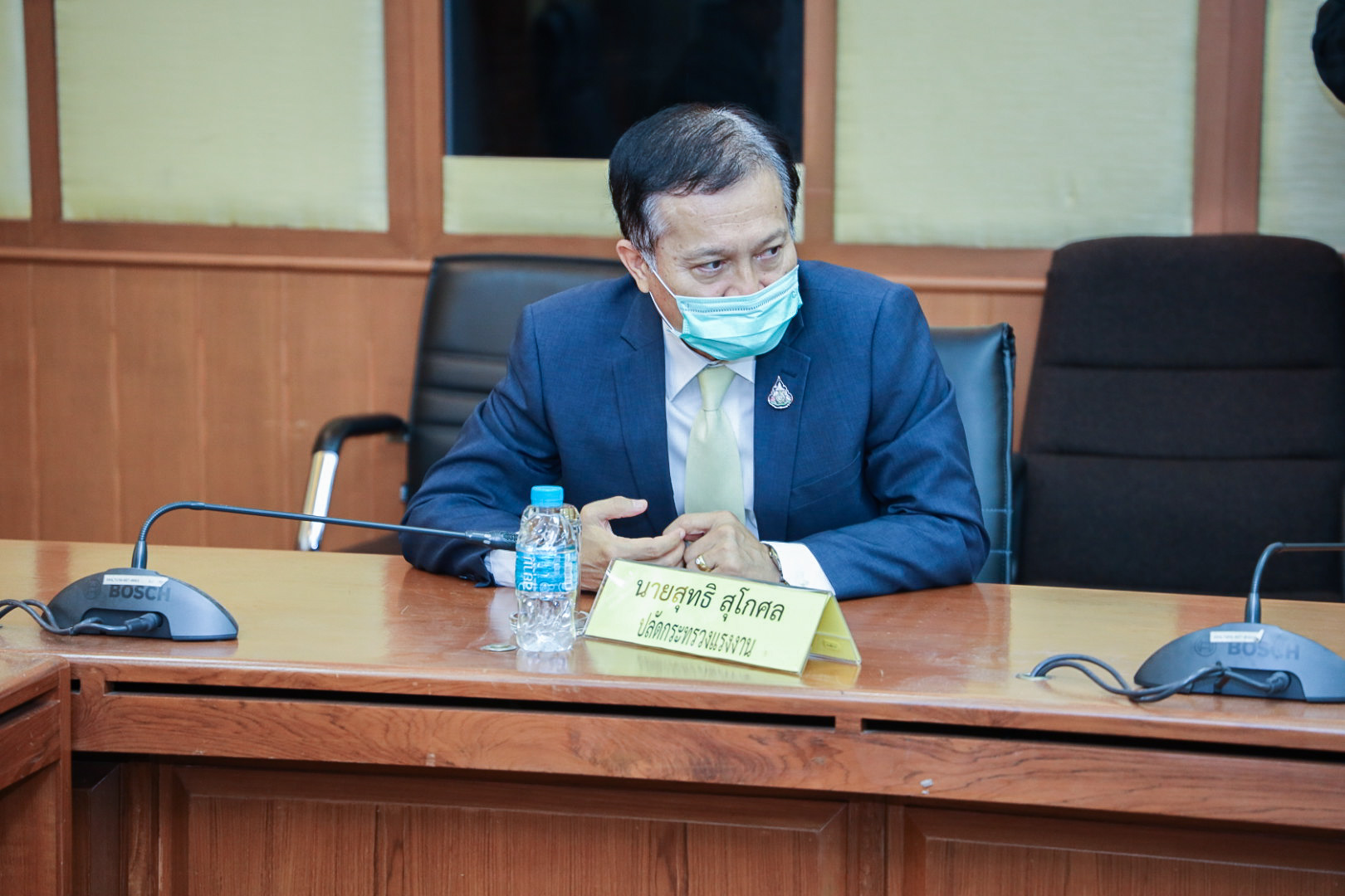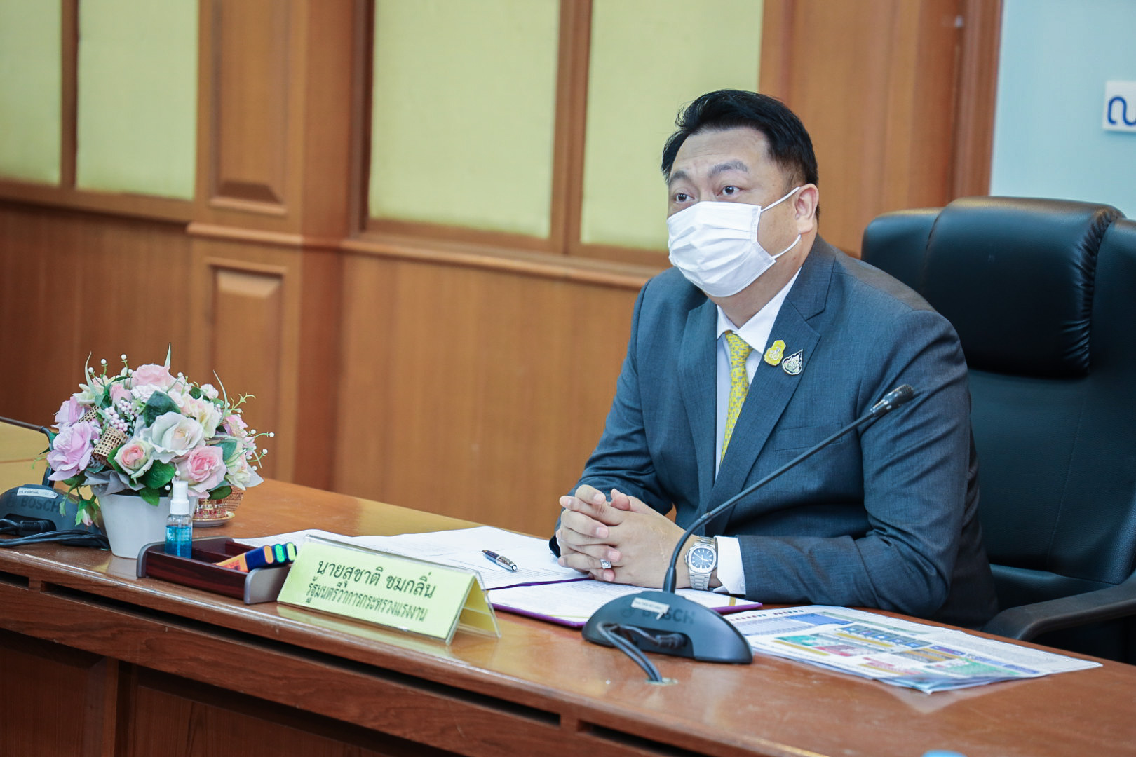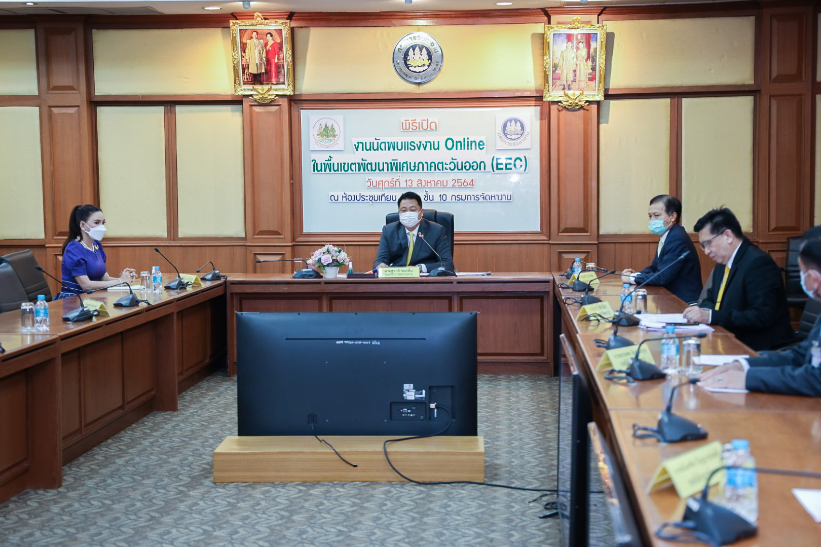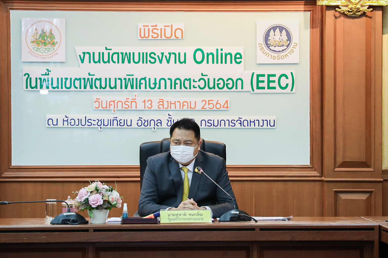 On August 13, 2021, the Labour Minister commenced an online meeting event with three provinces in the Eastern Economic Corridor (EEC), namely Rayong, Chon Buri, and Chachoengsao via Zoom. He met with 126 establishments that have 8,910 positions available. The Ministry of Labour’s Advisor, Mrs. Thiwalrat Angkinan, the Ministry of Labour’s Spokesperson (on politics) Mrs. Theanrat Nawamawat, Permanent Secretary of Labour Mr. Suthi Sukosol, and the Ministry of Labour’s executives also joined the opening ceremony at the Tien Achakul Meeting Room, 10th floor, Department of Employment.