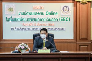 Labour Minister Mr. Suchart Chomklin revealed that organizing the “Meeting the Workforce Online” event was under the proactive recruitment program to develop the Eastern Economic Corridor. It is a fully online employment promotion effort, stemming from the awareness of the safety and well-being of workers affected by the COVID-19 situation and in response to government policy to upgrade government services by integrating digital technology to serve the people. The initiative promotes convenience, speed, and cost savings, whereby meetings are organized to meet workers online at the same time in three provinces of the EEC area, consisting of Rayong, Chonburi, and Chachoengsao. The area has 126 leading establishments such as Double A (1991), Intertek Specialty Glass, Shun Yi International Trading (Chonburi Branch), Summit Chugoku Seira, Bridgestone Carbon Black (Thailand), and Suntory PepsiCo Beverage (Thailand), for example. The companies have 8,910 job vacancies, including production workers, engineers, accountants, financial officers, and administrative staff. The roles require the high school to bachelor’s degree qualifications. Activities included a demonstration of over 30 independent occupations, such as making E-books, teaching investments and trading stocks, influencer coordinator careers, consulting for personal/juristic tax planning, healthy cookie making, sewing masks, and soap and herbal shampoo making. There were also lectures to educate about job applications—for example, online job interview techniques to pass quickly. Lectures also included the labour market in the post-COVID era, educational development before entering the labour market, education and the future, EEC employers’ views on working in Thailand, and the skills needed for job seekers.
