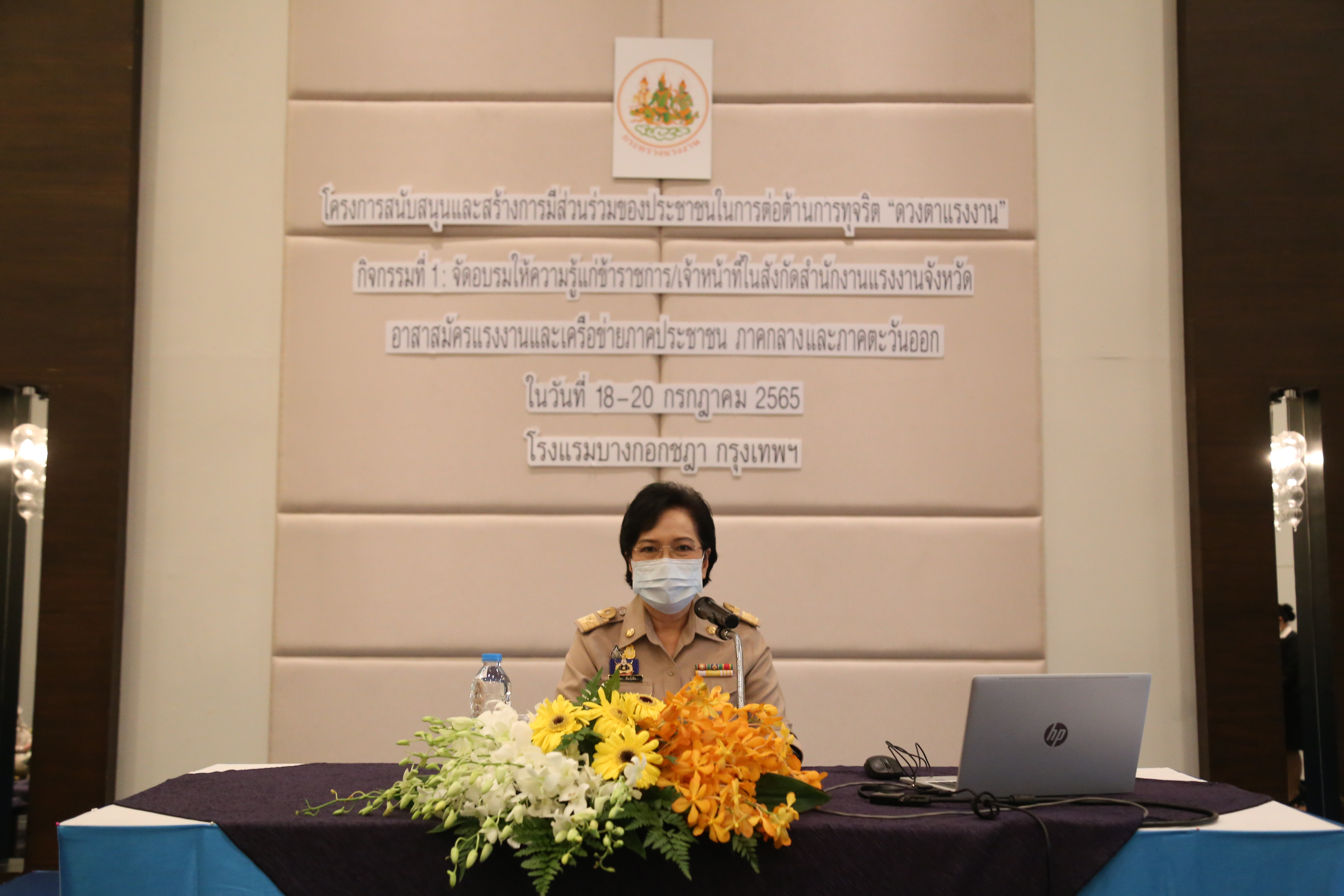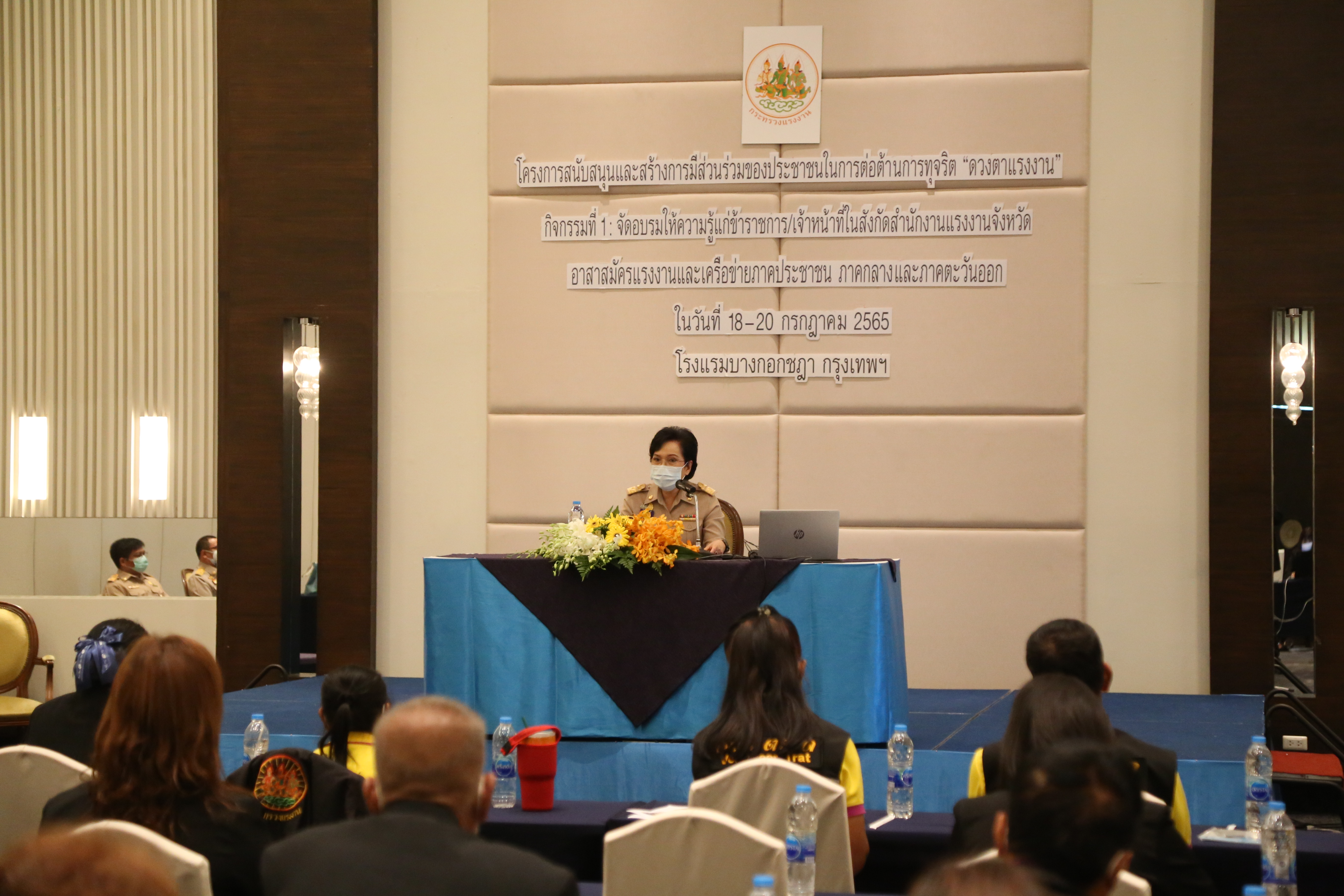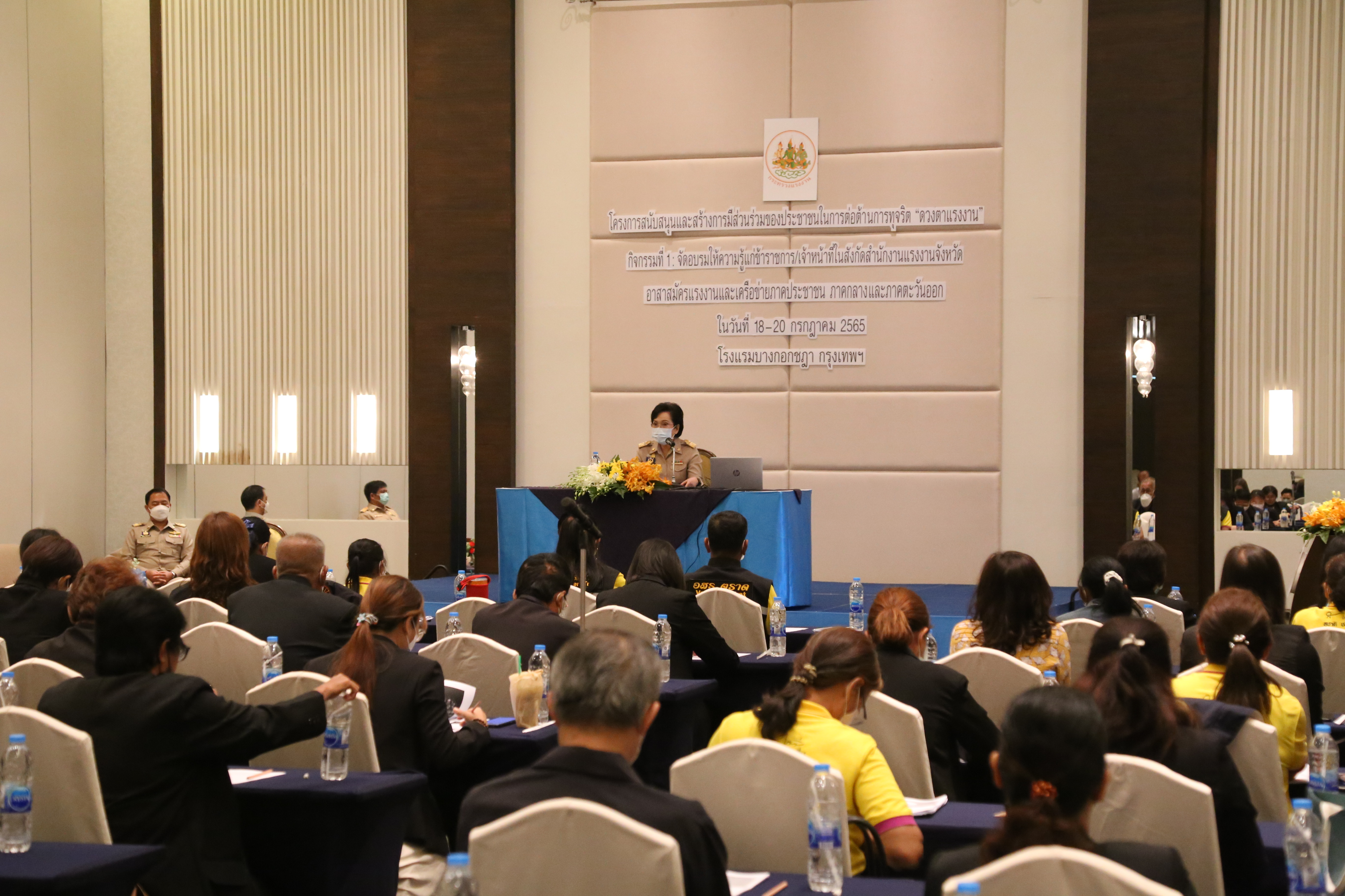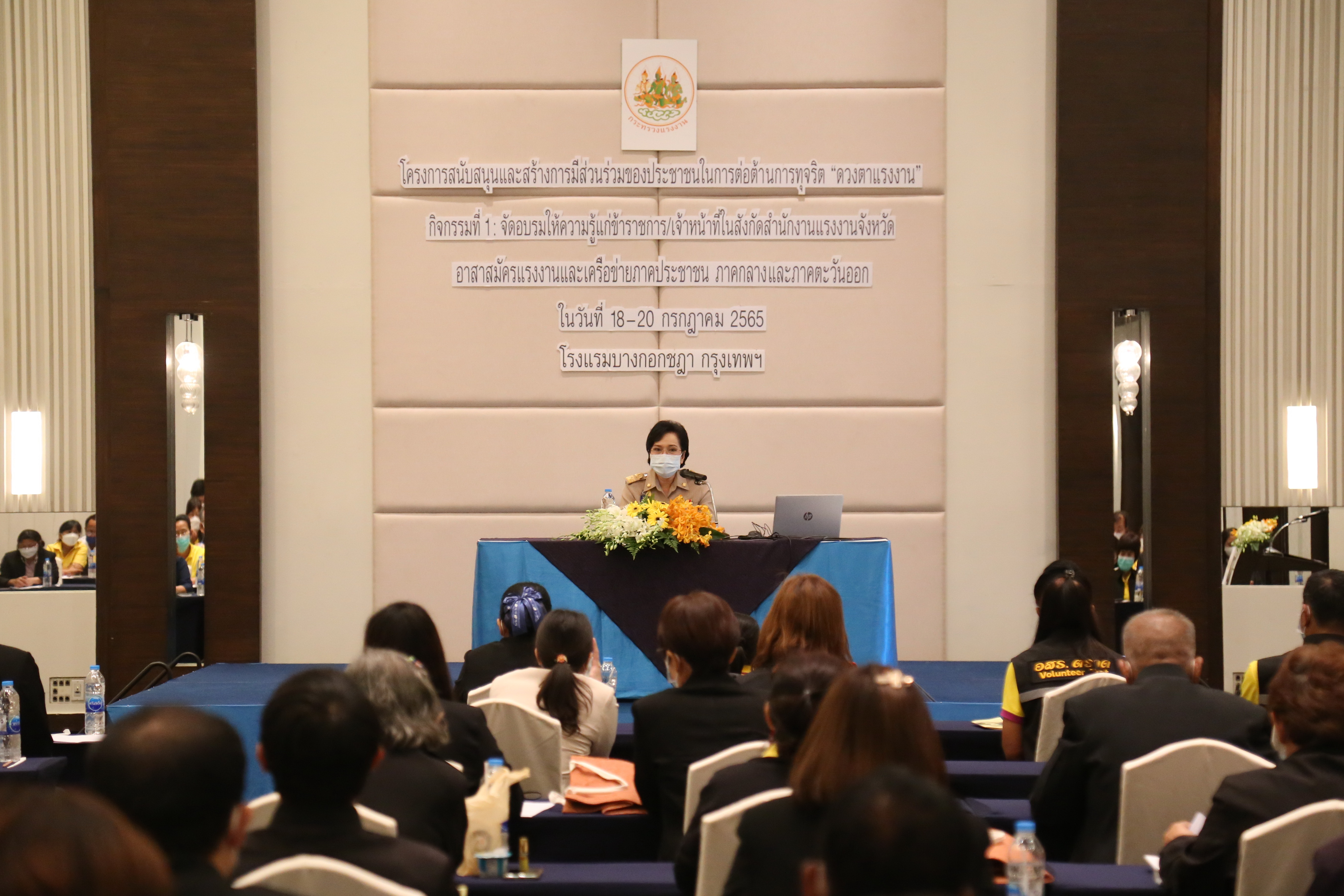 On July 18, 2022, at 08.30 hours, the Deputy Permanent Secretary of Labour, Mrs. Bubpha Phanpeng, presided over the opening ceremony of the project to support and build people’s participation in anti-corruption efforts “Labour Eyes.” Assistant to the Permanent Secretary of Labour, Mr. Samat Pattamasukon, participated in the project’s opening ceremony at the Chada Grand Ballroom, 2nd floor, Bangkok Chada Hotel, Bangkok. The Deputy Permanent Secretary of Labour said that the 20-year national strategy had established strategic issues for balancing and developing the government management system, which has set anti-corruption as a national agenda under the “Zero Tolerance & Clean Thailand” vision. It aims to accelerate efforts and consolidate the participation of people’s networks in preventing all forms of corruption. The Ministry of Labour is determined to develop cooperation between the government and people’s sectors to create an anti-corruption culture, cultivate the values of good morals, and build confidence in the Ministry of Labour’s operations, where the people take into account the interests of the nation before their own benefits. It aims to promote and encourage government officials, the general public, and network partners to continuously cooperate in fraud prevention through the training mechanism. It also aims to build a body of knowledge, develop skills, and spread awareness, expanding anti-corruption networks at the community level. The objective is that everyone is like the “eyes” of the Ministry of Labour, which is important in surveillance, whistle-blowing, providing information, and participating in the effective investigation of government agencies’ operations, working together to create a new national goal against corruption.