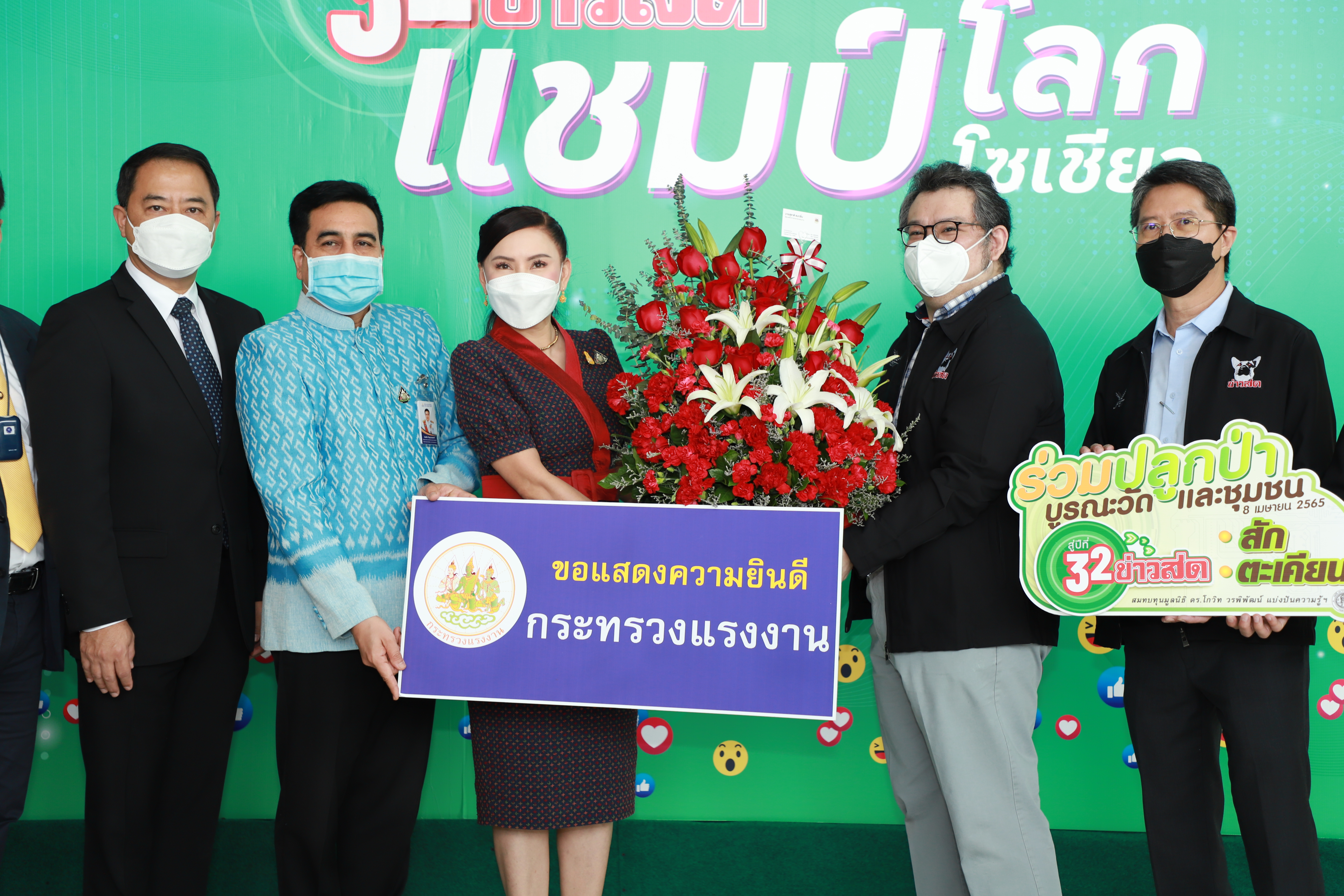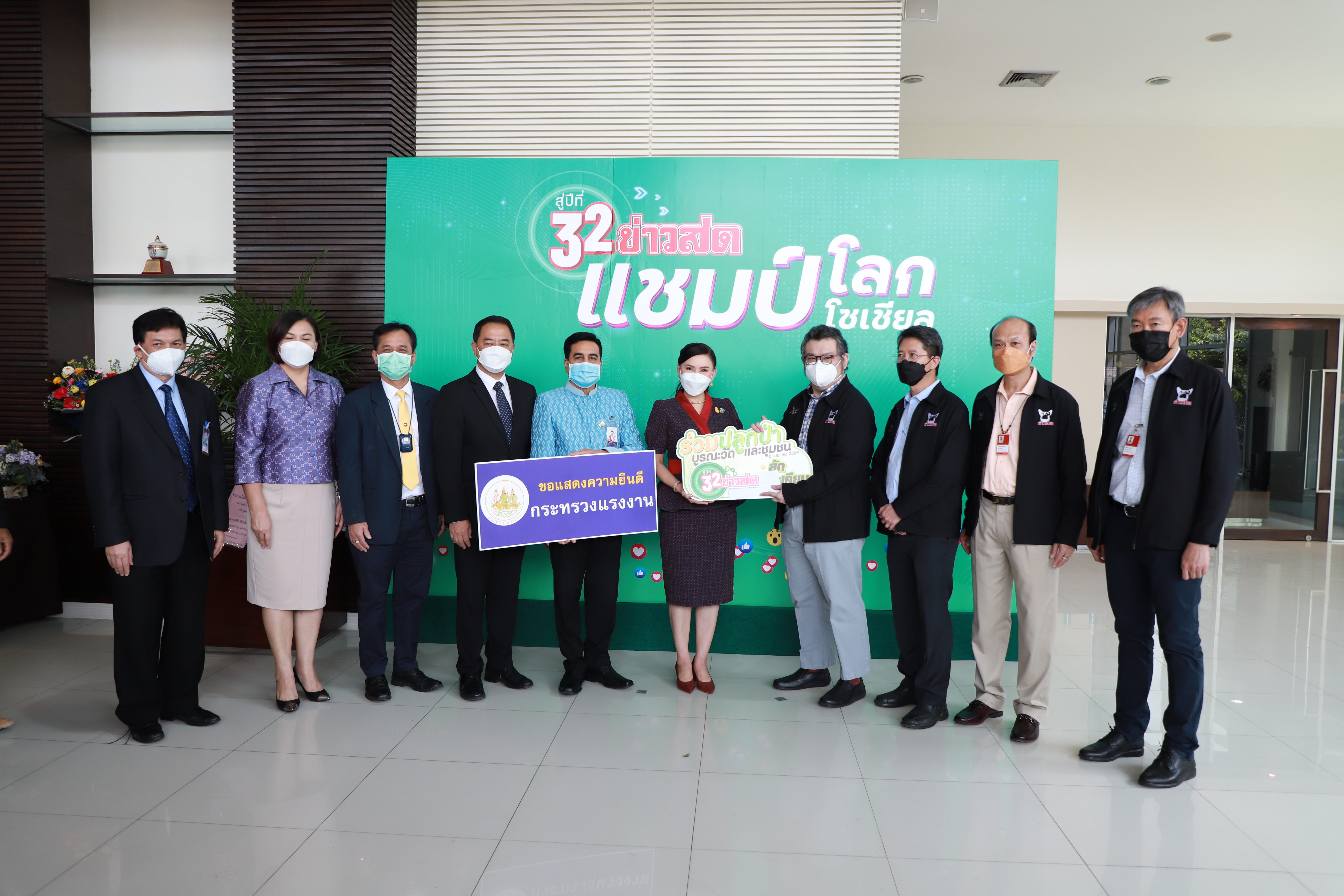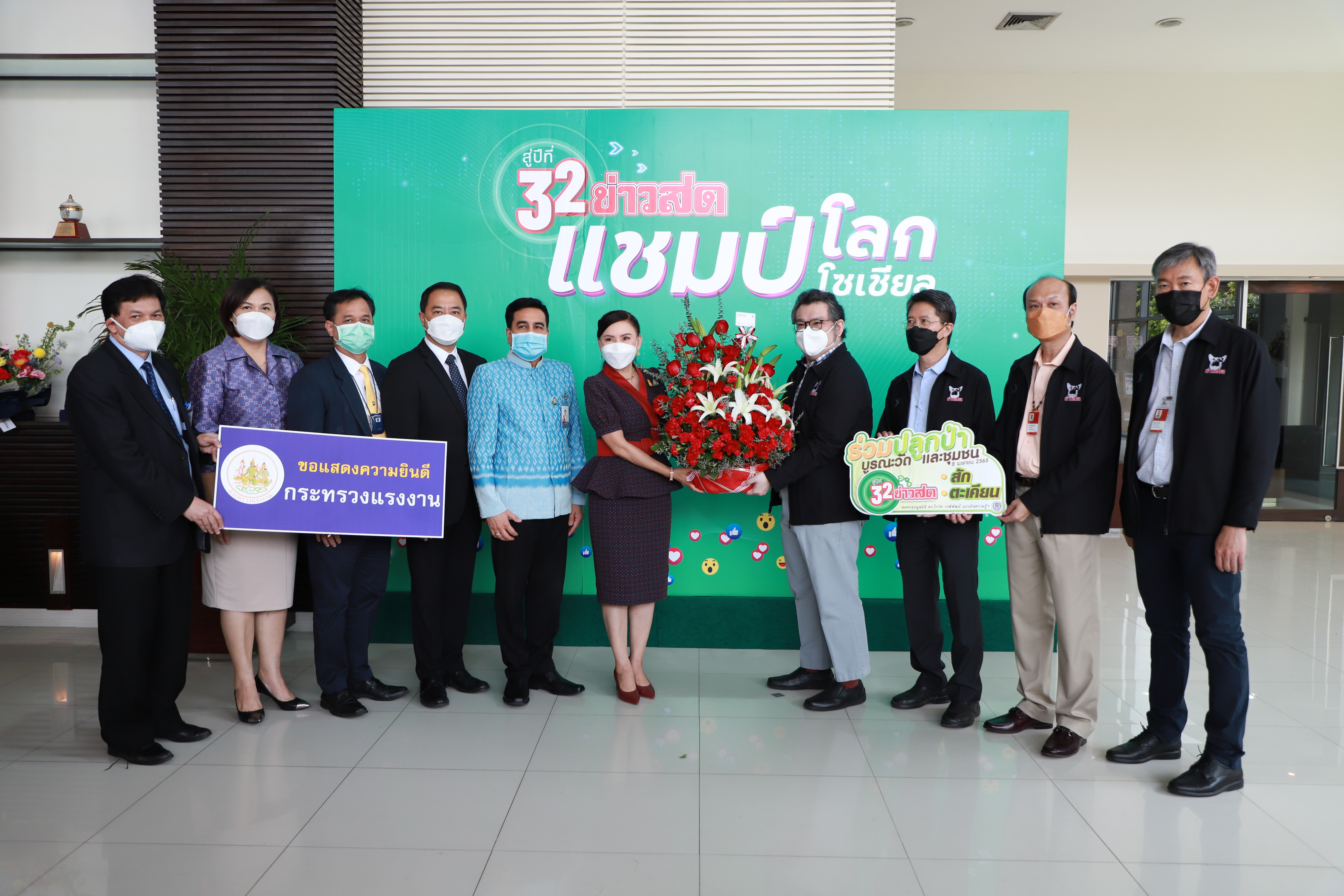 On April 8, 2022, at 11.00 hours, Labour Minister Mr. Suchart Chomklin assigned the Labour Minister’s Advisor, Mrs. Thiwalrat Angkinan, to represent the Ministry of Labour in congratulating Khao Sod Newspaper on its 32nd anniversary. Mr. Suriwong Uapatiphan, Editor of Khao Sod newspaper, and the newspaper’s management joined in receiving flower baskets. Assistant to the Permanent Secretary of Labour, Mr. Samat Pattamasukon, Deputy Secretary-General of the Social Security Office Mr. Nanthachai Panyasurarit, the Department of Employment’s Inspector-General Mr. Sibmuenchai Bothisin, and the Department of Skill Development’s Inspector-General Mrs. Weeraya Rattananit also joined the occasion at the Khao Sod Newspaper Building, Tessaban Nimit Tai Road, Prachaniwet Village 1, Chatuchak District, Bangkok.