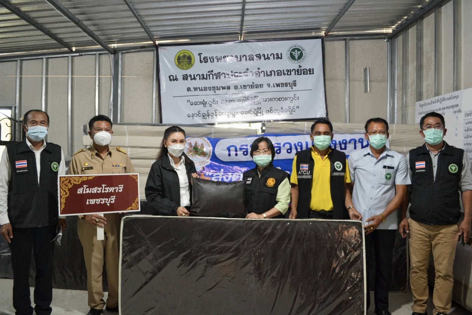 On August 11, 2021, Labour Minister Mr. Suchart Chomklin assigned the Ministry of Labour’s Advisor, Mrs. Thiwalrat Angkinan, chaired the meeting of the heads of government agencies under the Ministry of Labour in Phetchaburi to drive the Ministry of Labour’s mission following the Labour Minister’s policy. The occasion took place at the meeting room of the Phetchaburi Provincial Social Security Office. In the afternoon, the Labour Minister’s Advisor delivered 40 bunk beds, 142 sets of mattresses and pillows, valued at 169,660 Baht to Sanam Nong Chumphon Hospital, Khao Yoi District, Phetchaburi Province. The recipients were Mrs. Wanpen Mangsri, Deputy Governor of Phetchaburi Province, Mr. Boonlarp Thipchan, Deputy Doctor of the Phetchaburi Provincial Public Health Officer, and Mr. Prasert Plodprong from Khao Yoi District Public Health Office. The Phetchaburi Provincial Employment Officer and Provincial Labour Protection and Welfare Officer also joined the occasion.