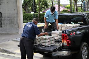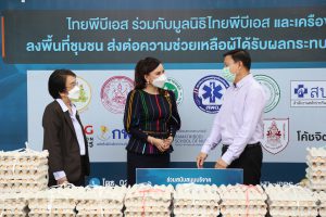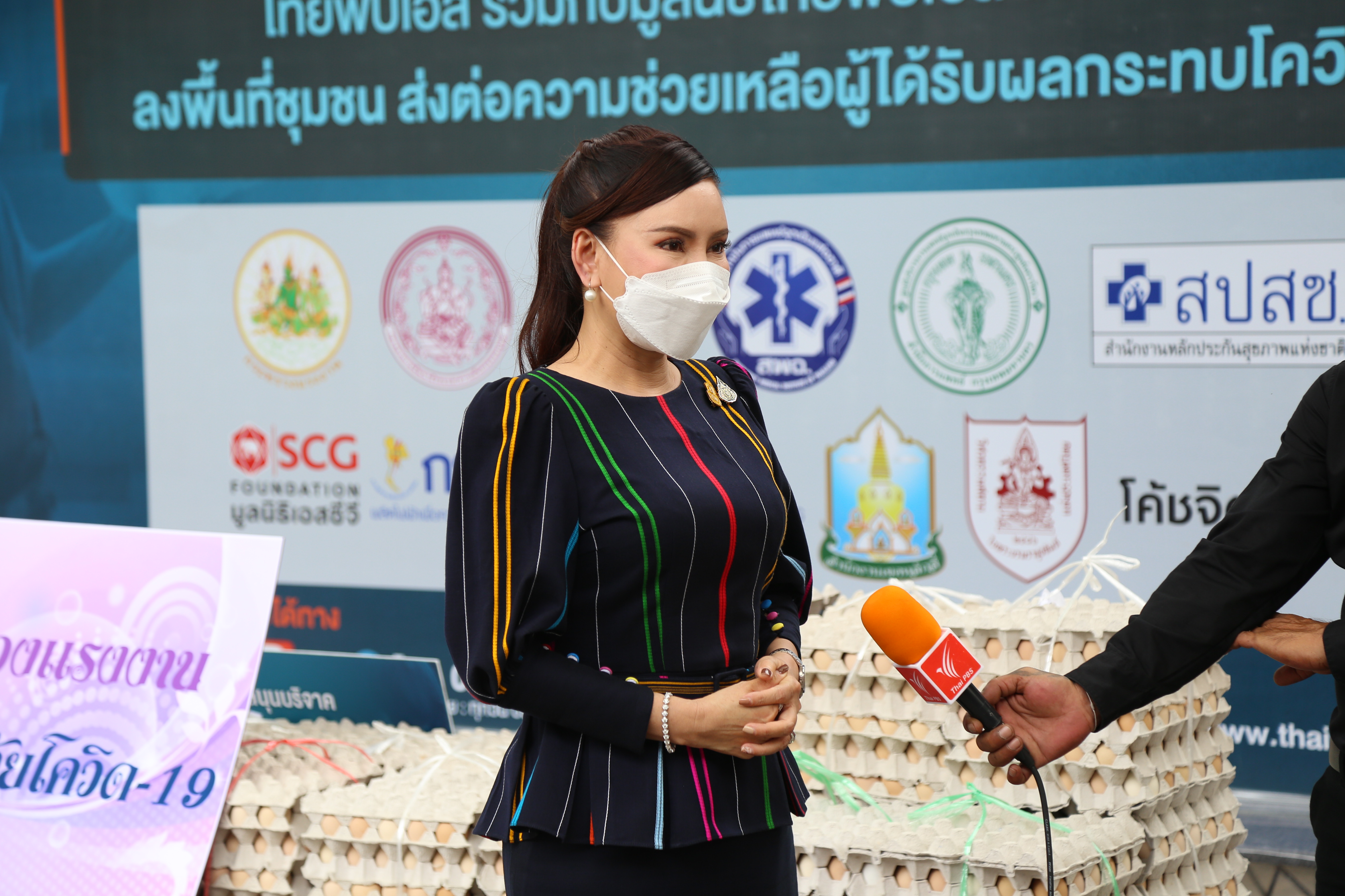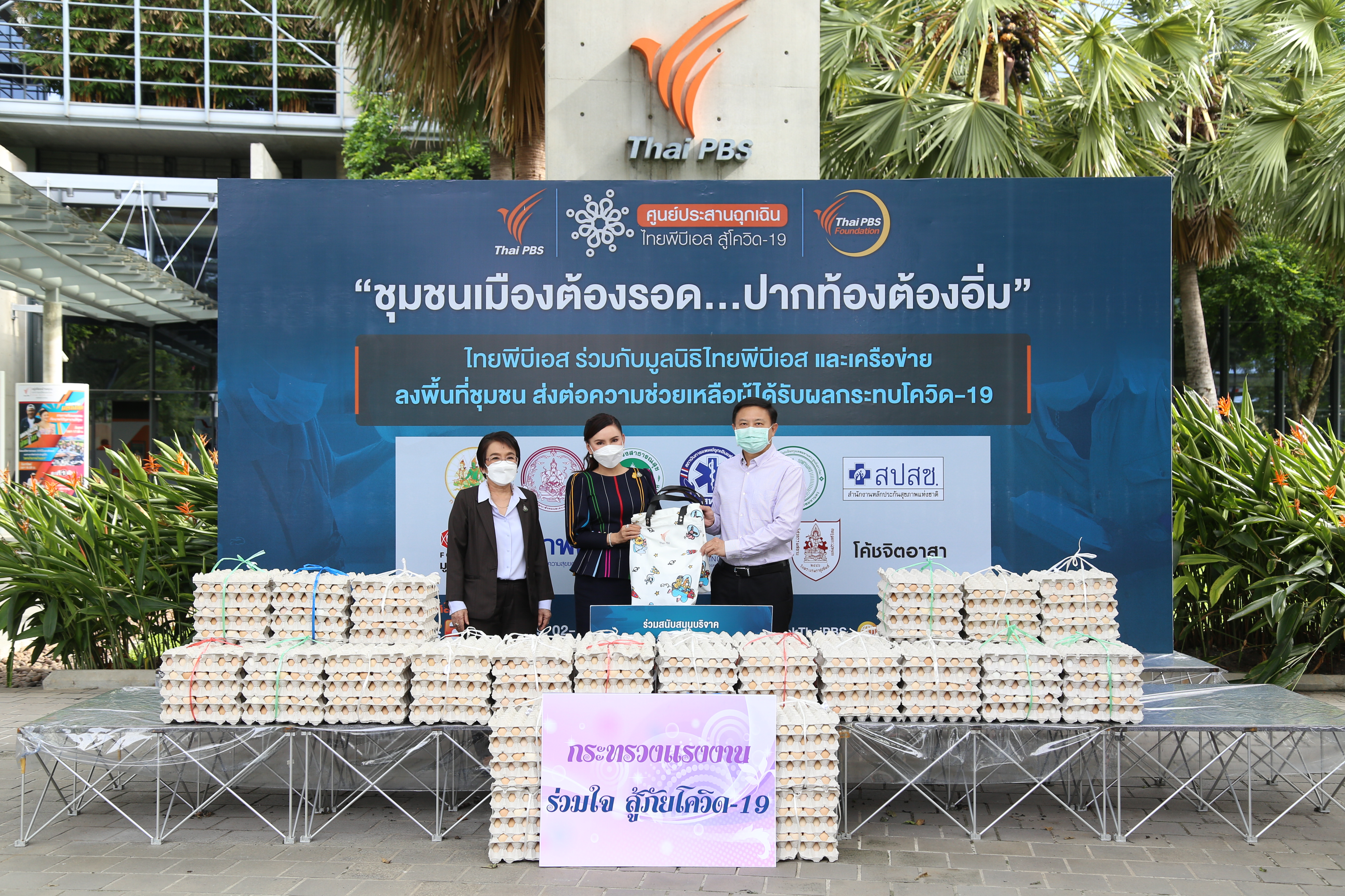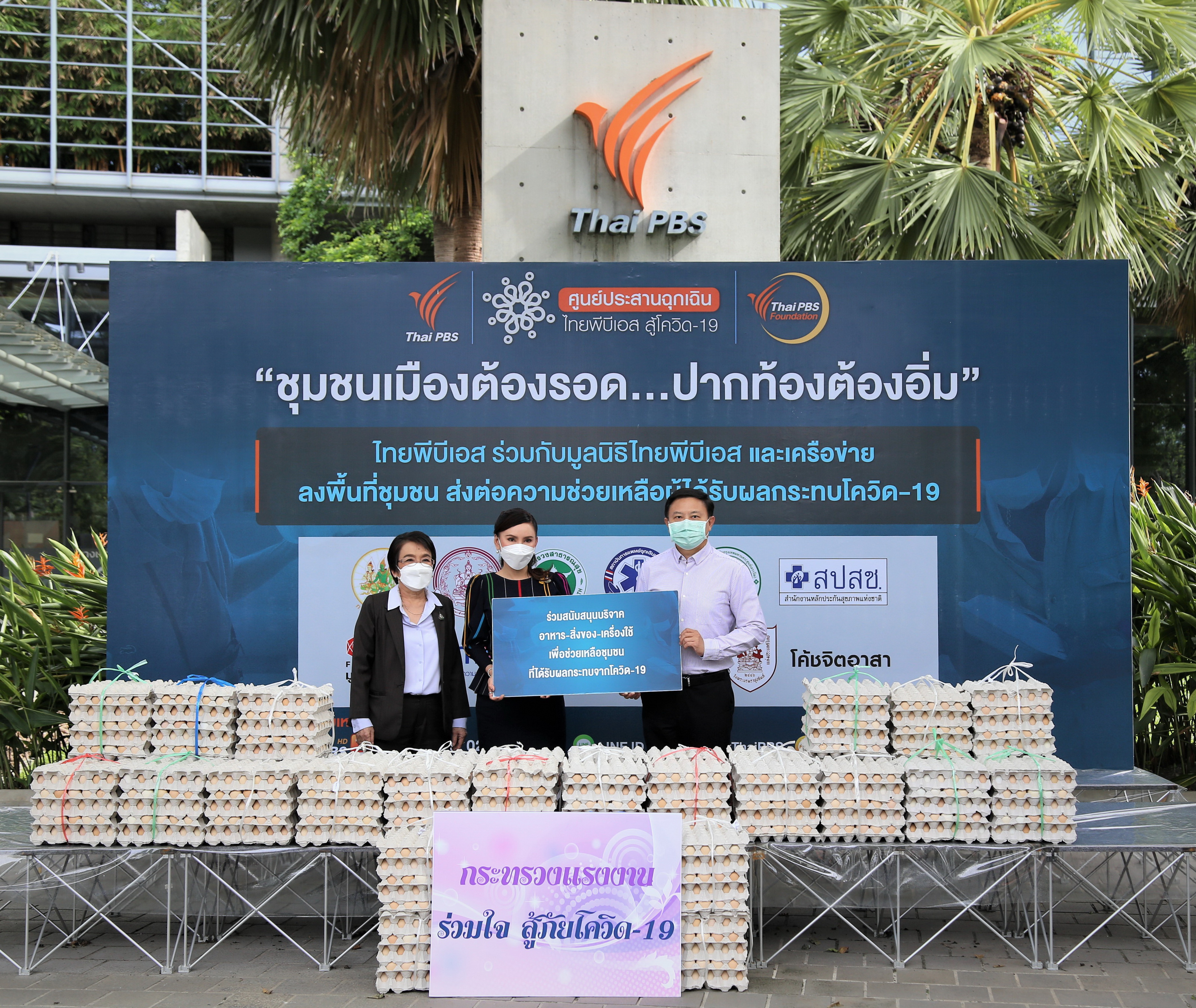 Mrs. Thiwalrat said that today, Labour Minister Mr. Suchart Chomklin, assigned her to deliver 10,000 eggs, which the Ministry of Labour received in support from the private sector, like CPF, who joined forces with the government to support consumer products and chicken eggs. The goods were donated to Thai PBS to help people affected by COVID-19. The effort helps lighten the burden and build morale in the fight against the COVID-19 pandemic to overcome this situation together.