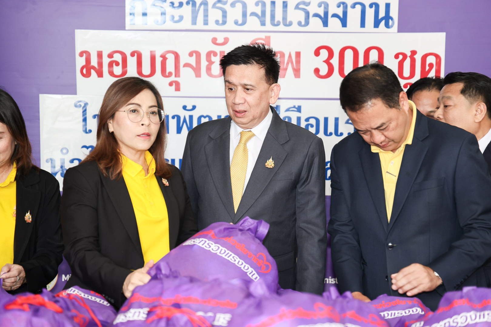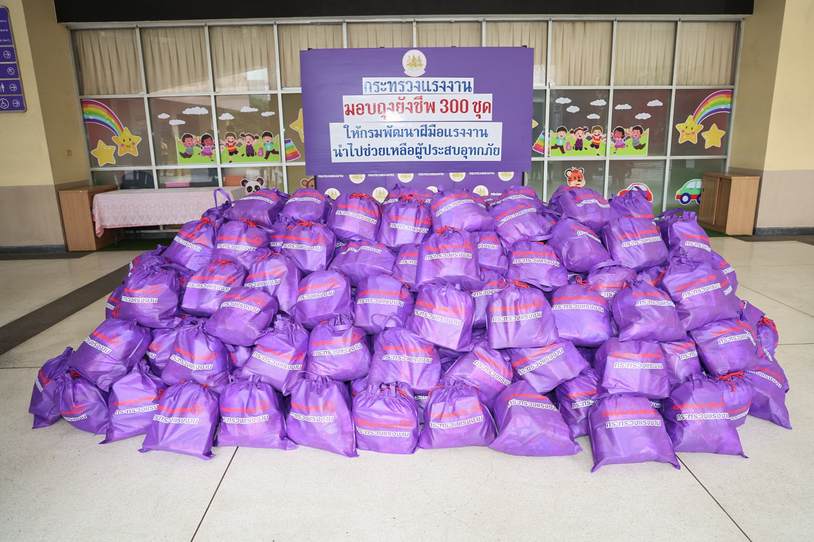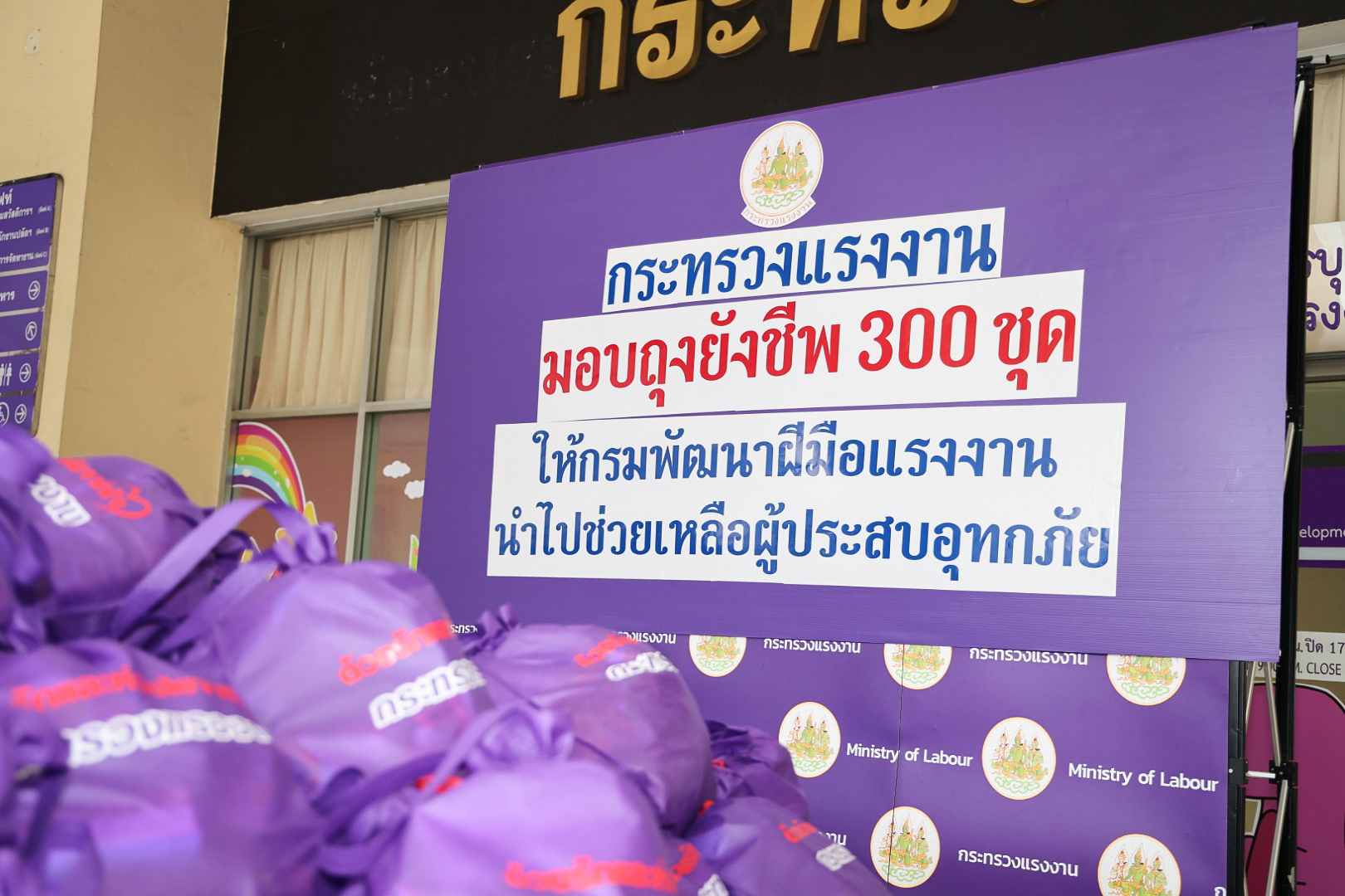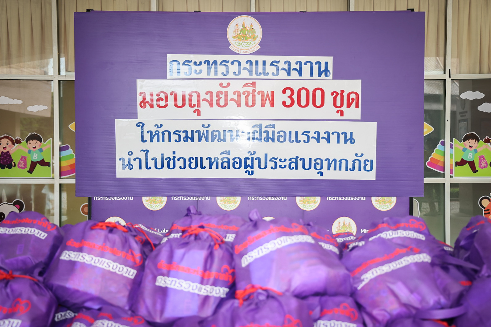 “The Ministry of Labour would like to thank all sectors for supporting the relief supplies for those affected. Today, I have given 300 relief bags to the Department of Skill Development as a way to pass on the goodwill to help those affected by the flood. In addition, I have instructed the provincial labour departments and its affiliated agencies to set up a team of officers to provide labour services to help those affected, such as repairing houses, electrical appliances, repairing motorcycles, and small agricultural engines damaged by the flood, as well as recruiting and training those affected by the flood, providing advice on labour laws, and social security benefits to help restore areas where the water has receded,” said Mr. Pairoj.
