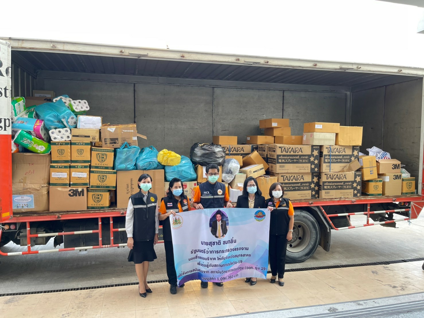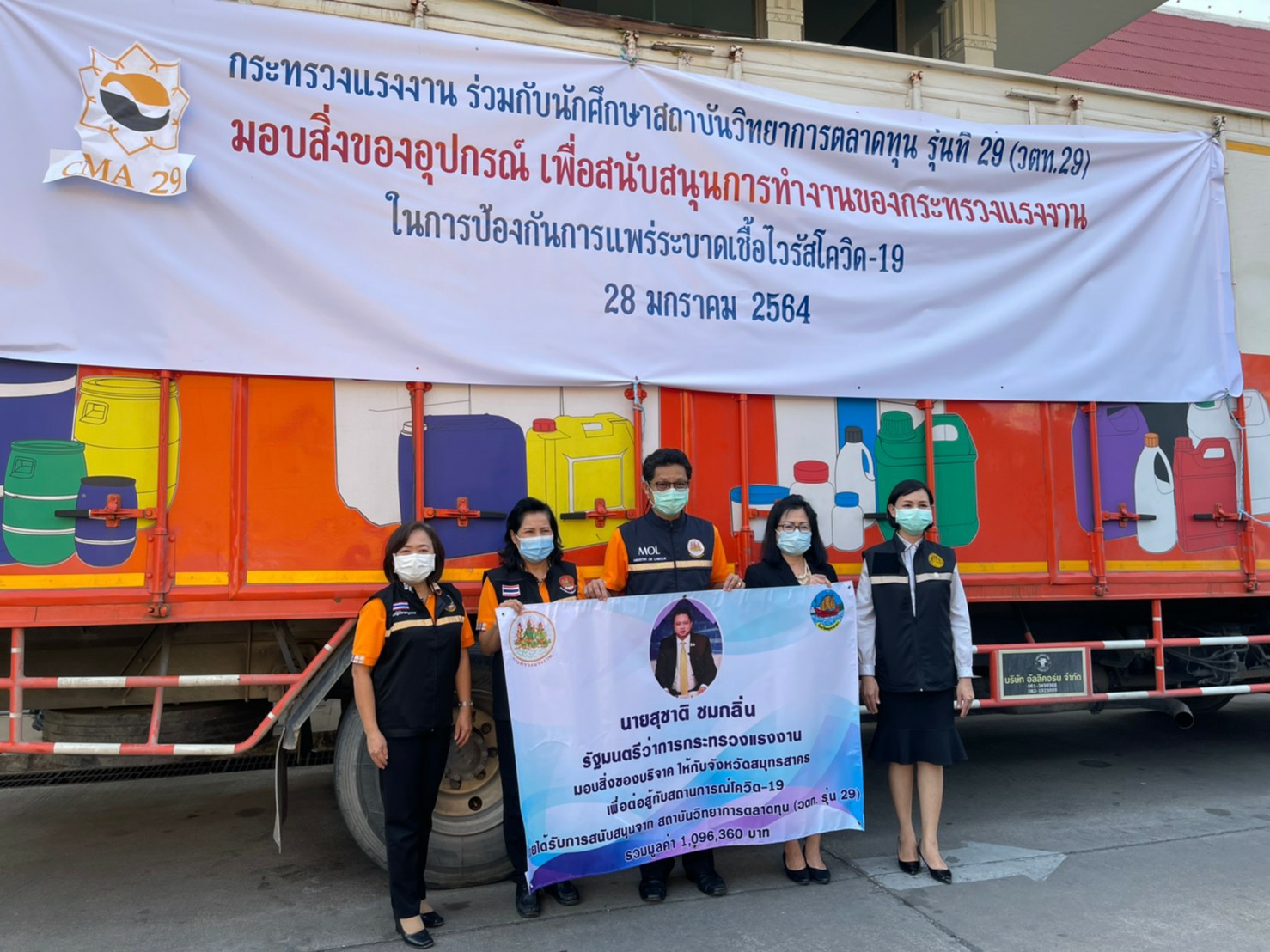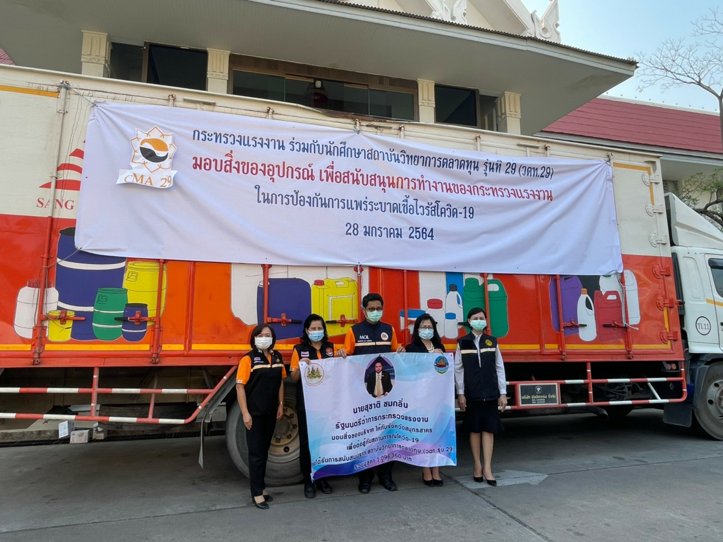 On January 28, 2021, Labour Minister Mr. Suchart Chomklin assigned the head of government agencies under the Ministry of Labour in Samut Sakhon province to bring supplies and equipment to prevent Covid-19. The supplies and equipment were sponsored by Mr. Sumeth Boonsamrasuk and the Capital Market Academy (CMA), Class 29. They gave the Ministry of Labour items to deliver to Samut Sakhon to support the fight against Covid-19. Deputy Governor of Samut Sakhon Mr. Thiraphat Khashmat and Chief of Samut Sakhon Provincial Office Mr. Wuttipong Suphakwanich, were the recipients.