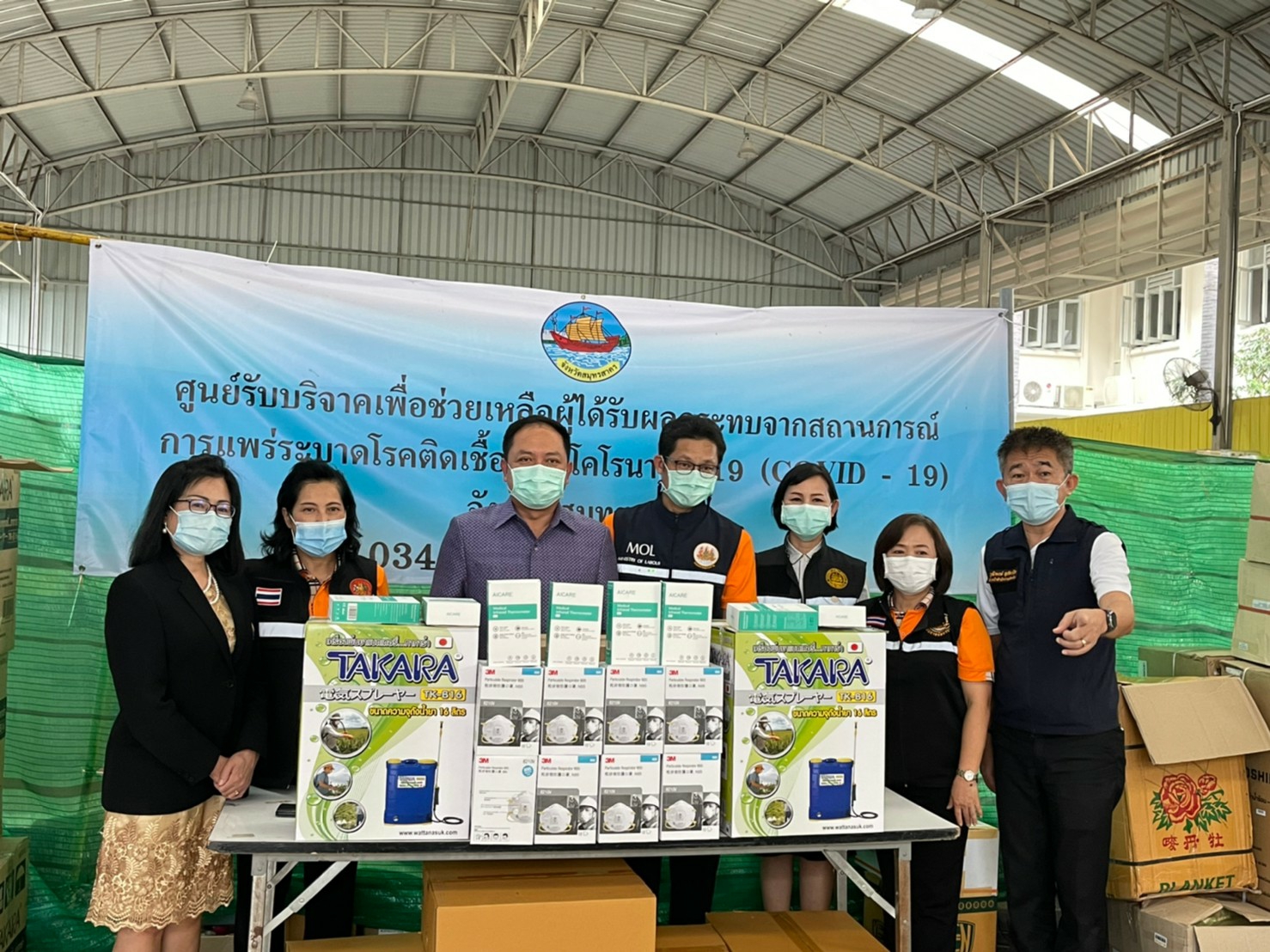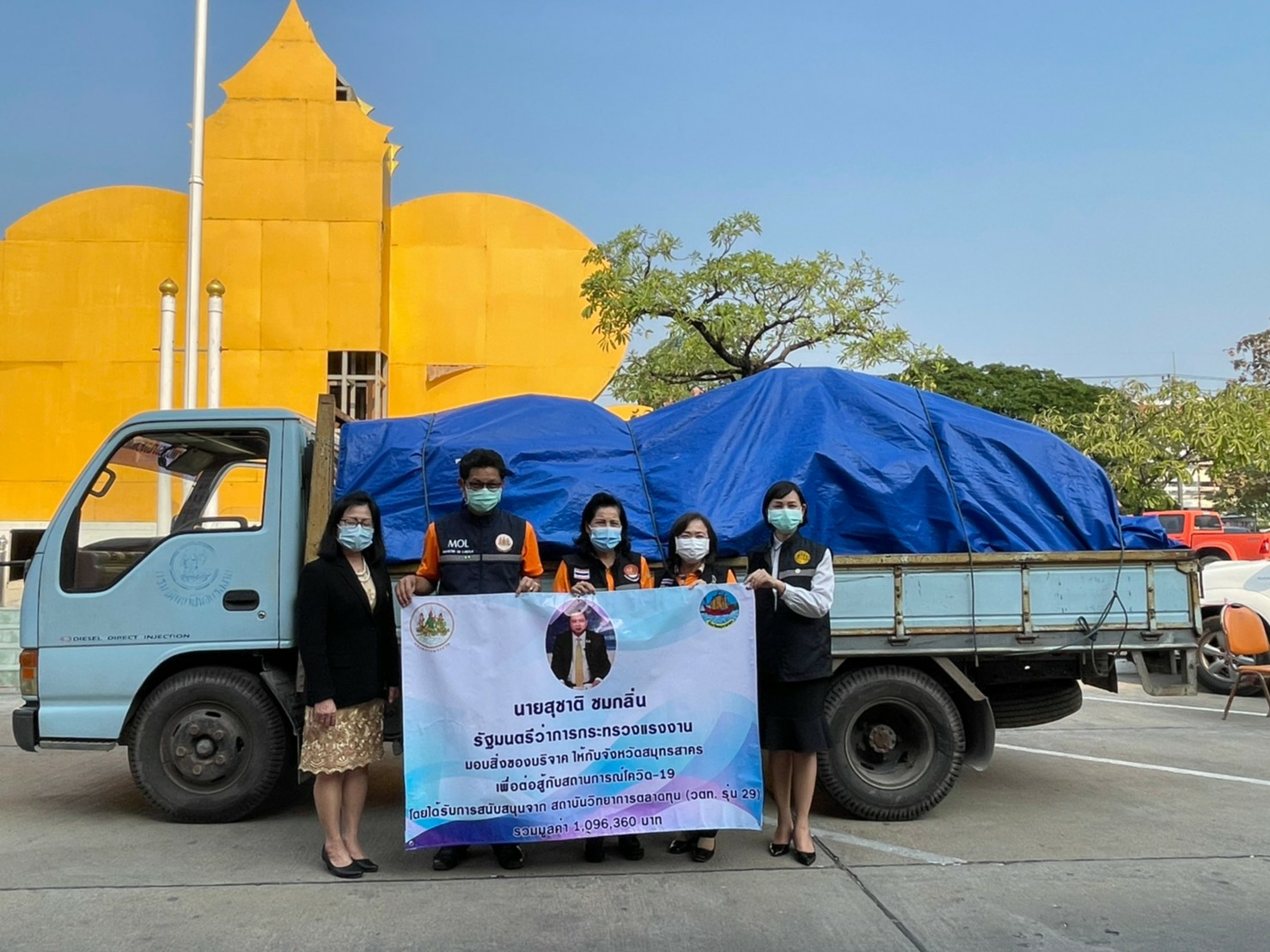 Labour Minister Mr. Suchart Chomklin assigned the head of government agencies under the Ministry of Labour in Samut Sakhon province to bring supplies and equipment to prevent Covid-19, sponsored by the Capital Market Academy (CMA), Class 29, to be donated to Samut Sakhon province. Deputy Governor of Samut Sakhon Mr. Thiraphat Khashmat and Chief of Samut Sakhon Provincial Office Mr. Wuttipong Suphakwanich received the supplies and equipment for use in the prevention of Covid-19 in Samut Sakhon.