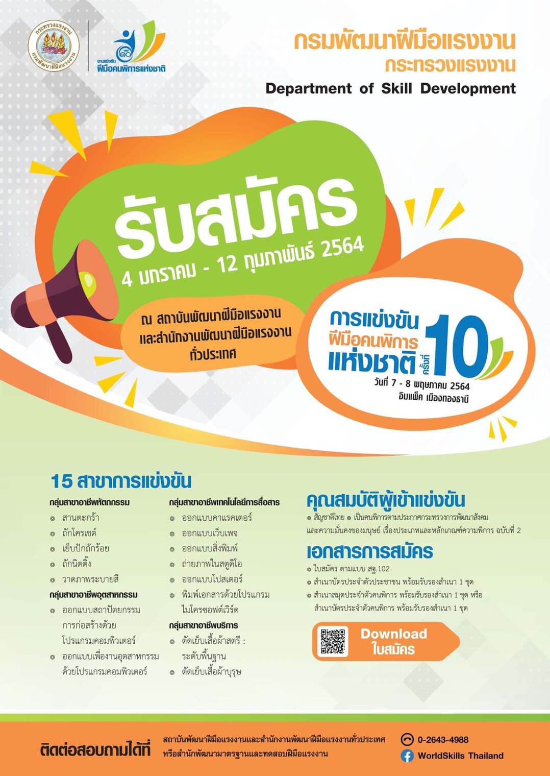 Prof. Narumon added that the Ministry of Labour’s Department of Skill Development (DSD) is the main unit in conjunction with agencies and organizations related to people with disabilities, in organizing the National Skill Competition for People with Disabilities. This time will be the 10th occasion the event is hosted, under the name “Abilympics Thailand 2021”. There are 15 competition categories consisting of 1. Handicrafts, namely, basket weaving, crochet, embroidery, knitting, drawing, and painting. 2. Communication technology, including character design, web page design, print design, studio photography, poster design, document printing using Microsoft Word. 3. Industrial professions such as design, architecture, and construction with computer programs and industrial work design using computer programs and 4. Service occupational groups, namely, basic level women and men’s wear sewing. The event will be open for applications from January 4, 2021 – February 12, 2021, at the Skill Development Institutes and the Skill Development Office in every province.